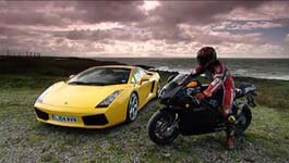 gul Lambourghini Gallardo med 5 liter V10 og 500 hk. Cyklen er en sort Ducati 999 med