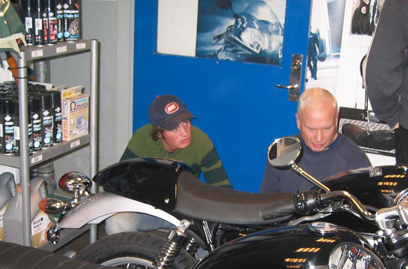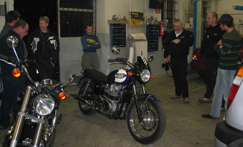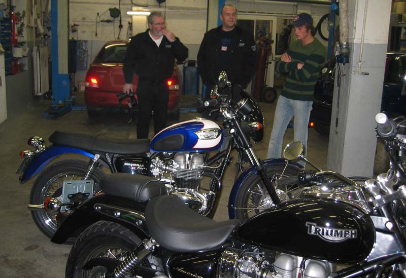 sku lige ud og køre med Bonnie T100 udenfor garaget. Inde i garaget fik vi demonstreret