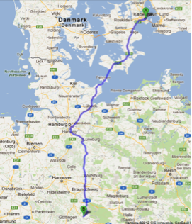 motorvej til Hamburg, og derefter på hovedvej tager det ca. 9 - 10 timer,
