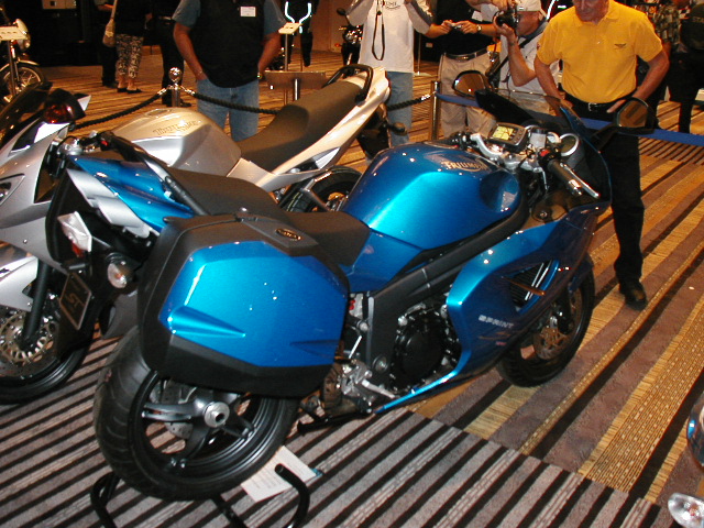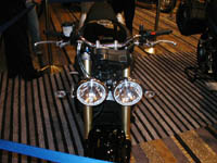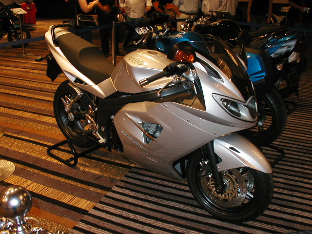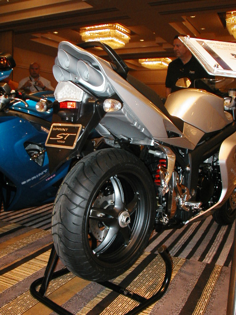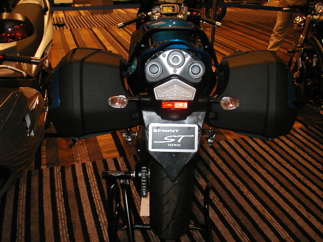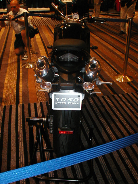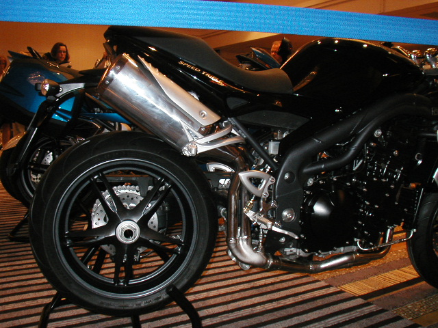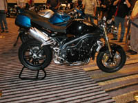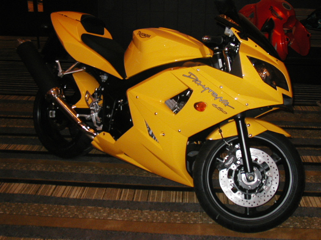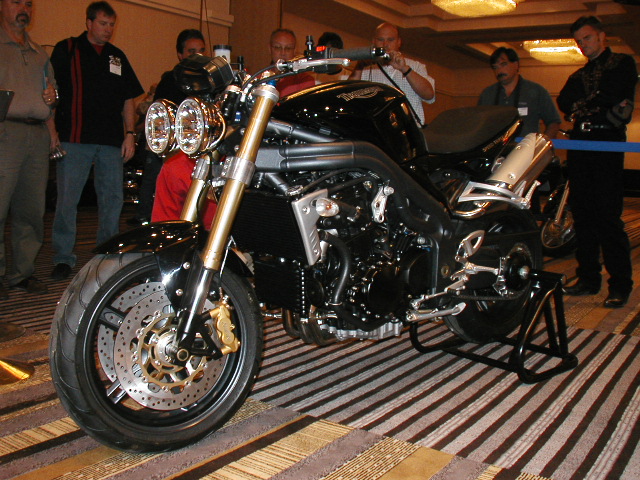 Ok, venner. Vi får nok officiel materiale og billeder fra Vagn og/eller Hans-Jørgen i slutningen af ugen. Og det kommer sikkert snart på Triumphs egen webside. Men hvorfor vente. Der er allerede sivet ud info ad andre kanaler om Triumphs nye 2005 modeller. (Tak til Per for hint.) Lad os nu se hvad vi har gravet frem... Speed Triple 2005: ny 1050cc motor, ny indsprøjtning, USD (Up Side Down) forgaffel, radielle bremser foran, justerbar koblingsgreb (endeligen), nye fælge (lettere), høj dobbeltsidet udstødning (nok for tyk i standardudgave), nye instrumenter (meget pæne), LED baglys, og en bagende lige til at klippe af hjemme i garagen, og jeg gætter på en smule lavere vægt (lettere fælge, tank og bagdel men tungere potter). Sprint ST 2005: 1050cc, underseat udstødning med 3 åbninger, 3 projektorlysen foran, blinker foran integrerede i bakspejlene, nye instrumenter, ny ramme, nye dæmpere rundt om, nyt taskesystem (meget stort). Daytona 650: motor boret op til 650cc.