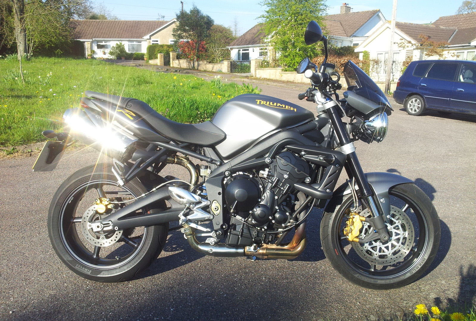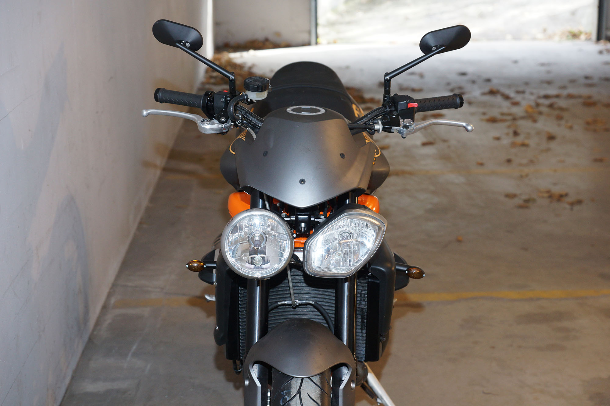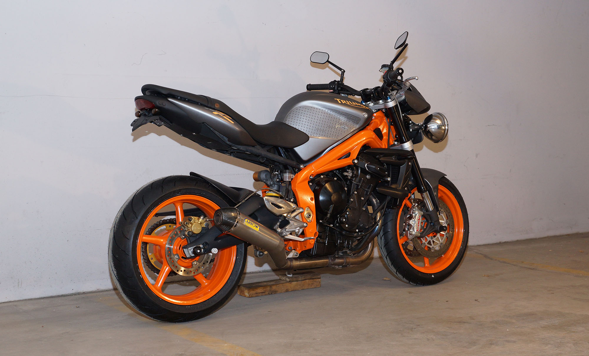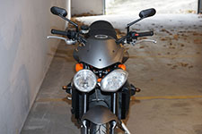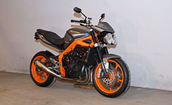 Her er starten. En normal grå og sort Street Triple R fra 2008, 675 cc, standard potter,
