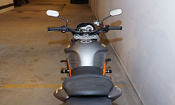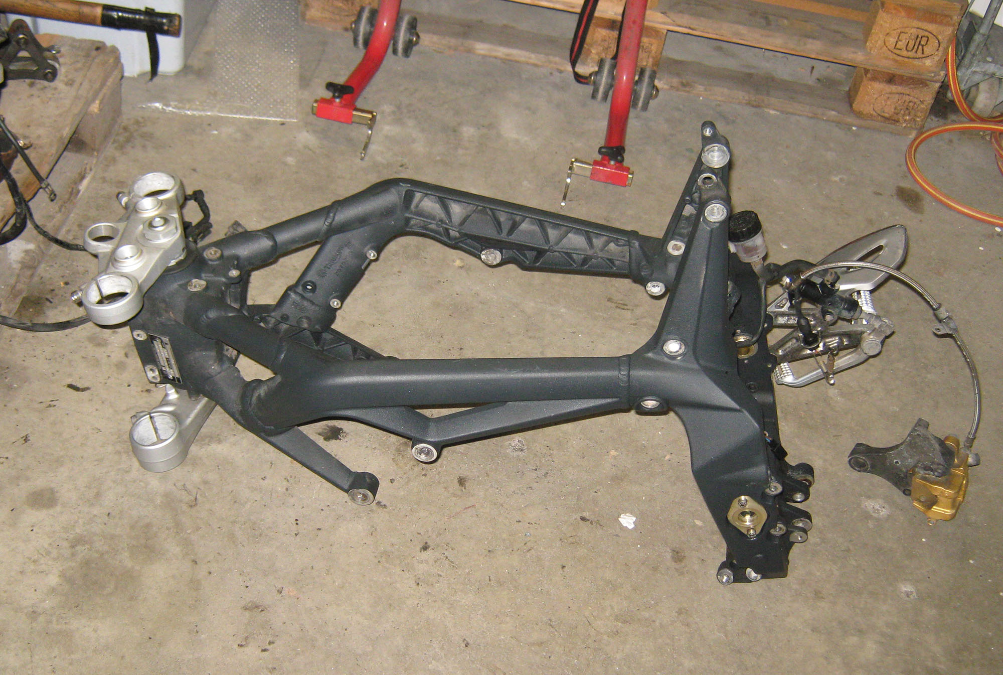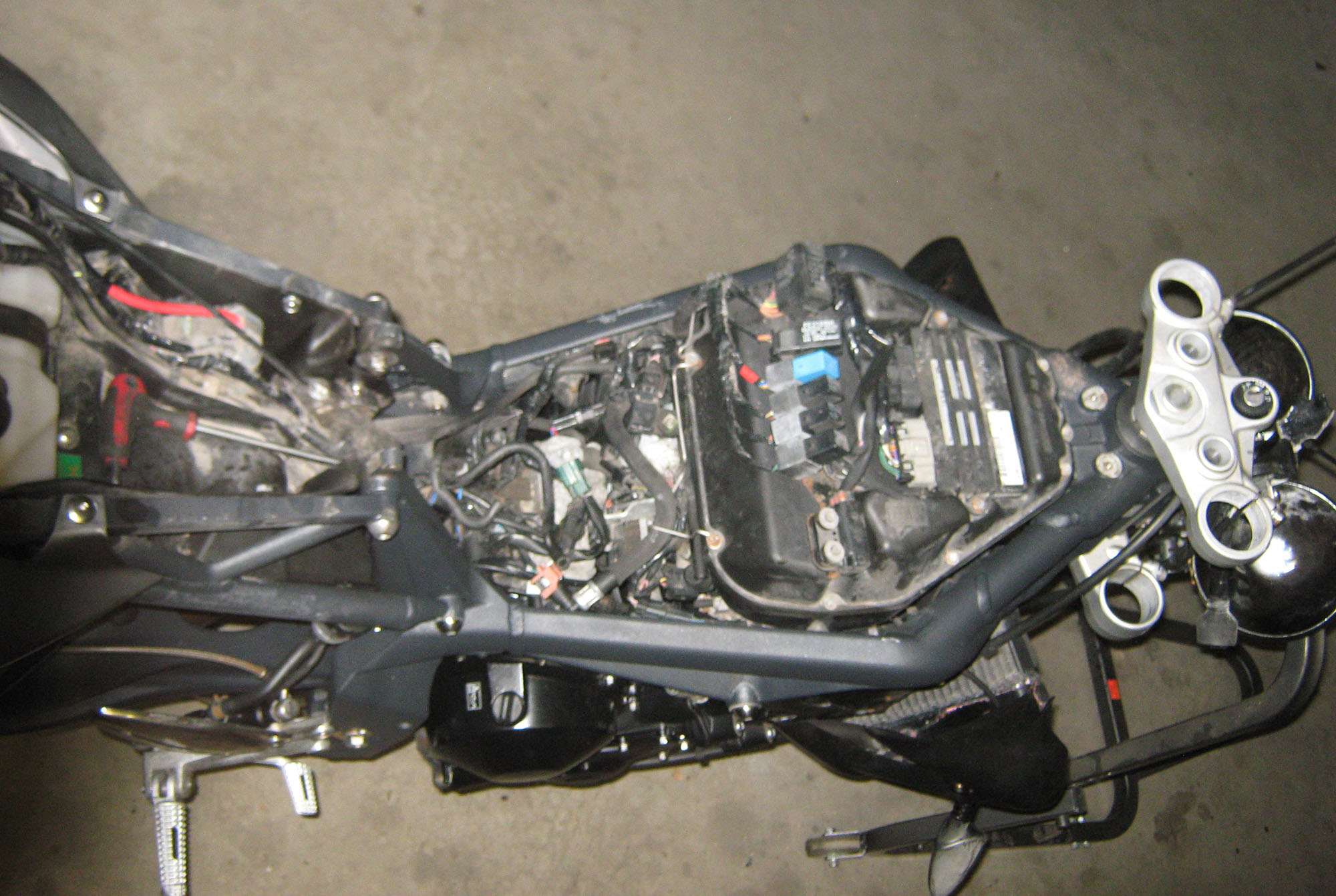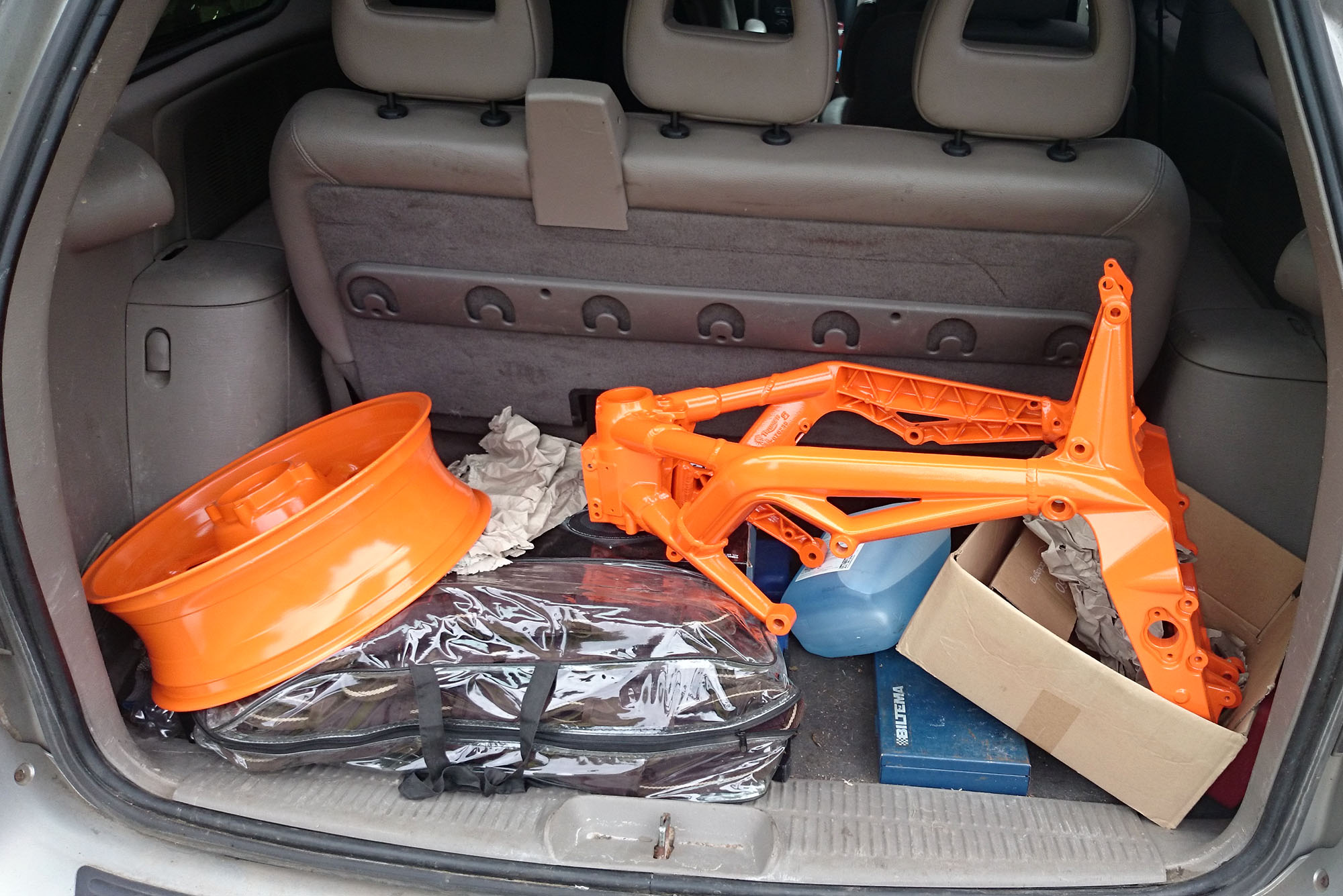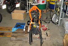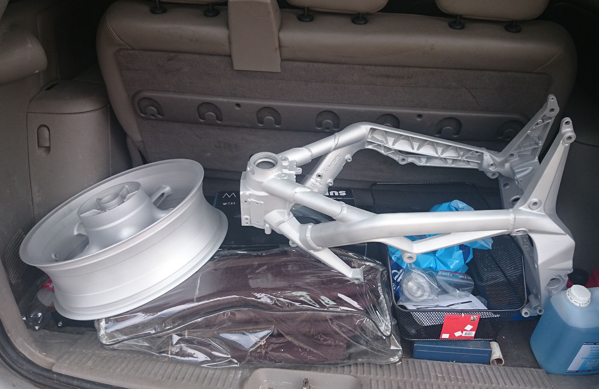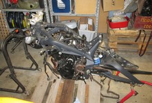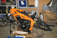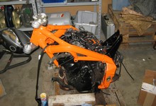 Hjulen er af, forgaffeln er af, bremserne er af, bagrammen er af, tanken er af.