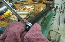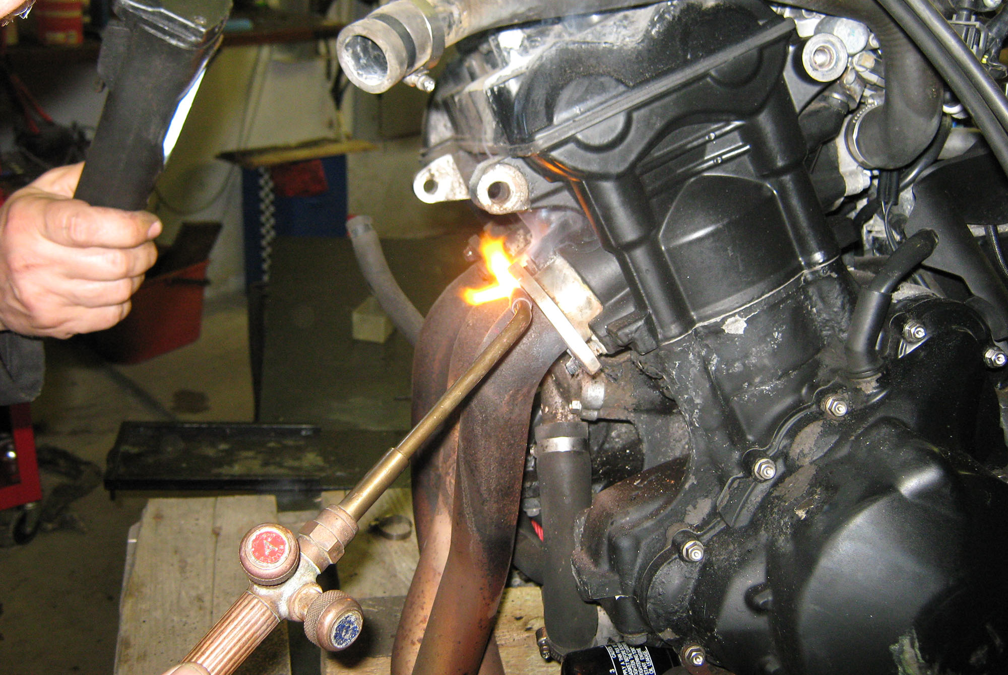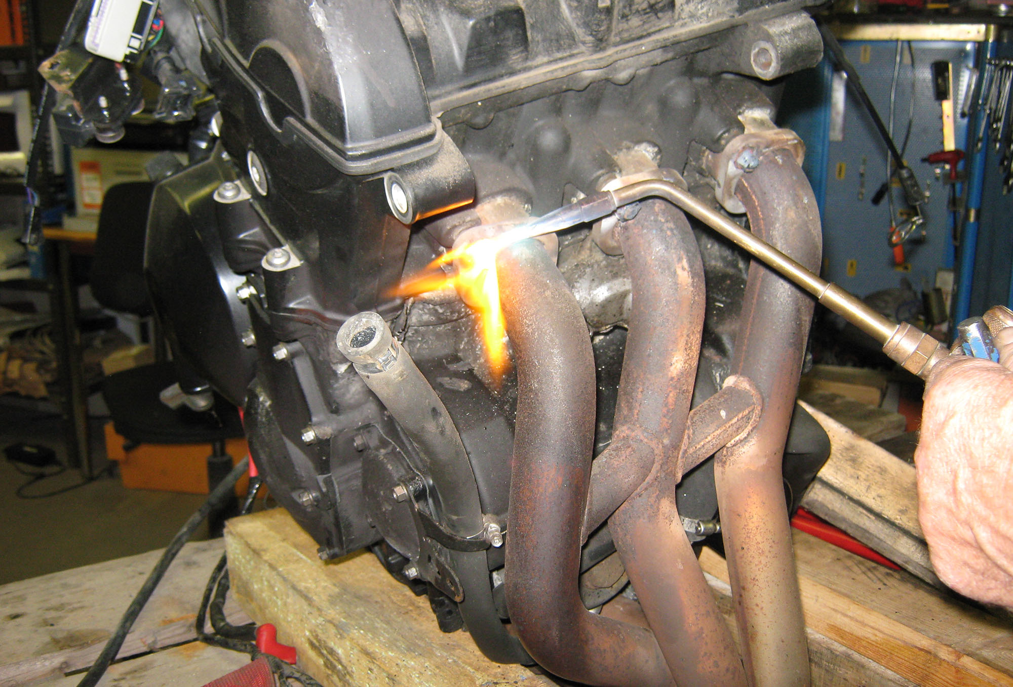 Får hjælp af Karl at svejse over og fjerne udstødningsmutrikerne der er rustet