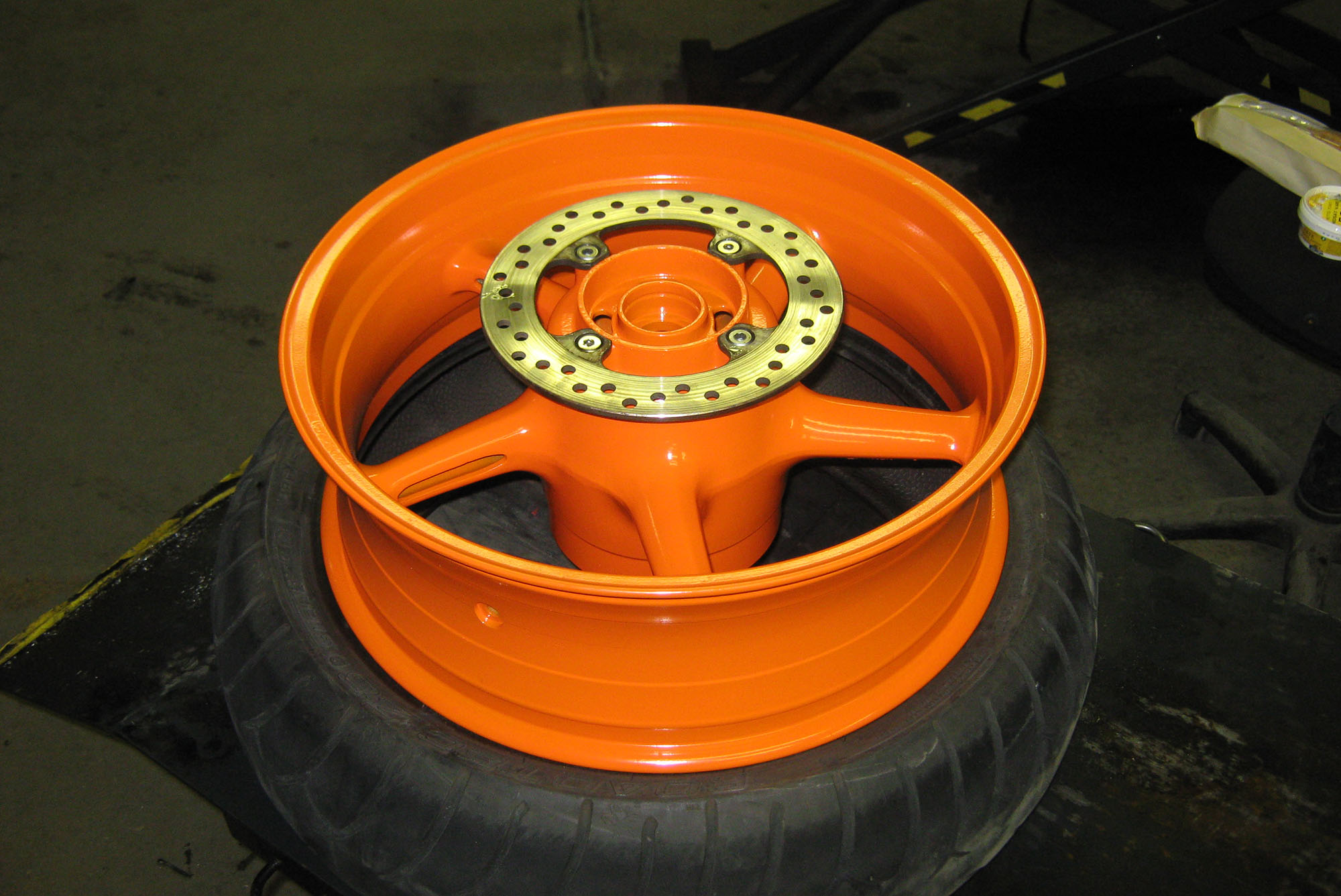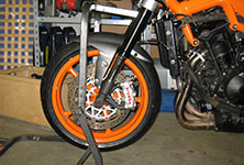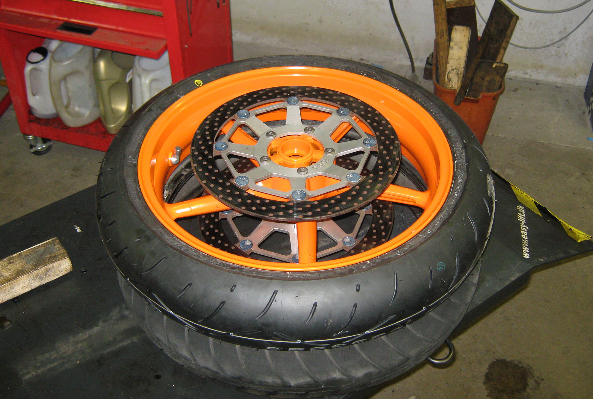 Hjemme i værkstedet hos MC-Doktorn. Dæk og bremseskiver monteres.