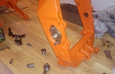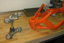 Rammen er skildt fra motorn. Hjulens pakninger, lejr og afstandstykker skal fjernes