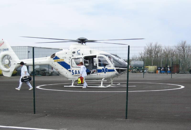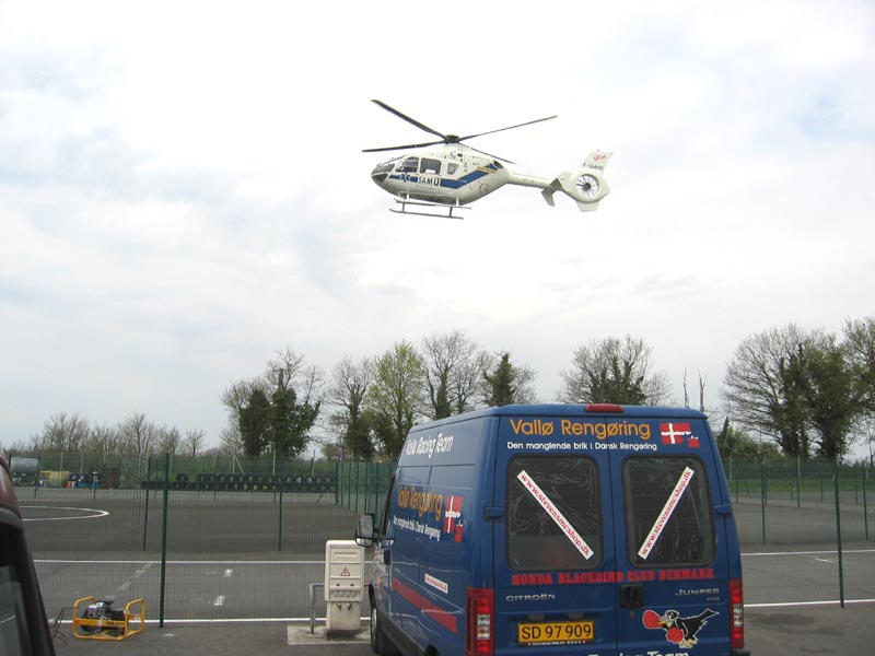 lårbenet. Der kommer en helikopter for at hente to mand til røntgen og behandling på