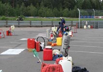 slicksdæk, værktøj, ur, branddragter, benzin, tankanlæg, støtter, dækvarmere, bord, stole,
