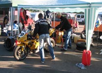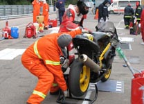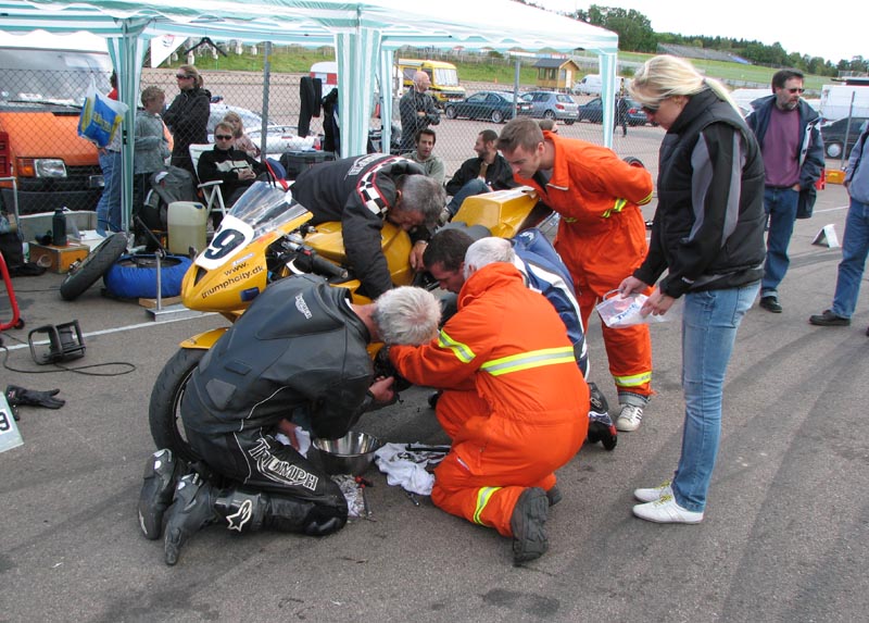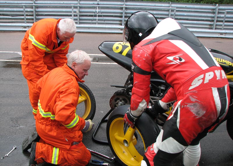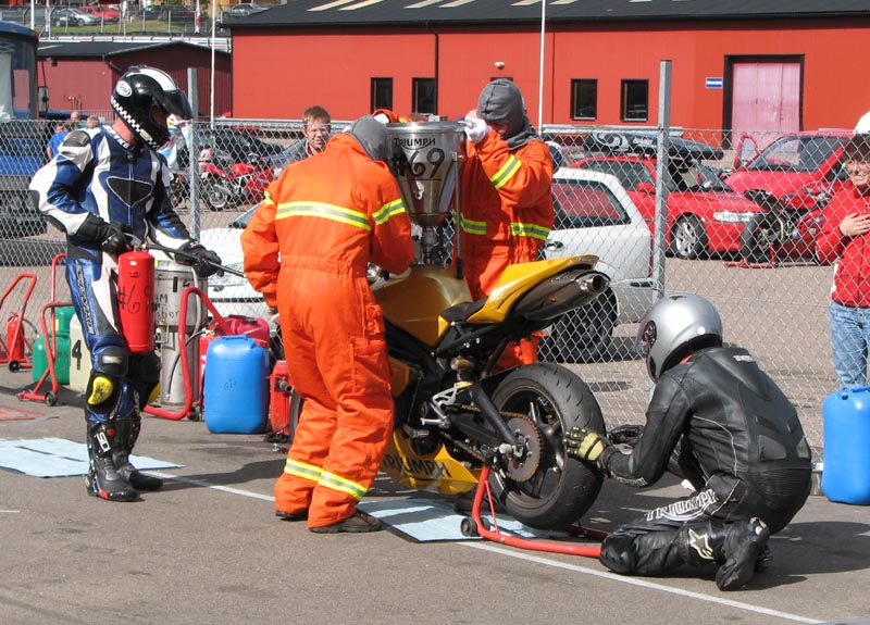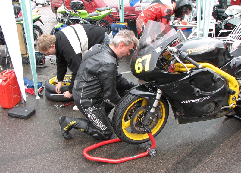 Bjørn kommer ind i pit, og vi starter med at skifet hjul. John ansvarer for baghjulet