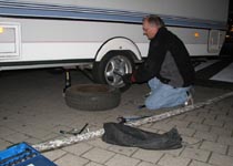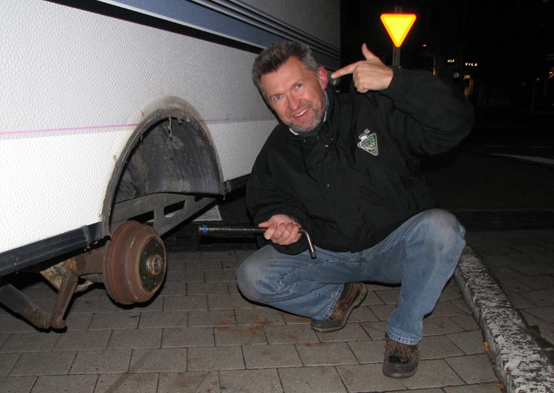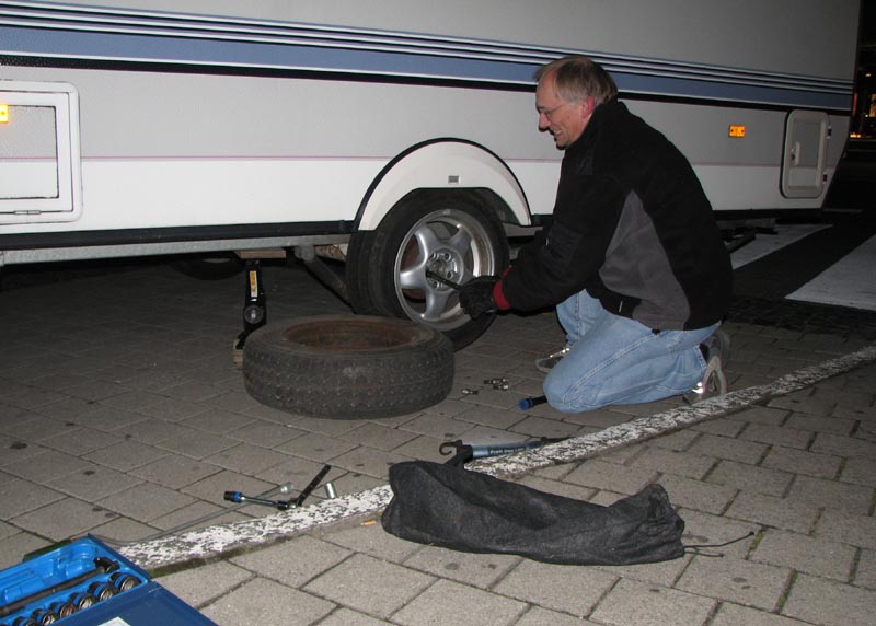 Selvfølgelig var der ikke et reservhjul i campingvognen.