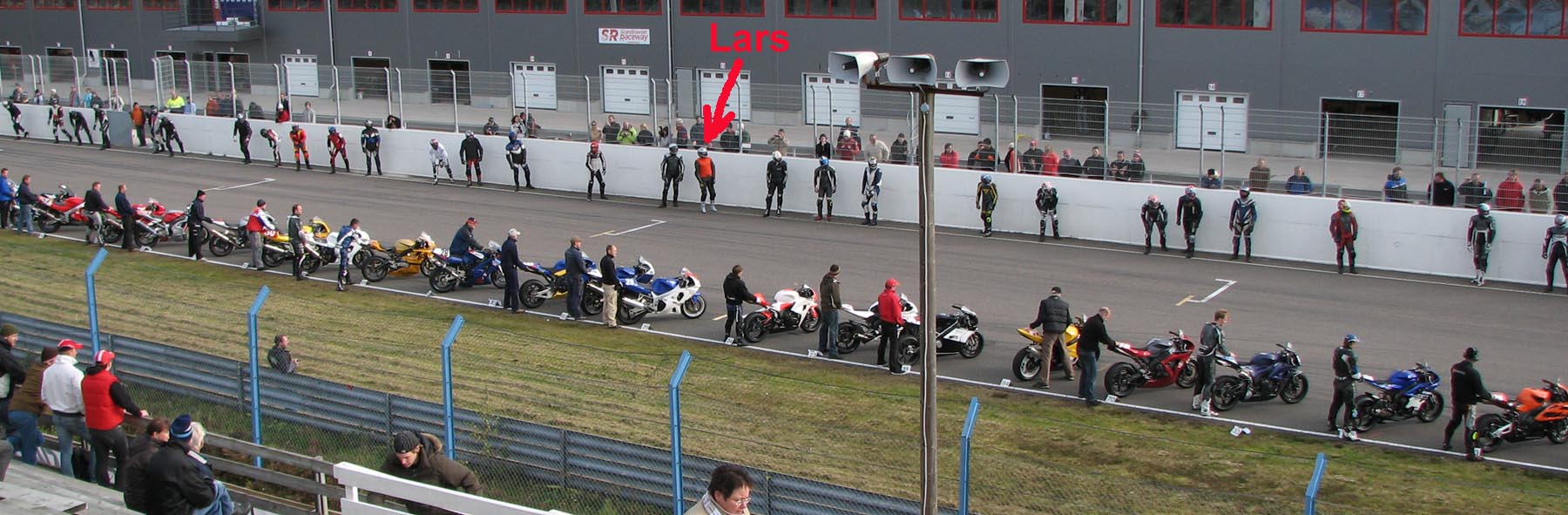 på den ene siden af banen medens førerne stiller op på den anden siden af banen.