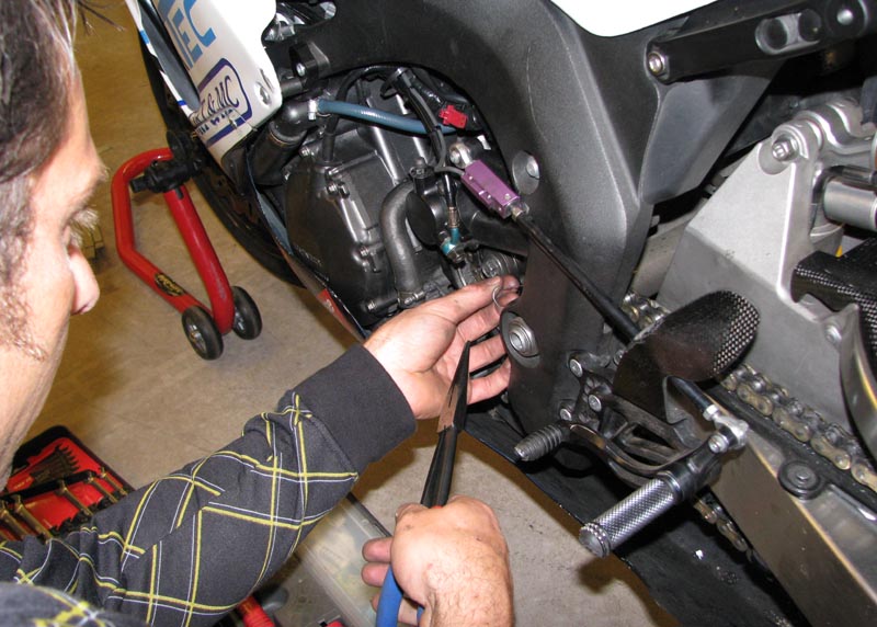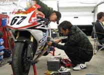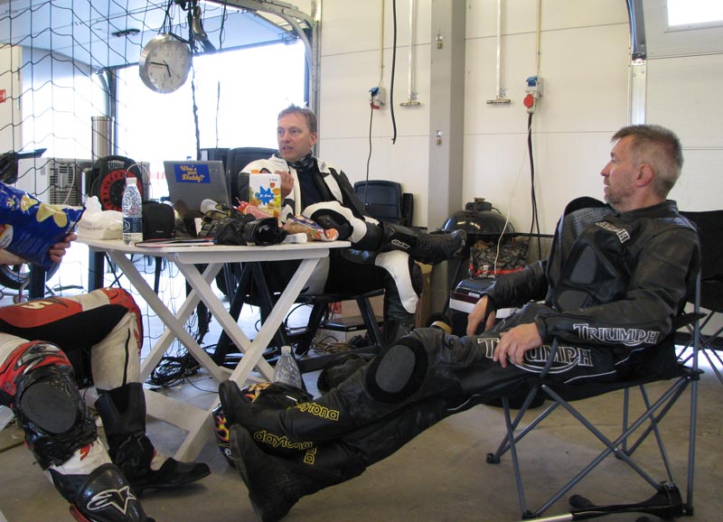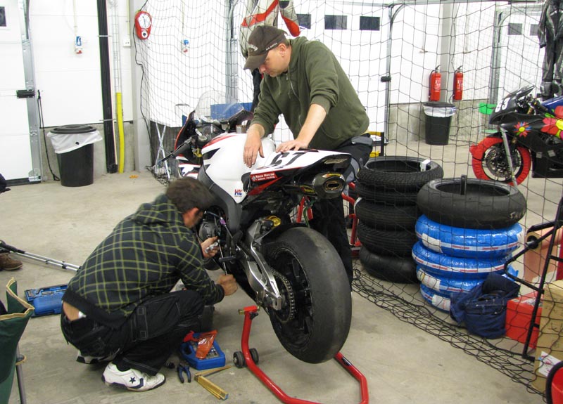 I pausen skifter vi til friske dæk og nye bremseklodser. Checker oljen og fylder