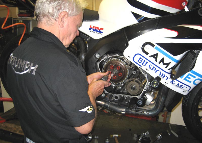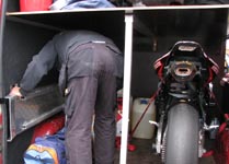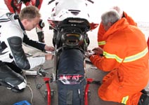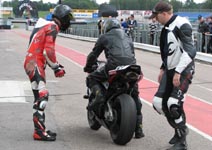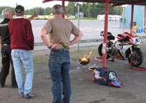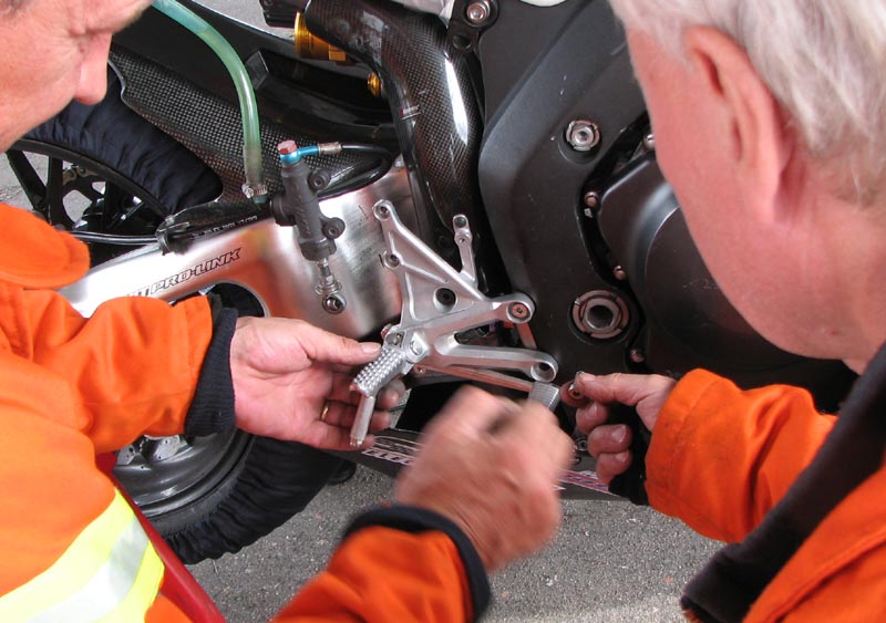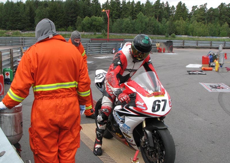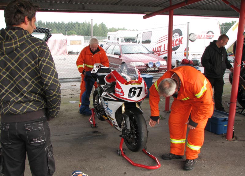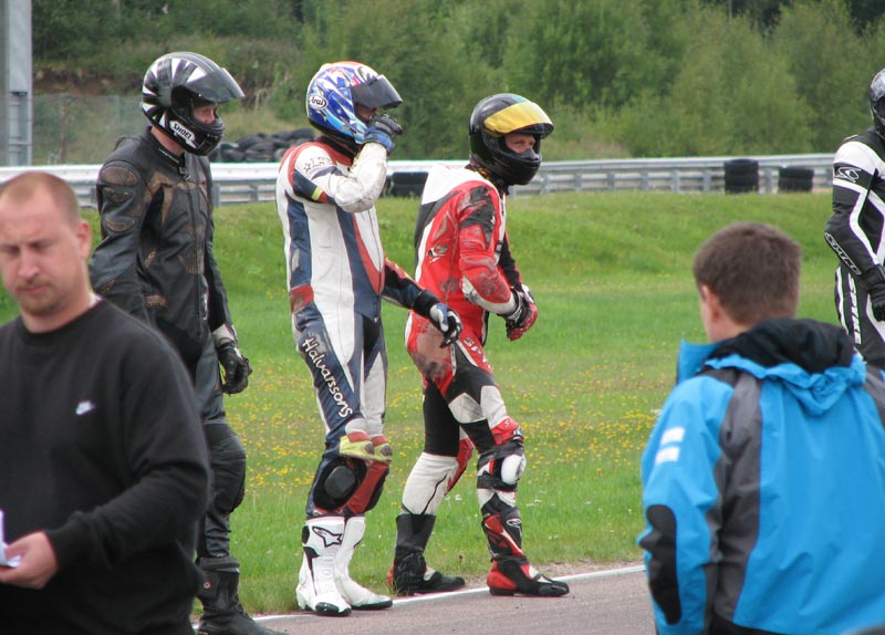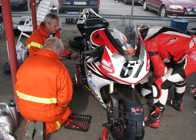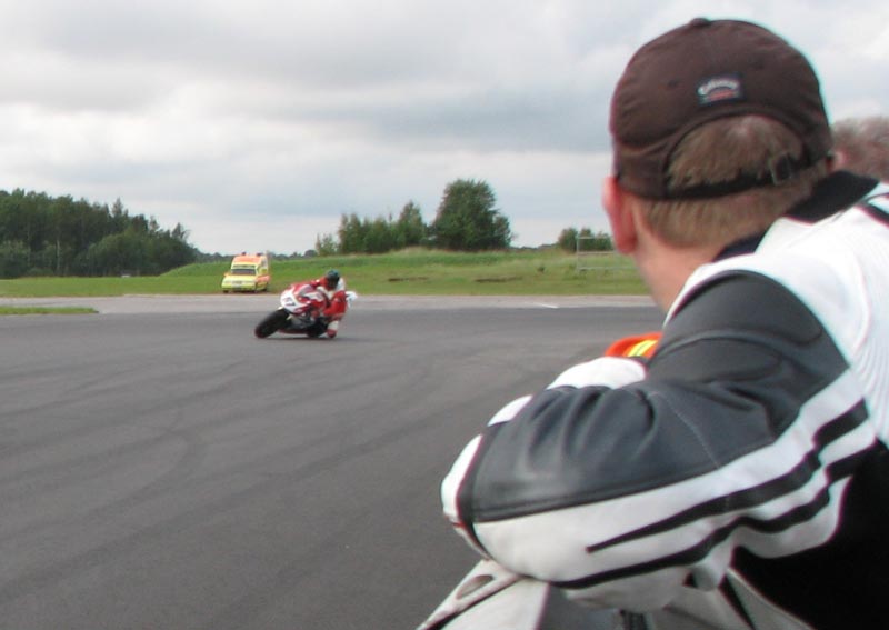 Imens kikker teamet på skaderne på motorcyklen. Den har smidt mig på vej ud på den brede langside,