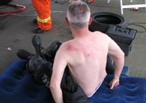 Jeg bliver kørt af banen i ambulancen til sygehytten. Der bliver jeg pakket ud og checket