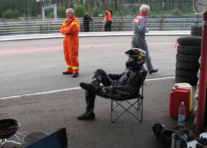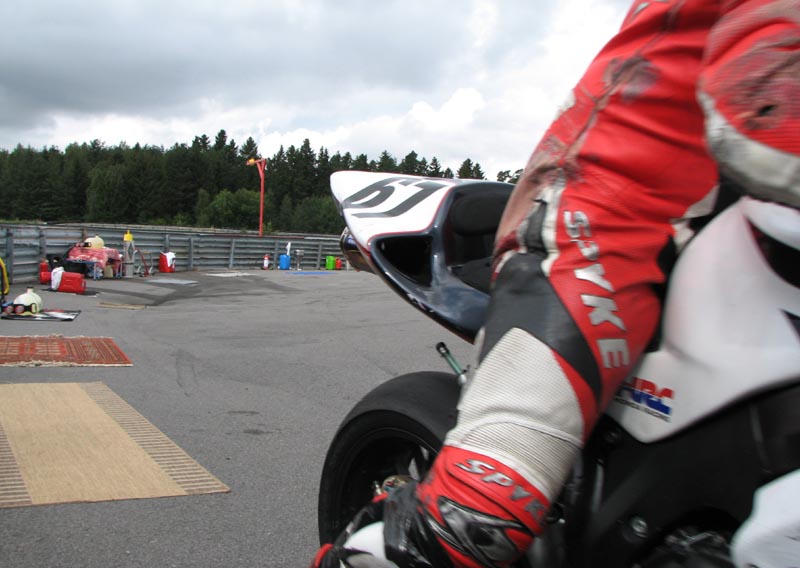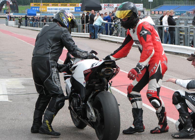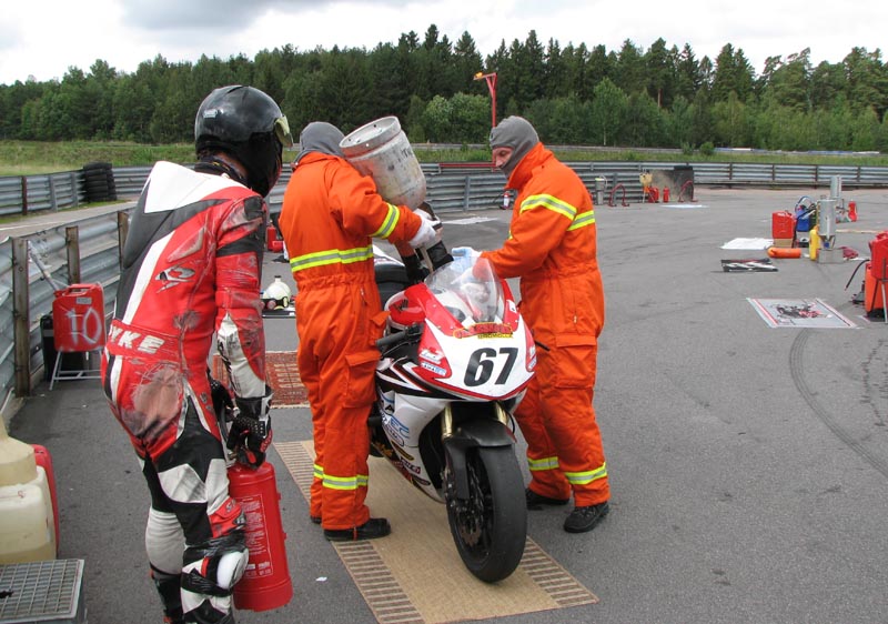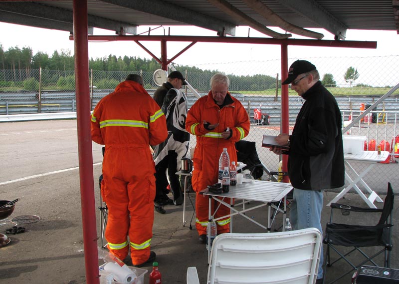 ud fra tankdepået og til vore pit hvor vi skifter kører. Jeg checker dækken, kommer op på