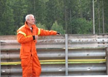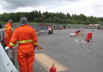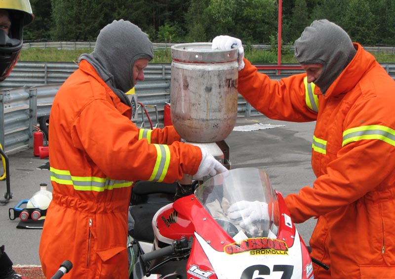 på bensinmængden, Michael holder brandslukkeren enligt reglerne.