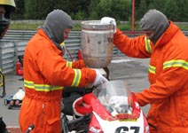 Banen må lukkes og alle team sendes ud for at hælde grus og feje oljen af banen. Saneringen tager