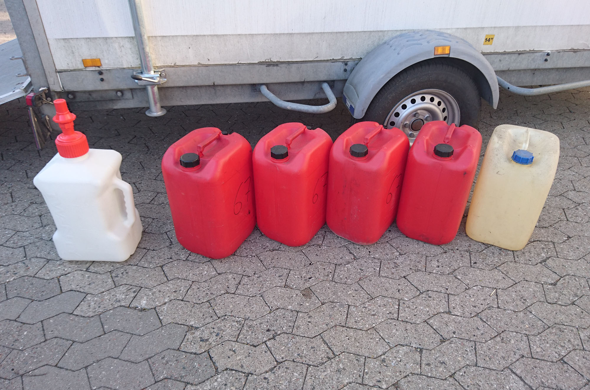 Tankudstyr og bensindunker. På 6 timer vil vi nok bruge 100-120 liter bensin og tanke 5-6 gange.