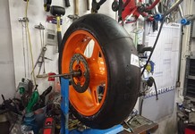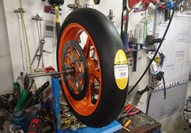 Prøven gik godt. Cyklen kommer ind i vores pit-boks. Vi skifer hjul så at vi kan starte