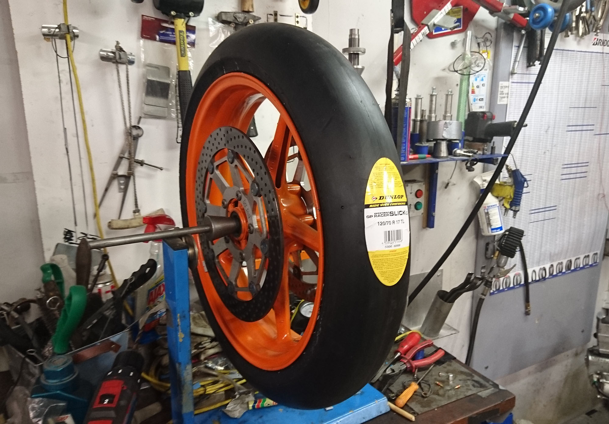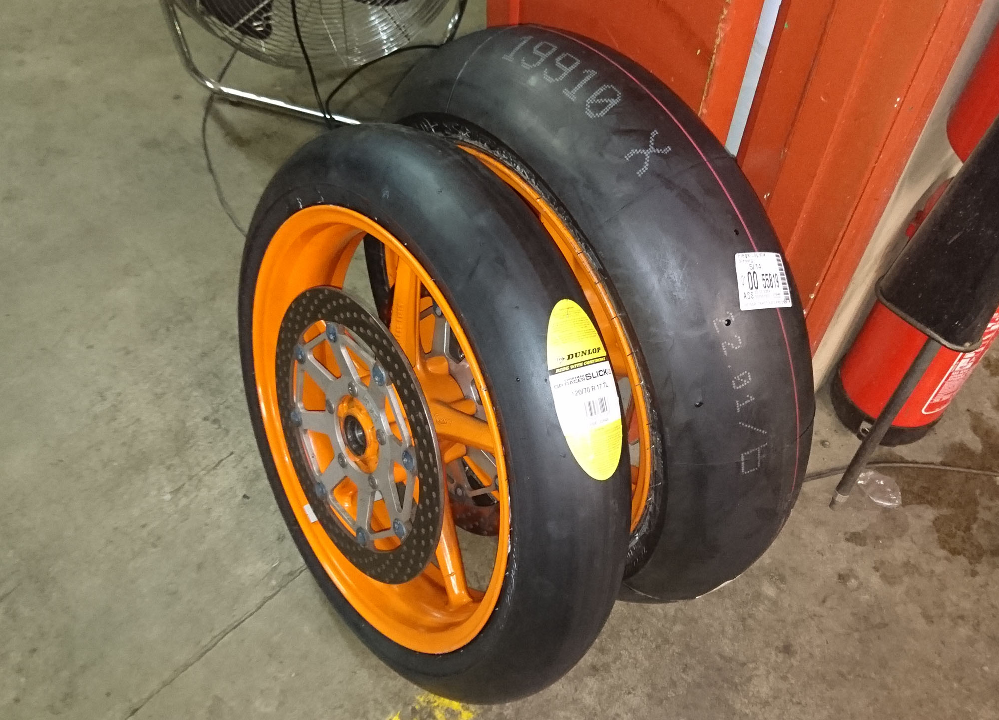 Så fik jeg slicks dæk ind ad døren. Dunlop medium foran, og Pirelli Pro Endurance bag.