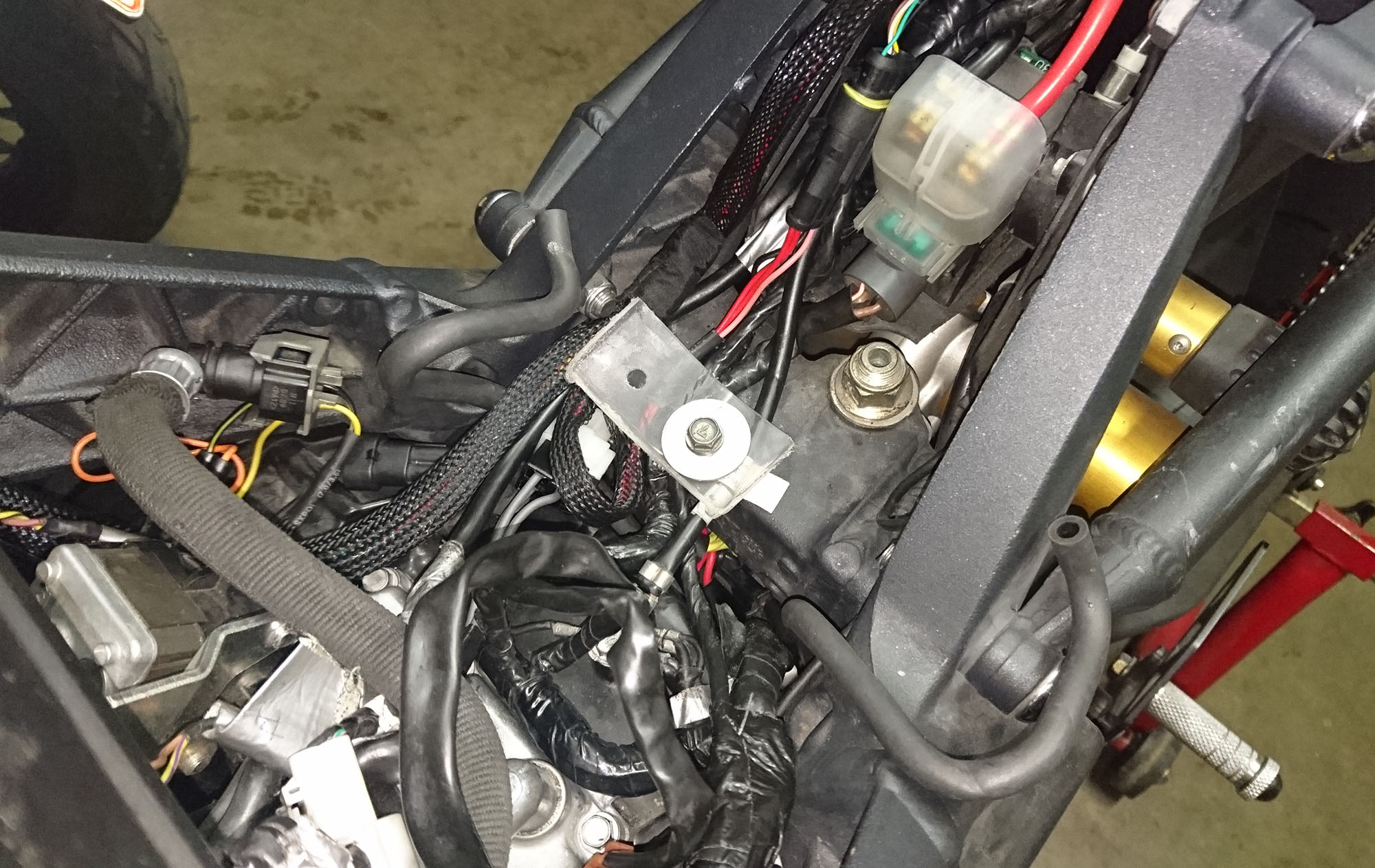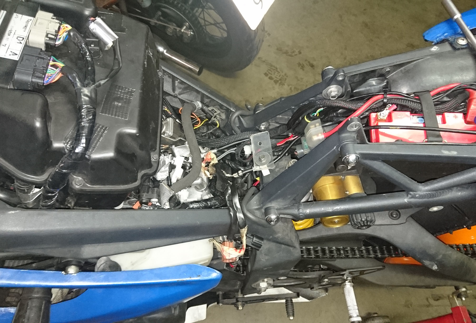 Hjem til garaget og splitte MC ad. Sammenligne el-ledninger med en anden Triumph 675, kikke