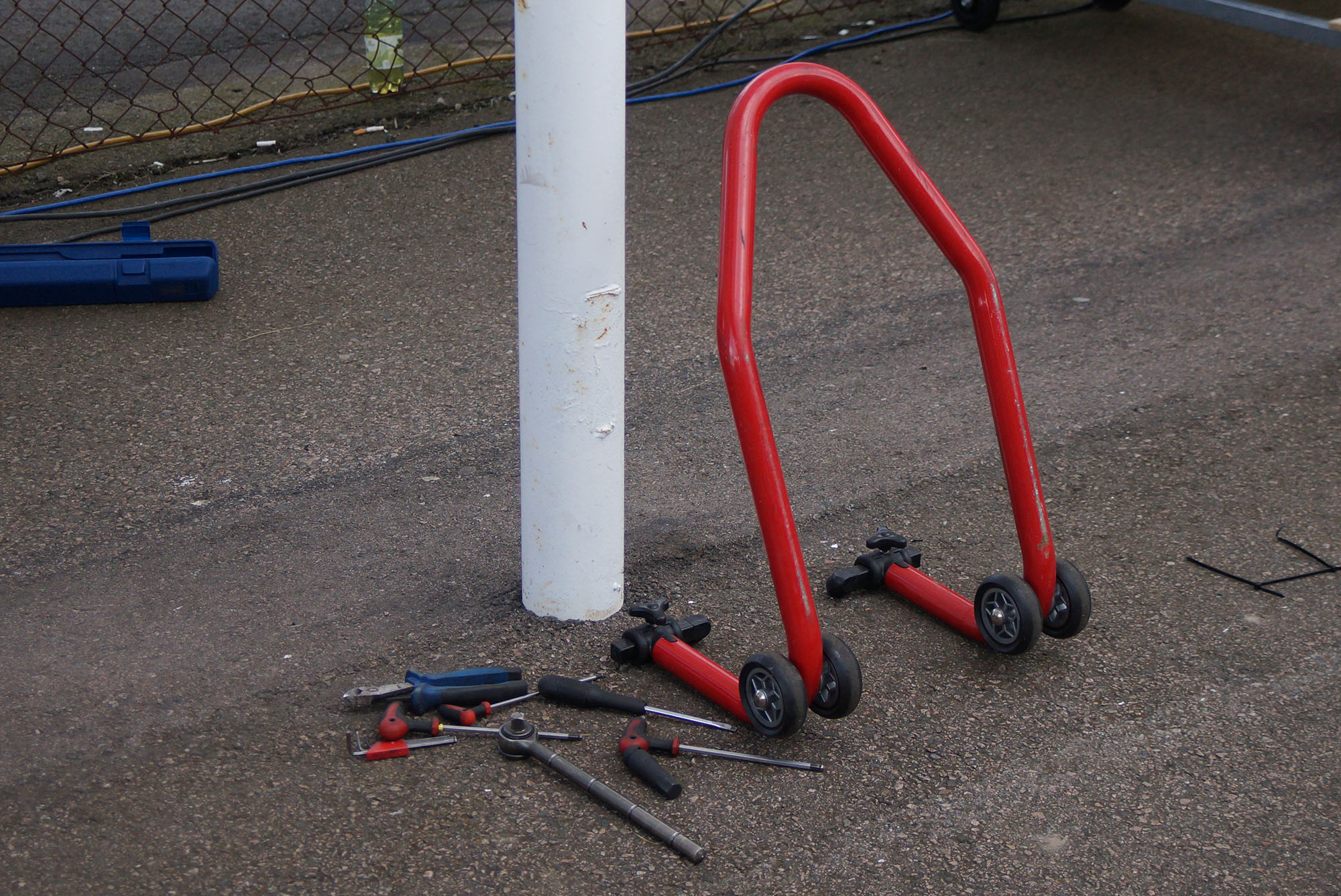 Det regner om morgenen, så at warm up og kvalifikation må køres i regn. Uha, jeg har et ekstra baghjul