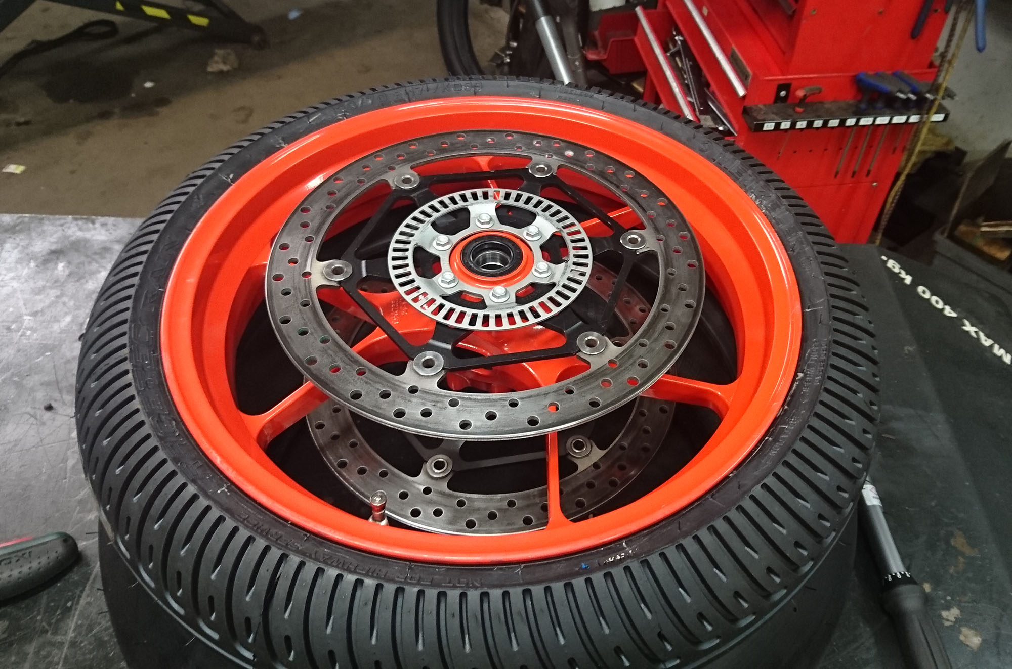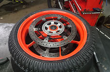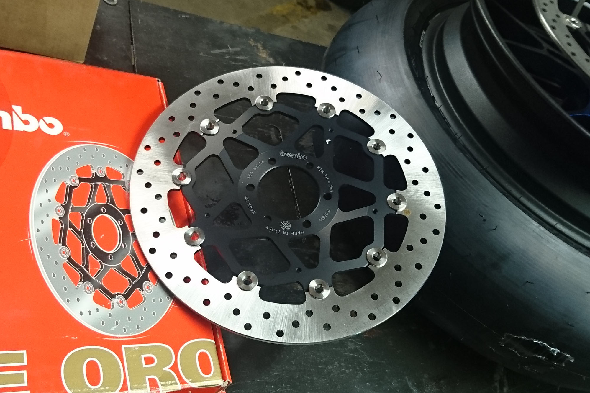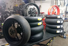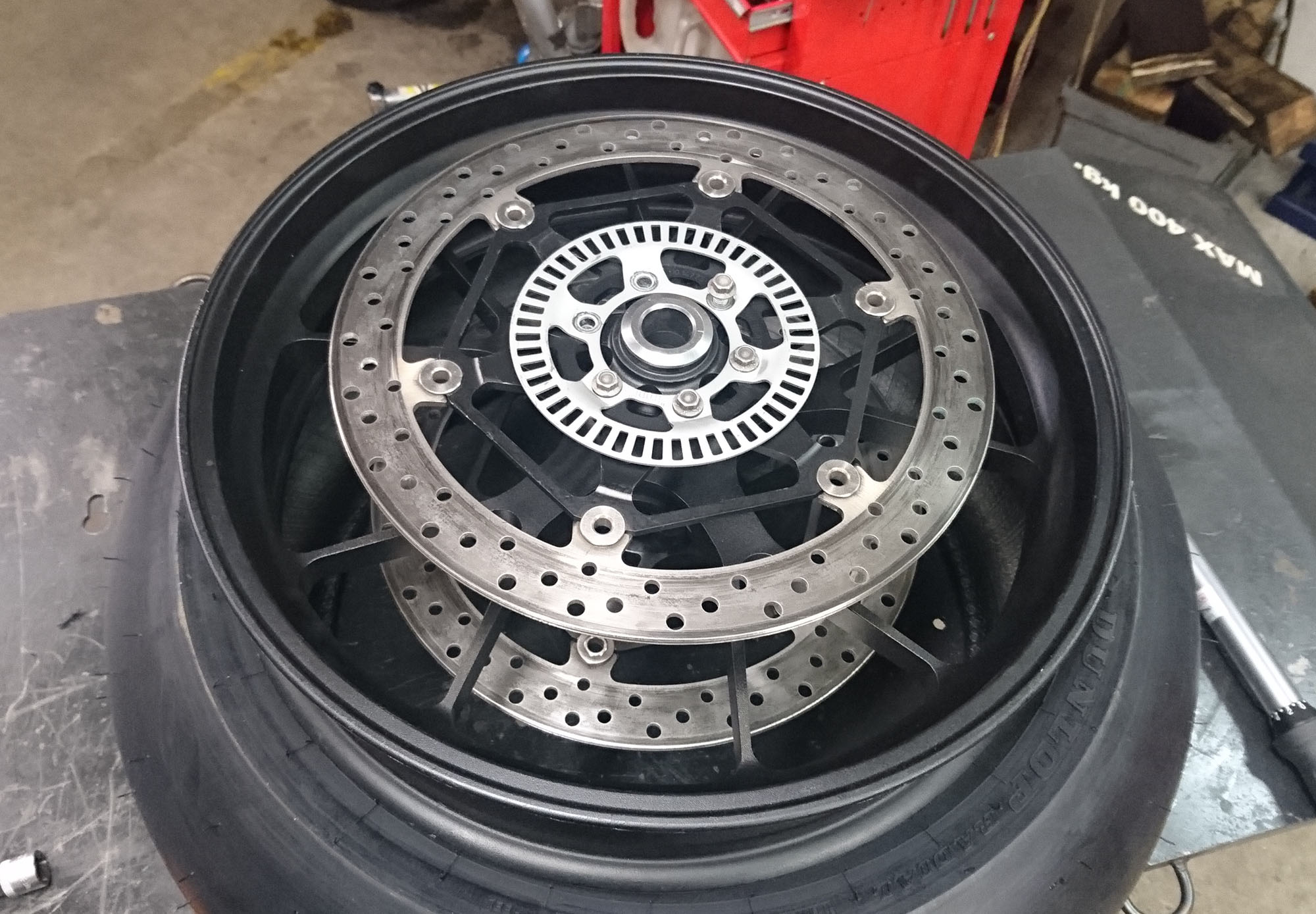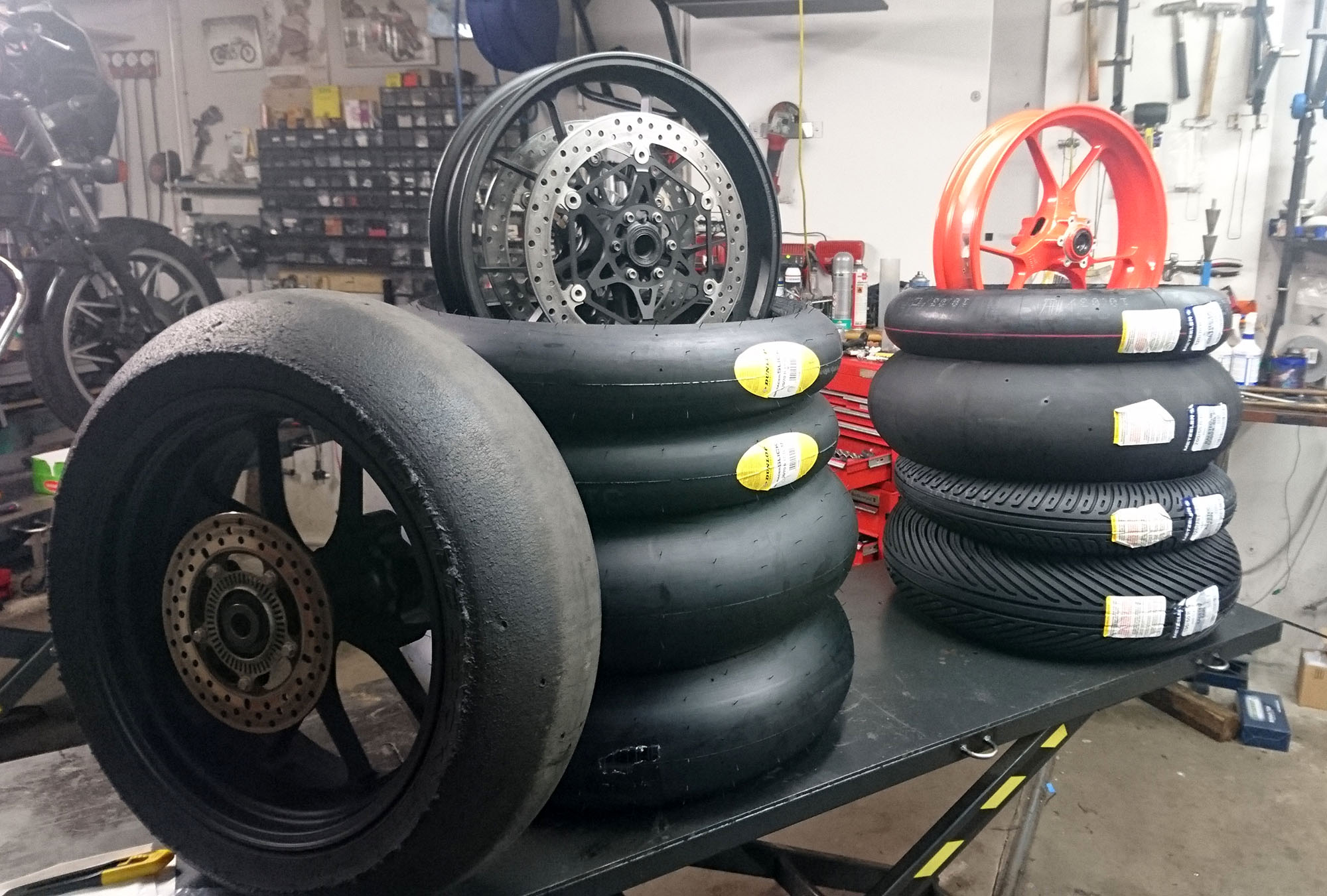 Så var der lidt arbejde i garaget. Vi fik leveret slicks dæk og regn dæk, og de sku monteres.