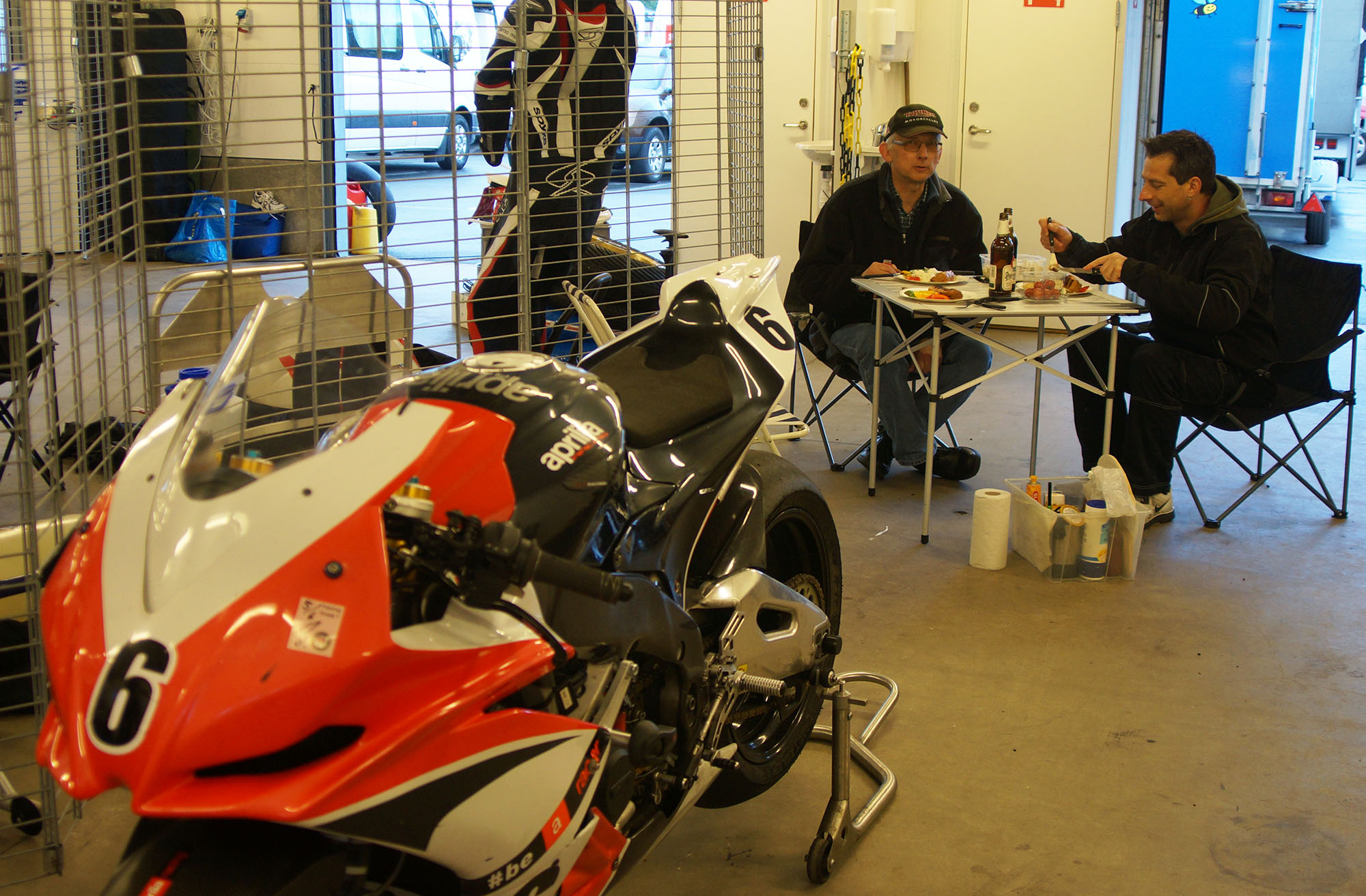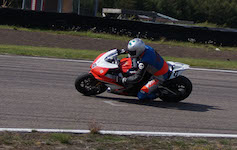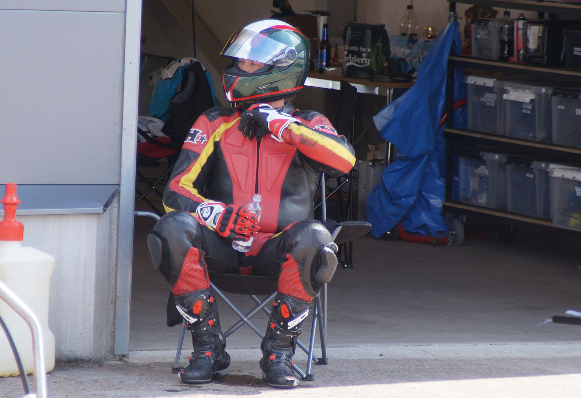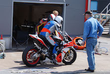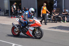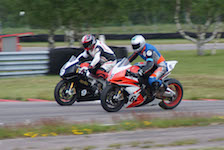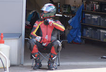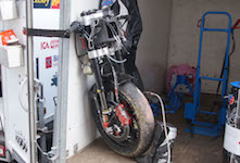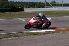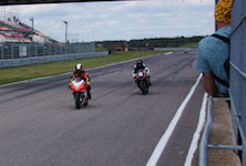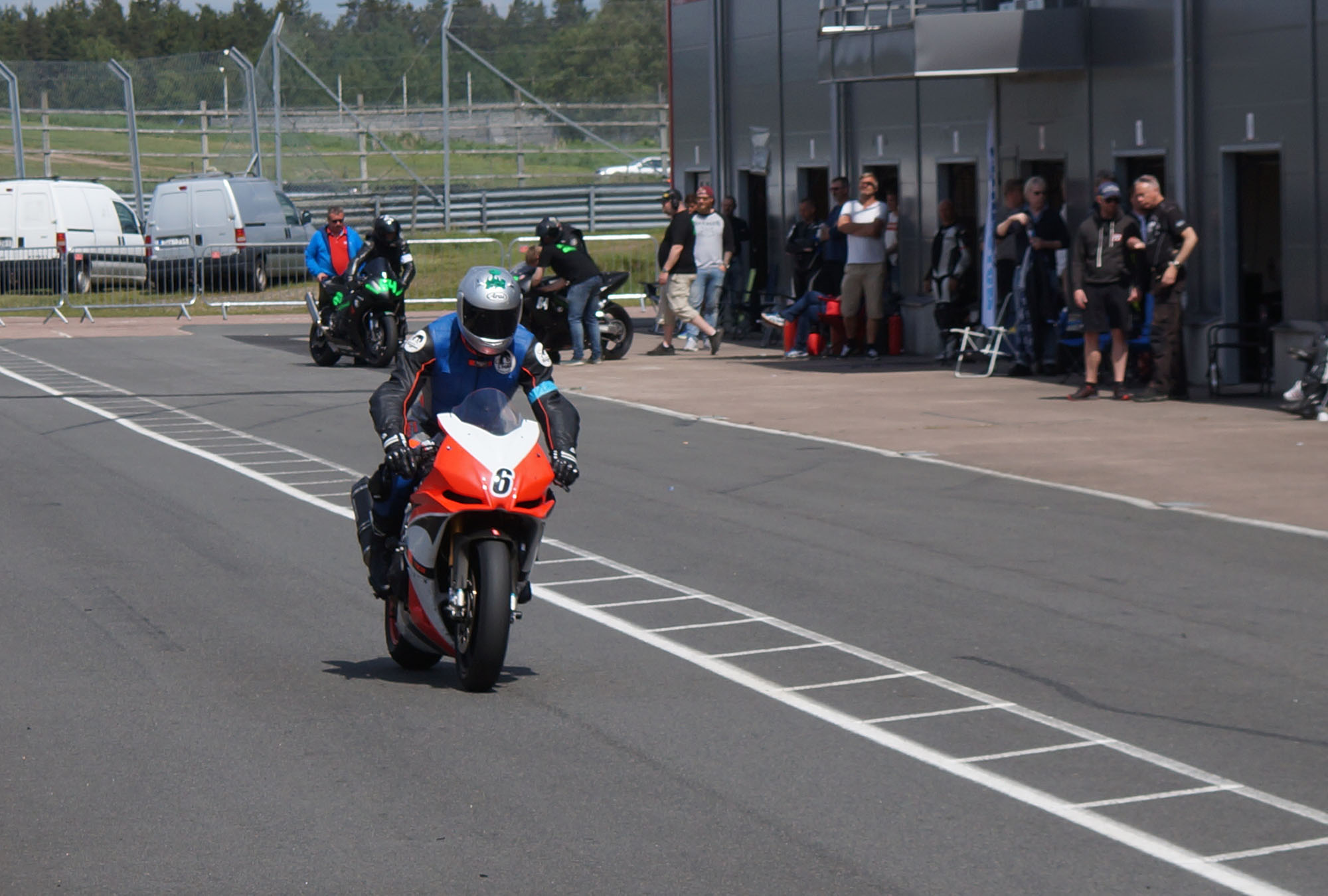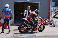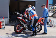 kommer ind i pit. Vi tanker motorcyklen, skifter kører, og sender Björn ud på banen.