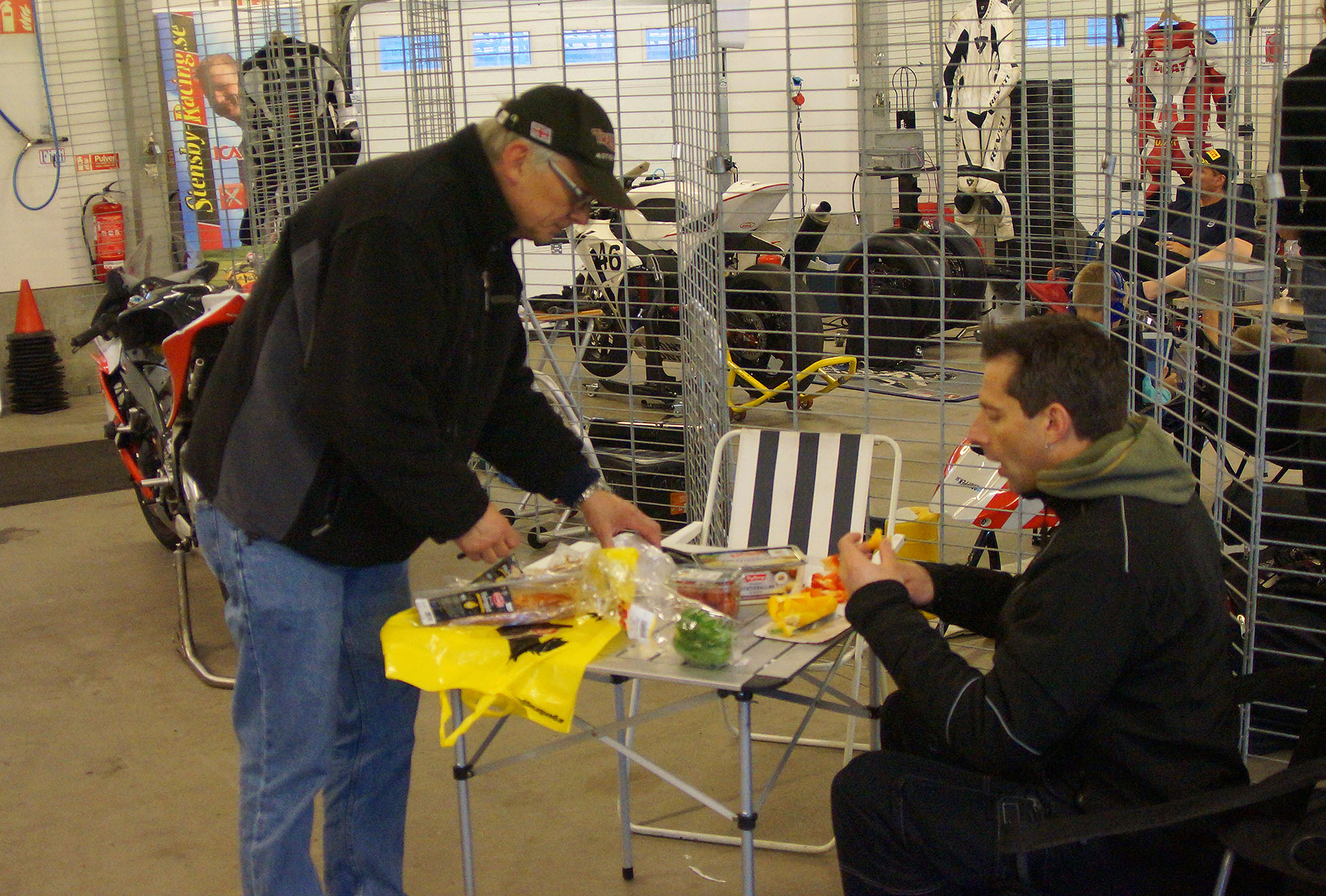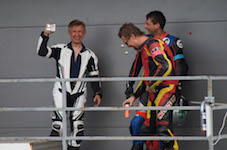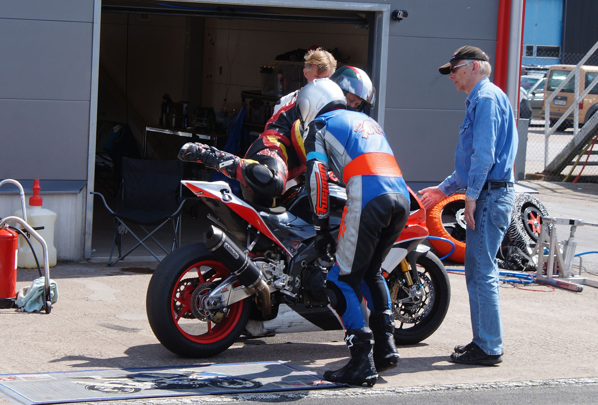 De har set min signal, så jeg kører ind på den næste omgang. Mikael står klar, tager over motorcyklen,