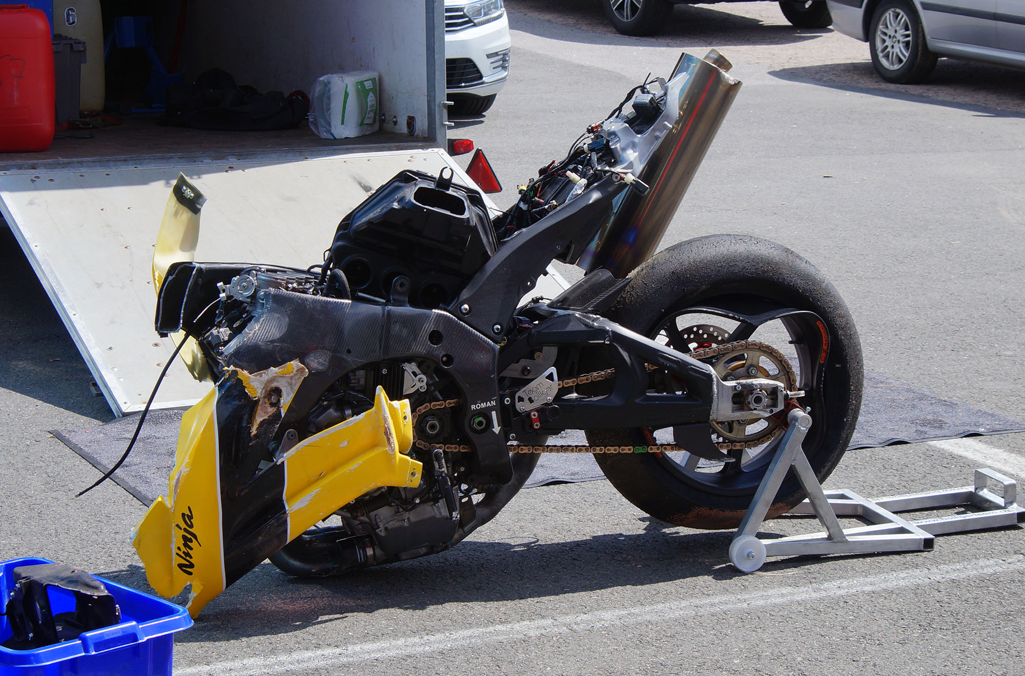 behøvde. Jeg hade taget den andre kassen med reservedele, som f.eks. styrpinder, bremse og