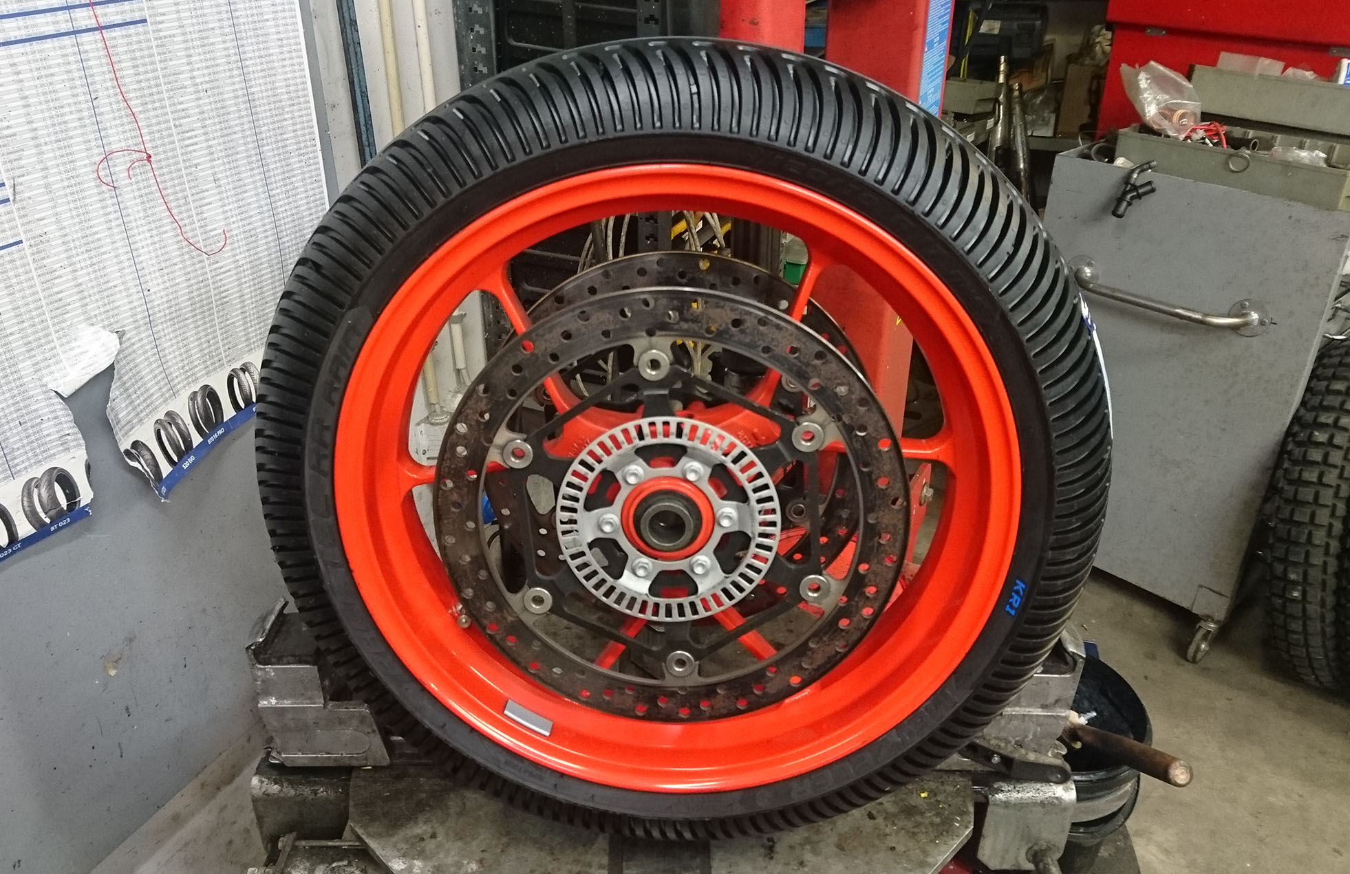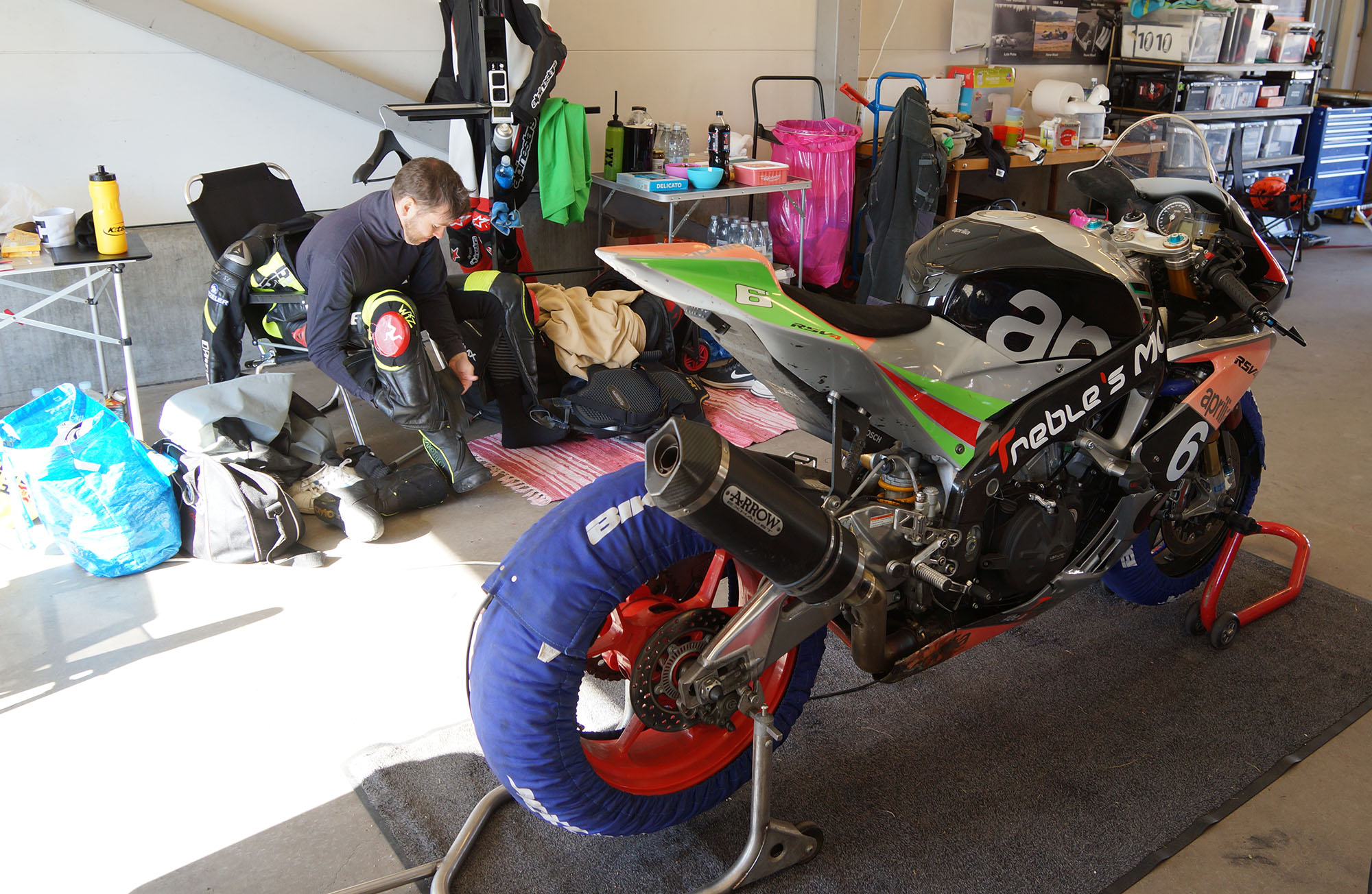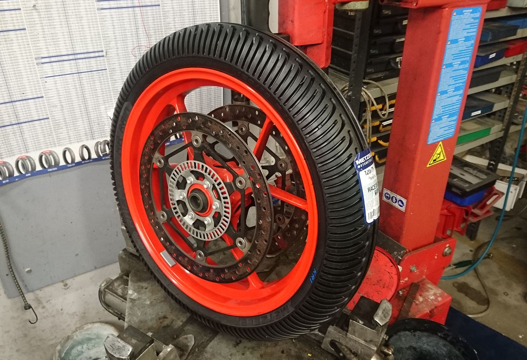 i garaget og monterede nye regndæk på fælge, plus slicksdæk, et fordæk og to bagdæk på fælge