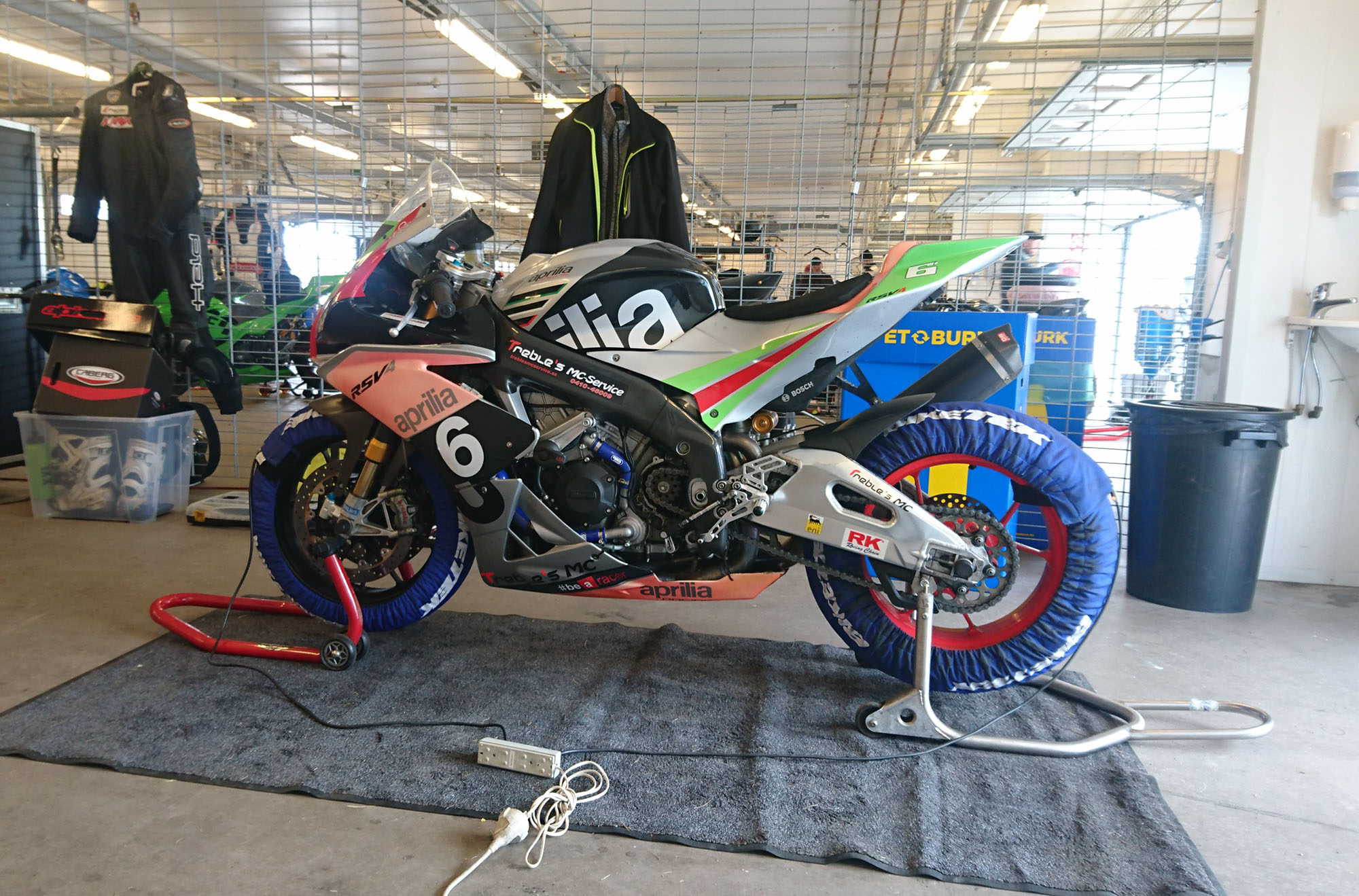 og vores motorcykel med dækvarmere på.