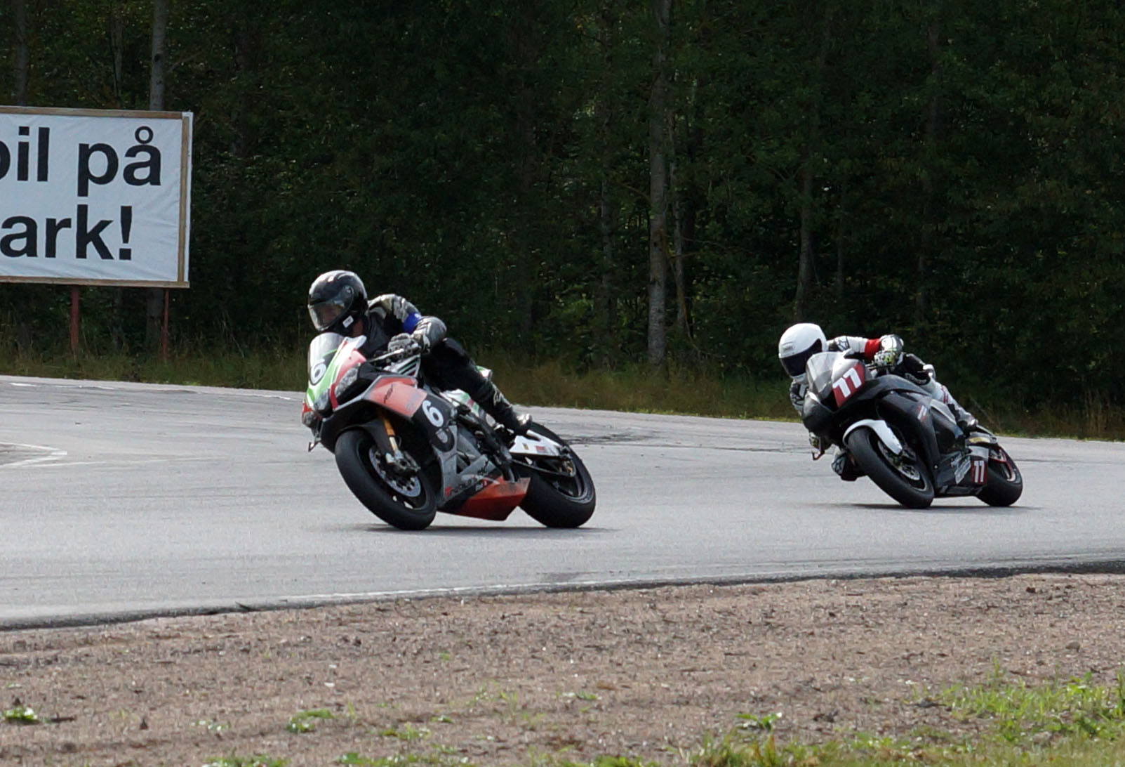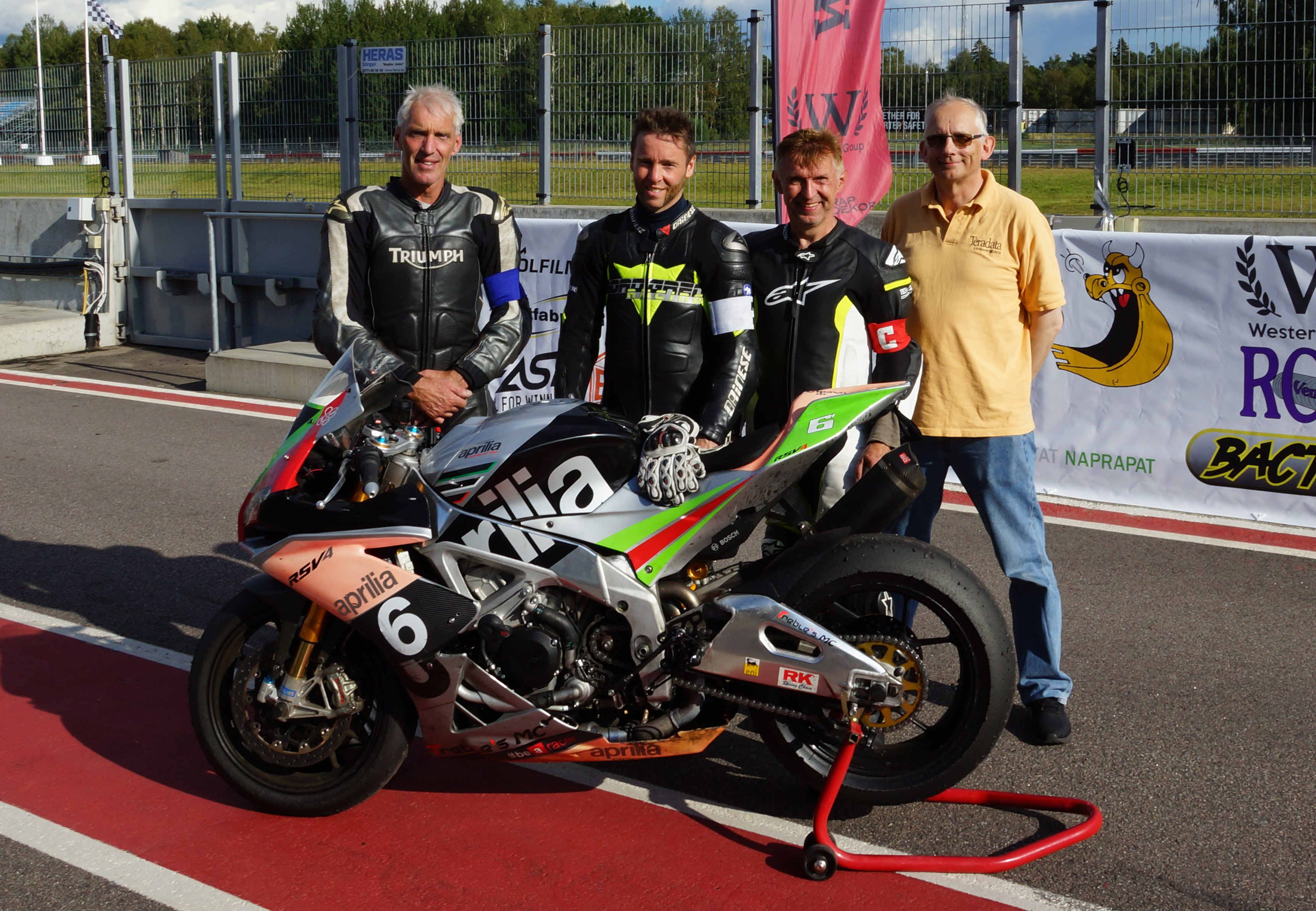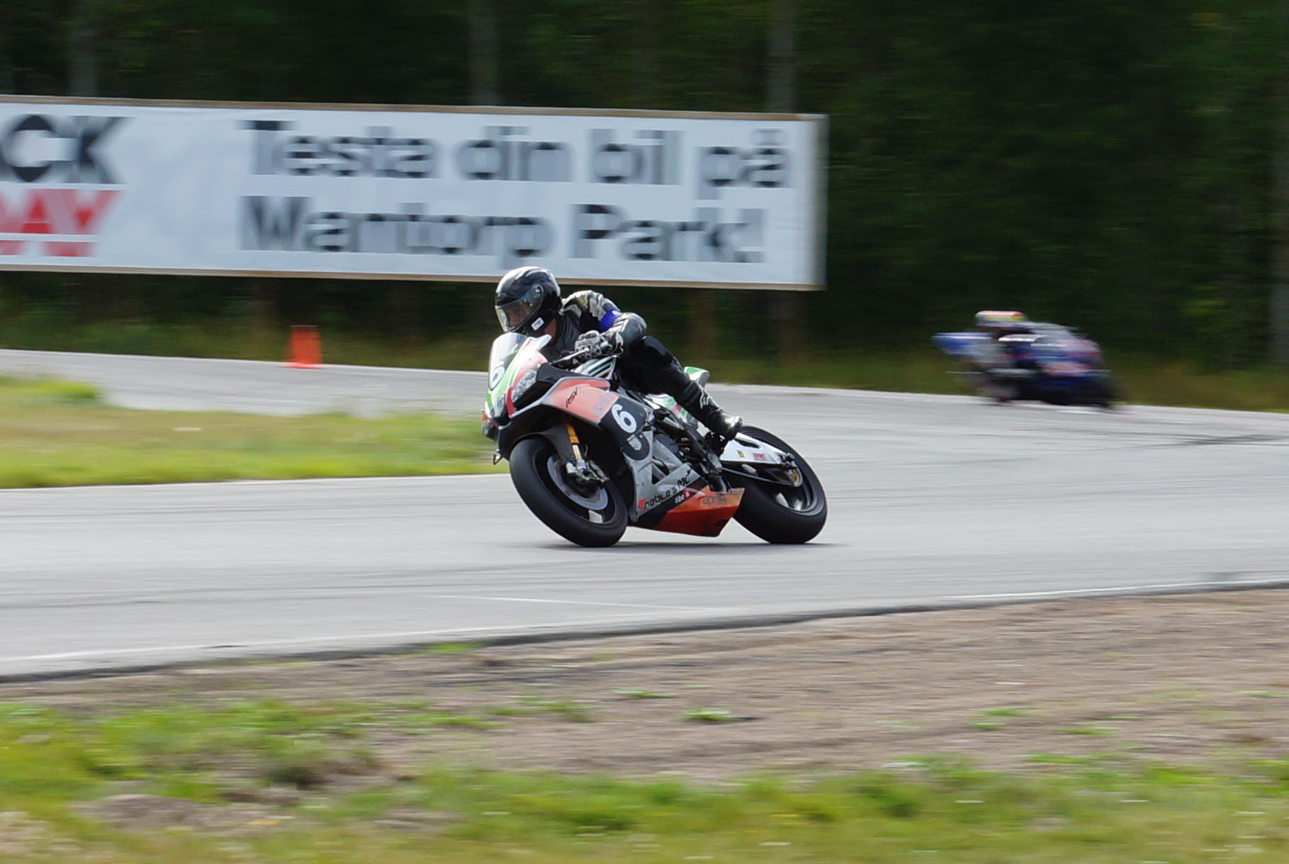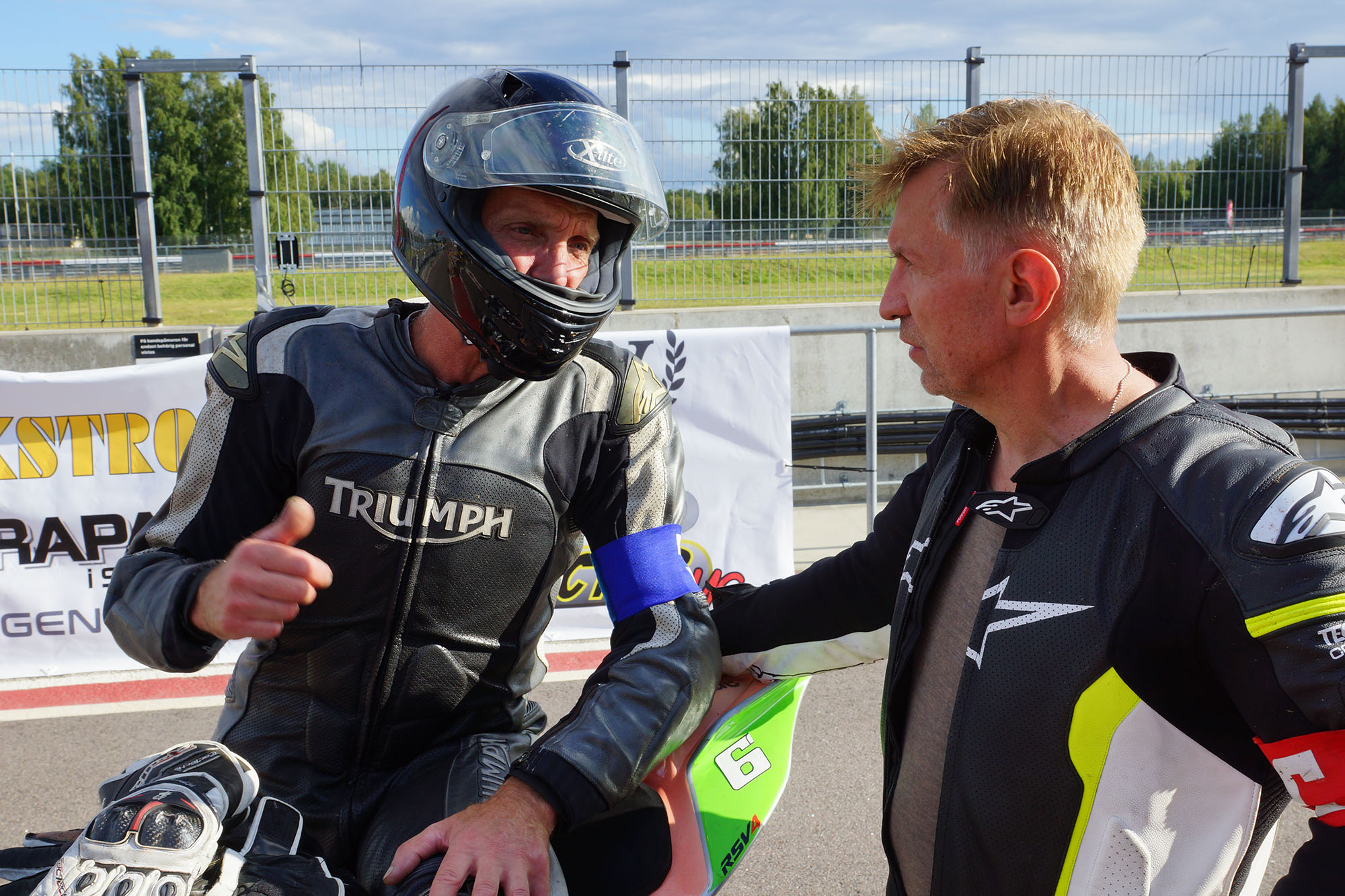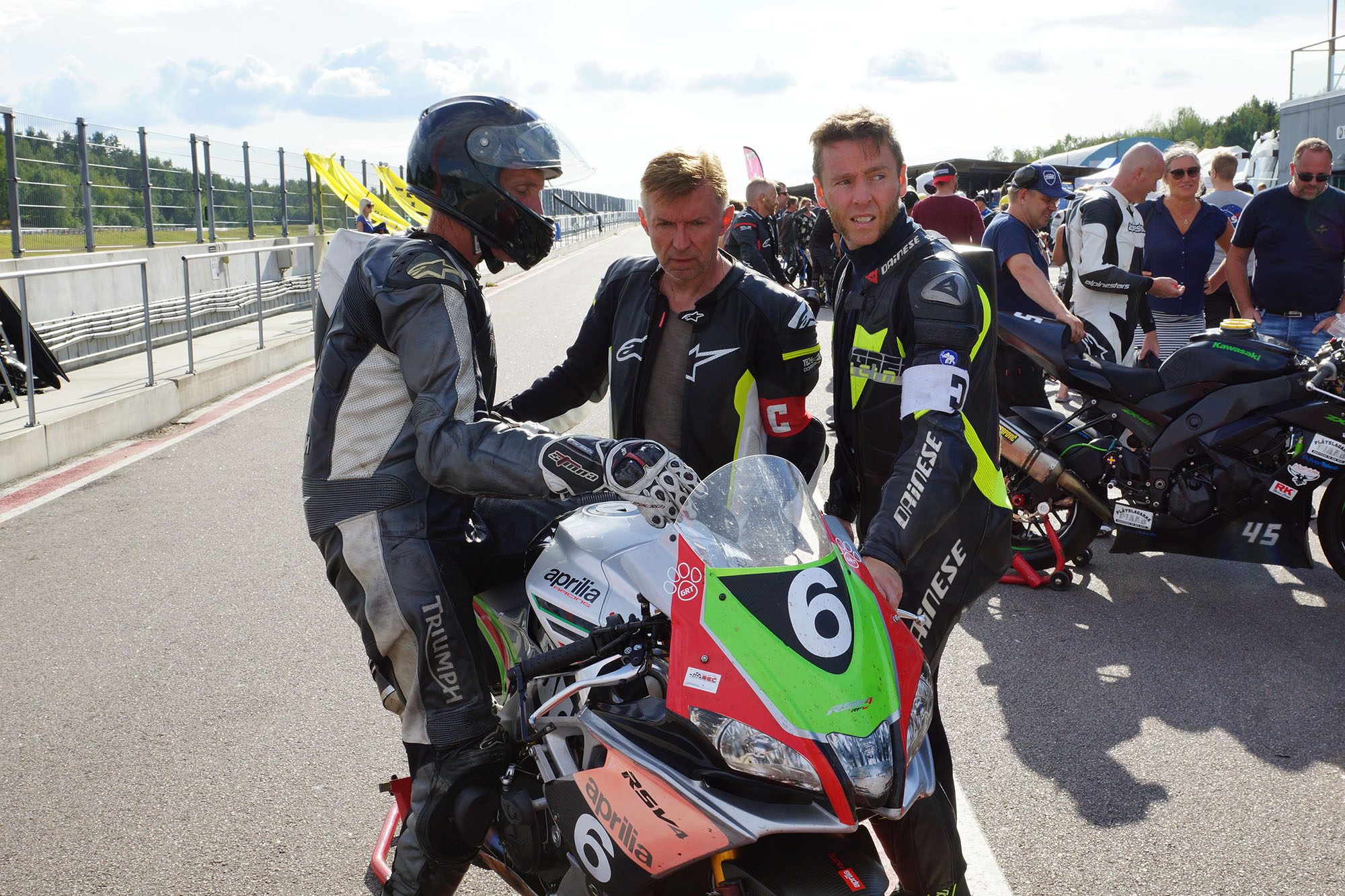 på en 1000-kubik motorcykel. Stefan "Humlan" fra vinderteamet som vi deler pitbox med, kommer