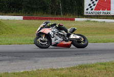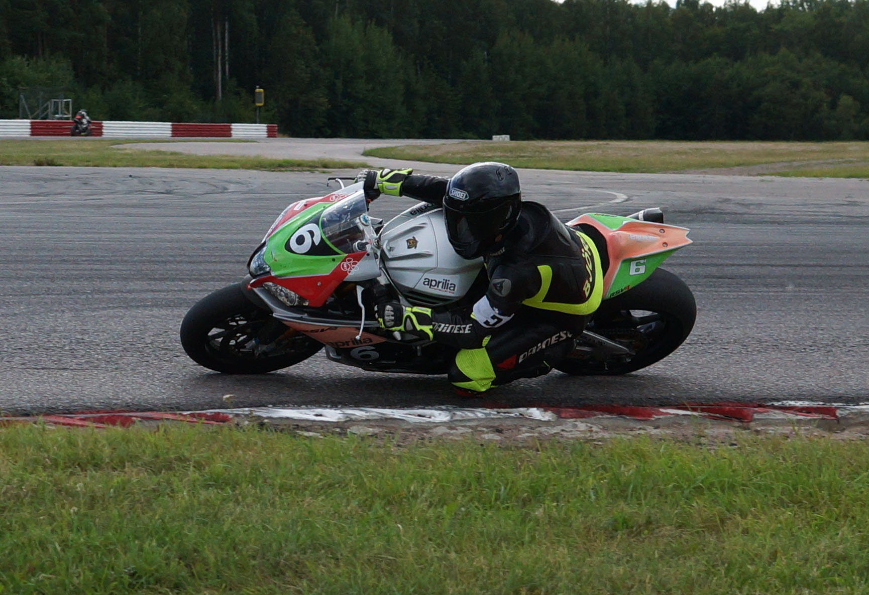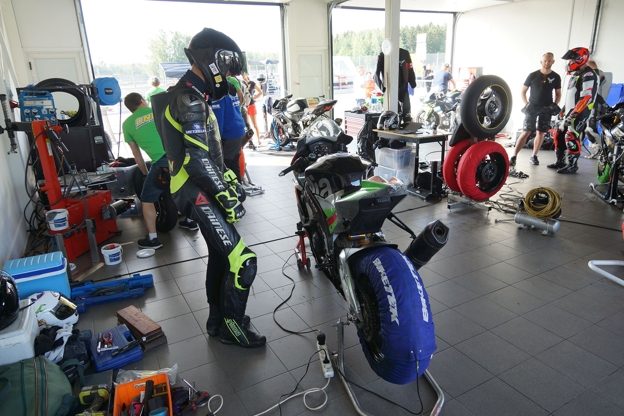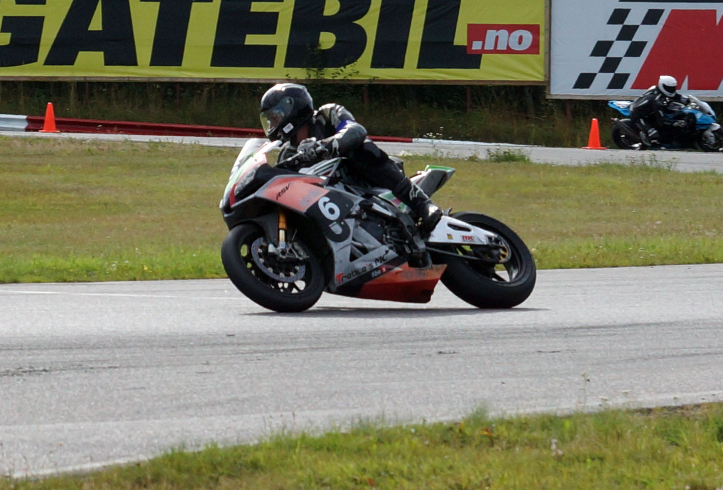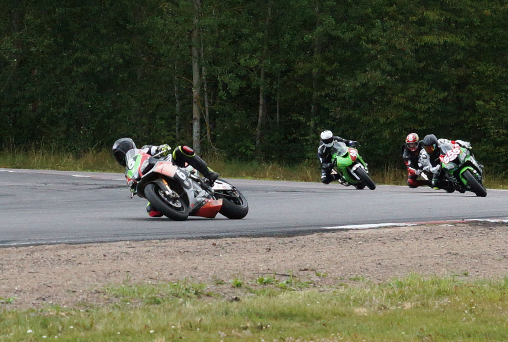 på en 1000-kubik motorcykel. Stefan "Humlan" fra vinderteamet som vi deler pitbox med, kommer