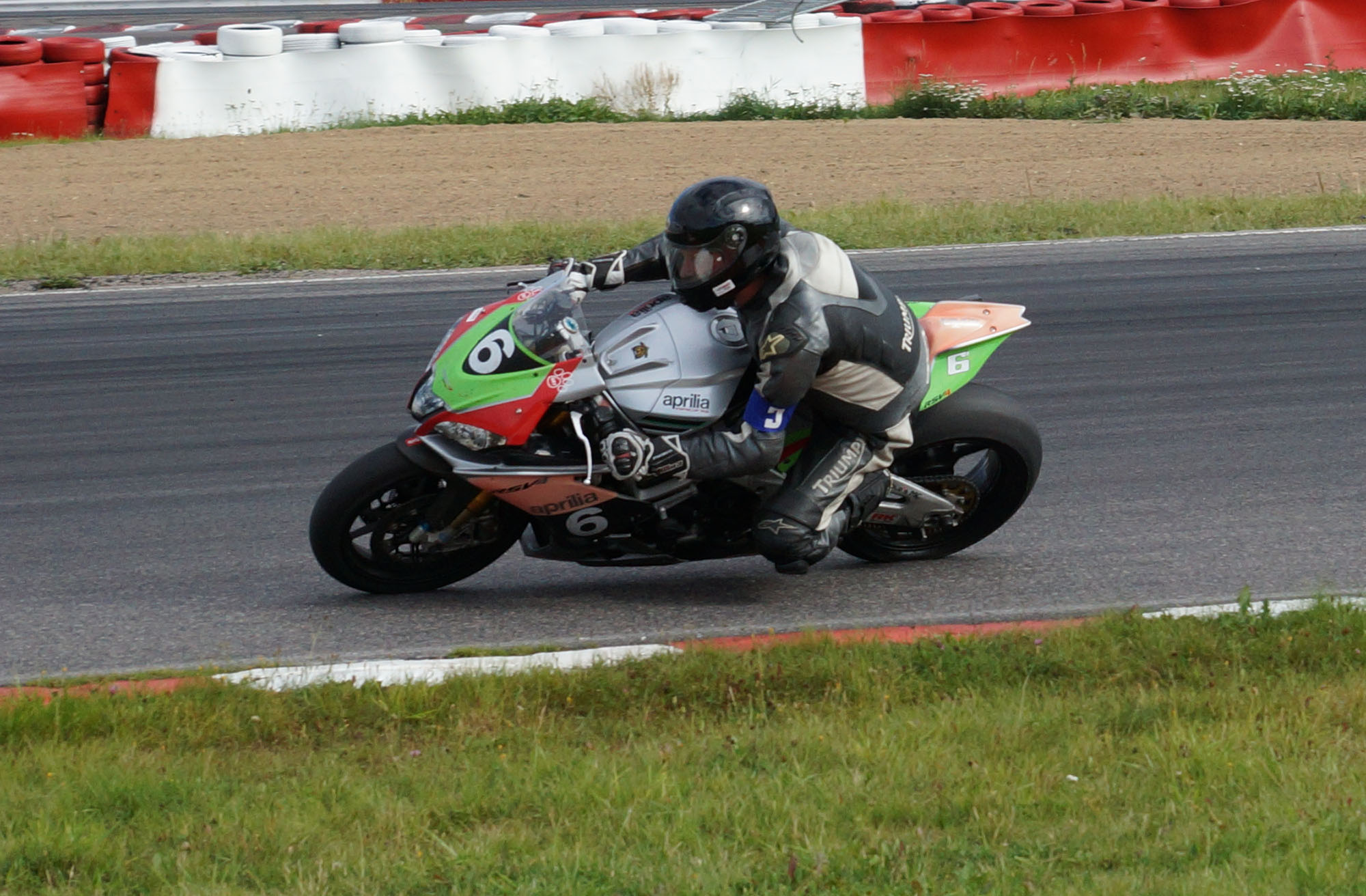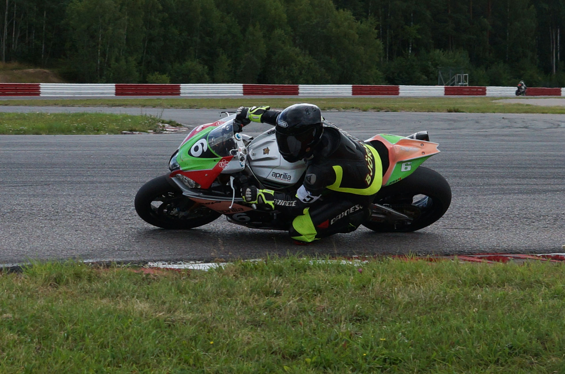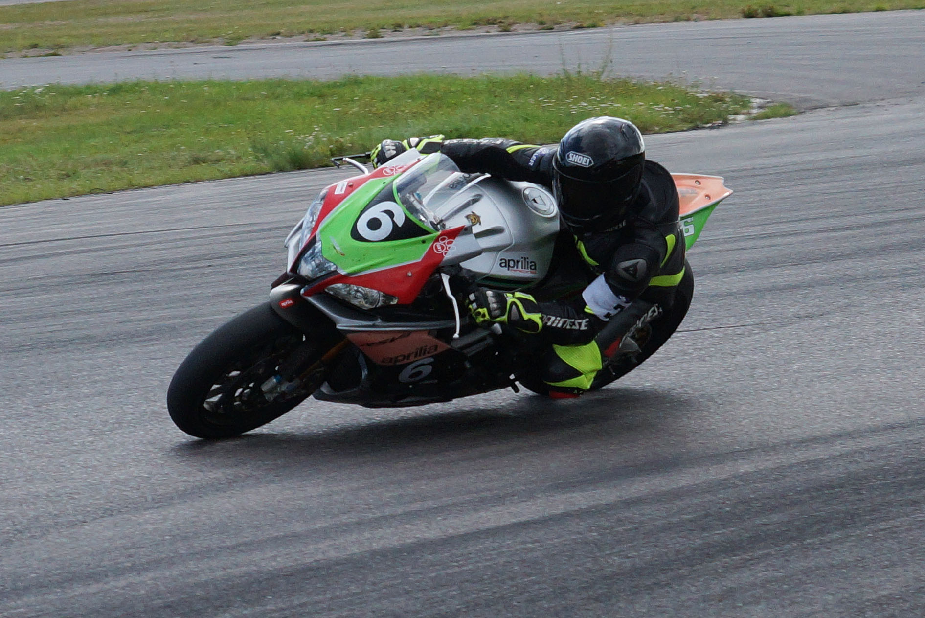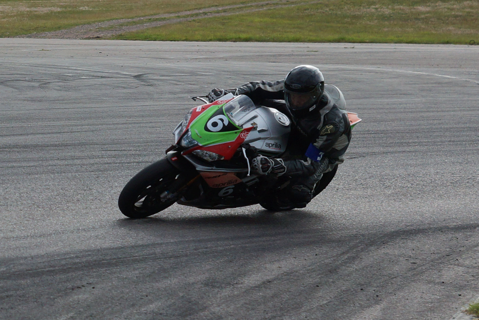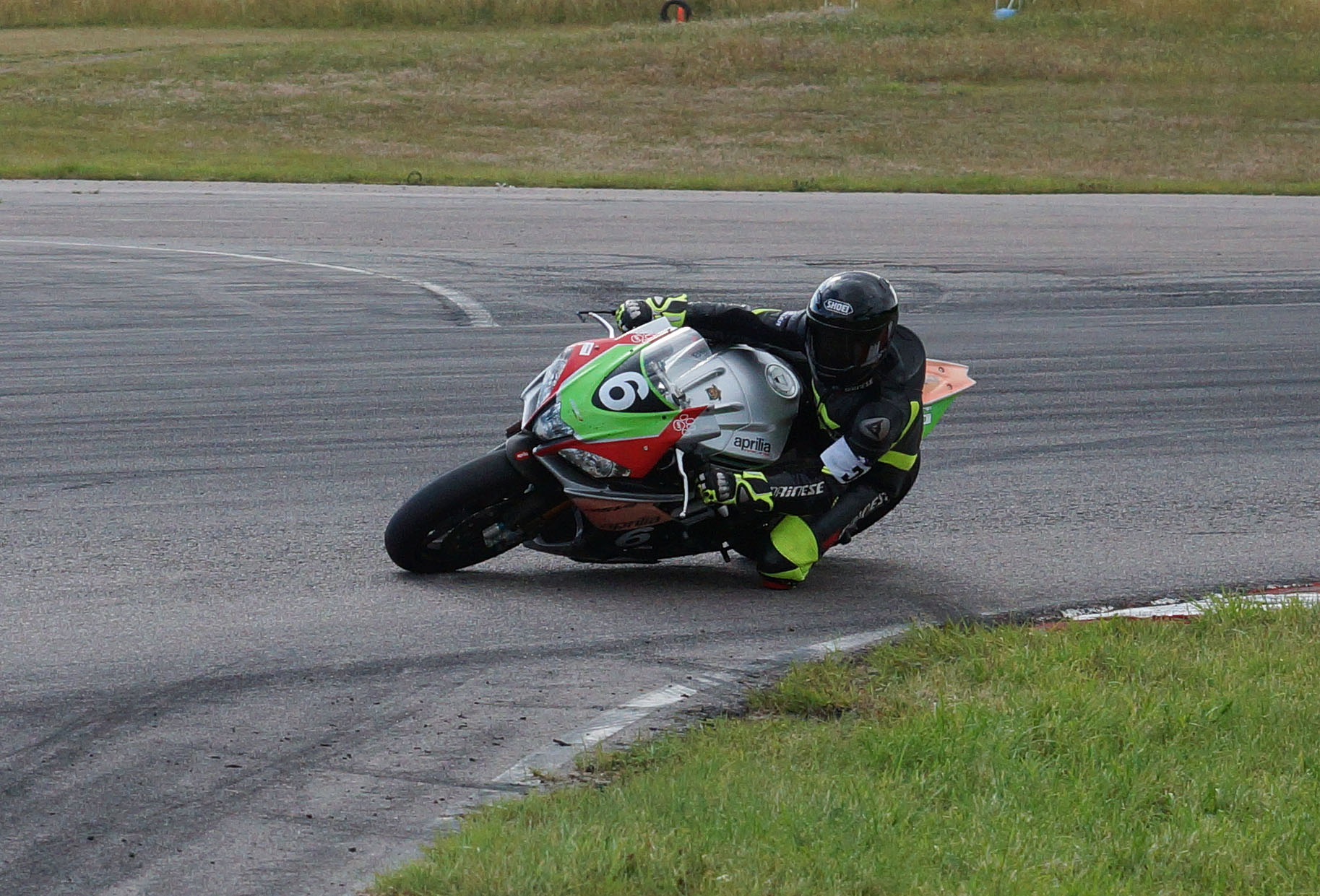på en 1000-kubik motorcykel. Stefan "Humlan" fra vinderteamet som vi deler pitbox med, kommer