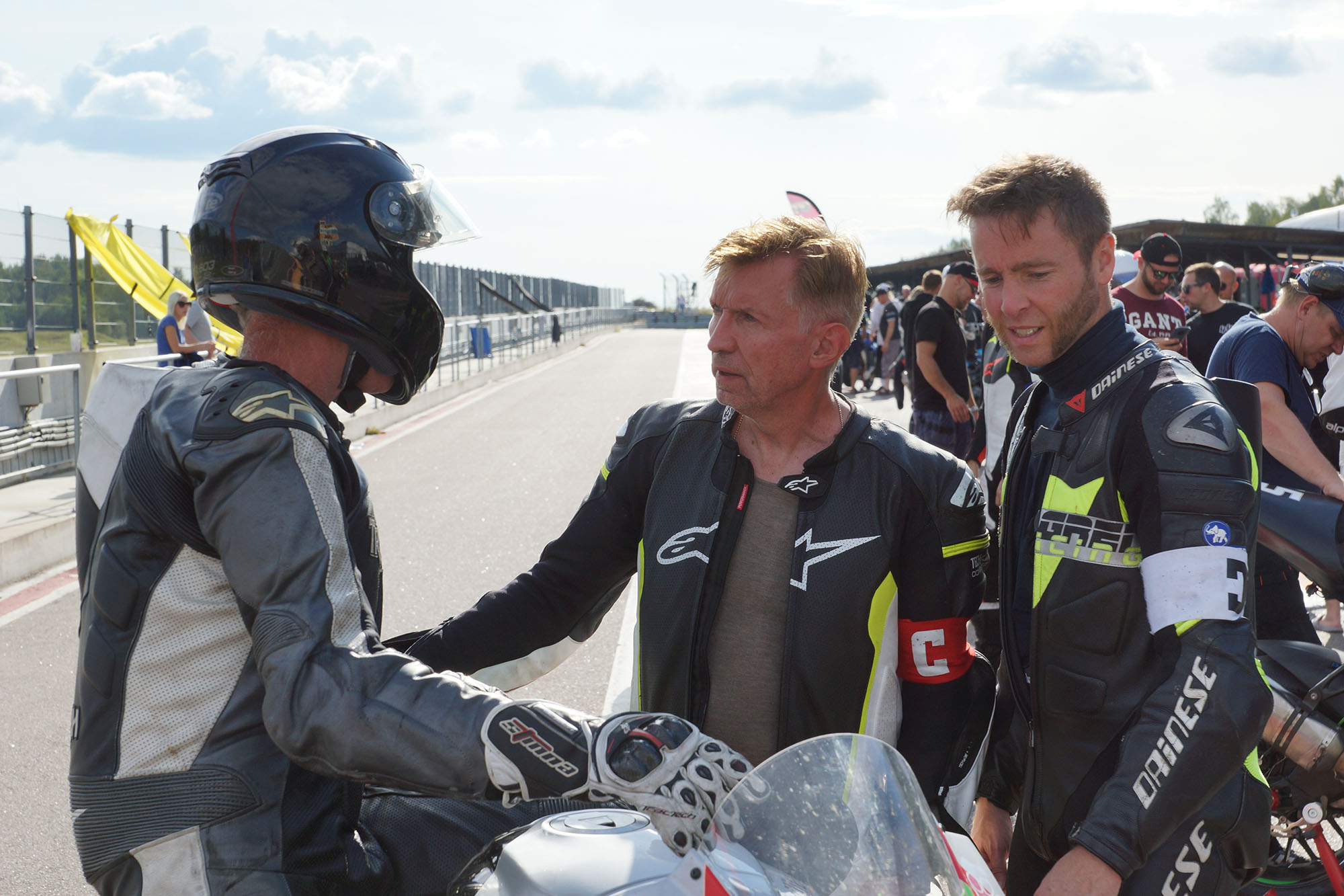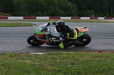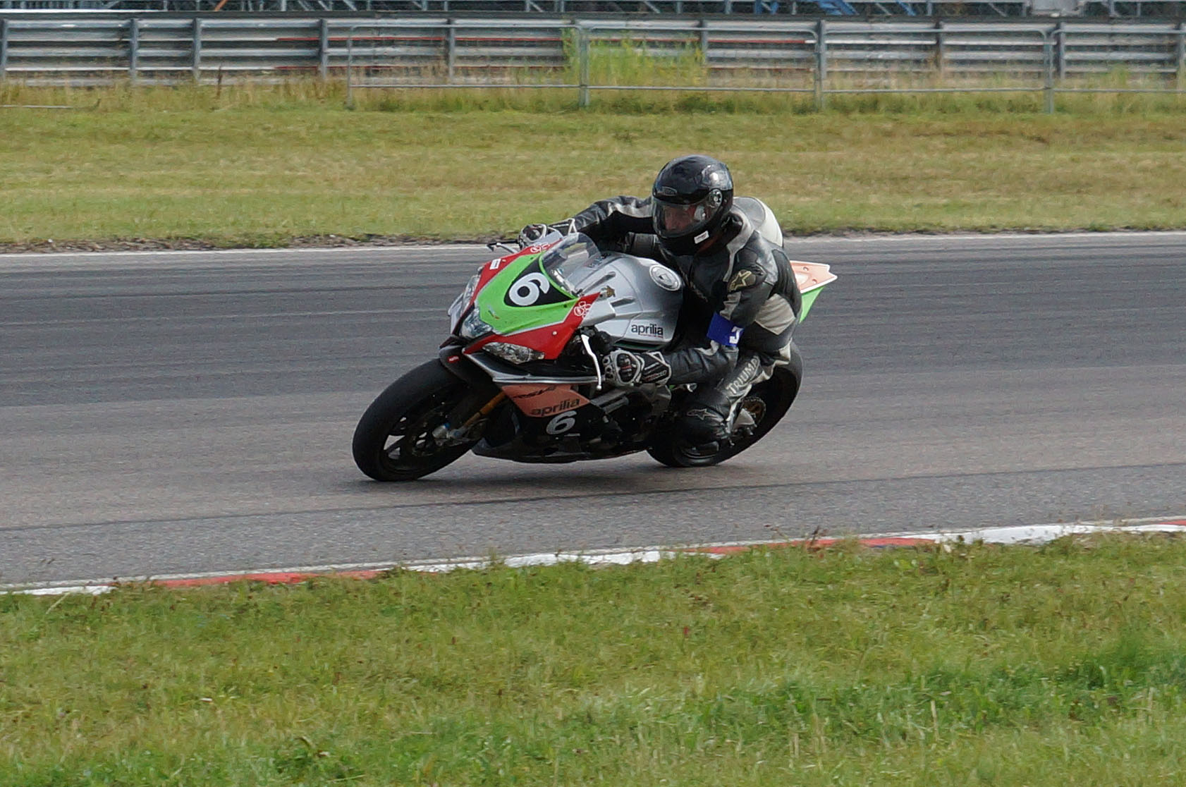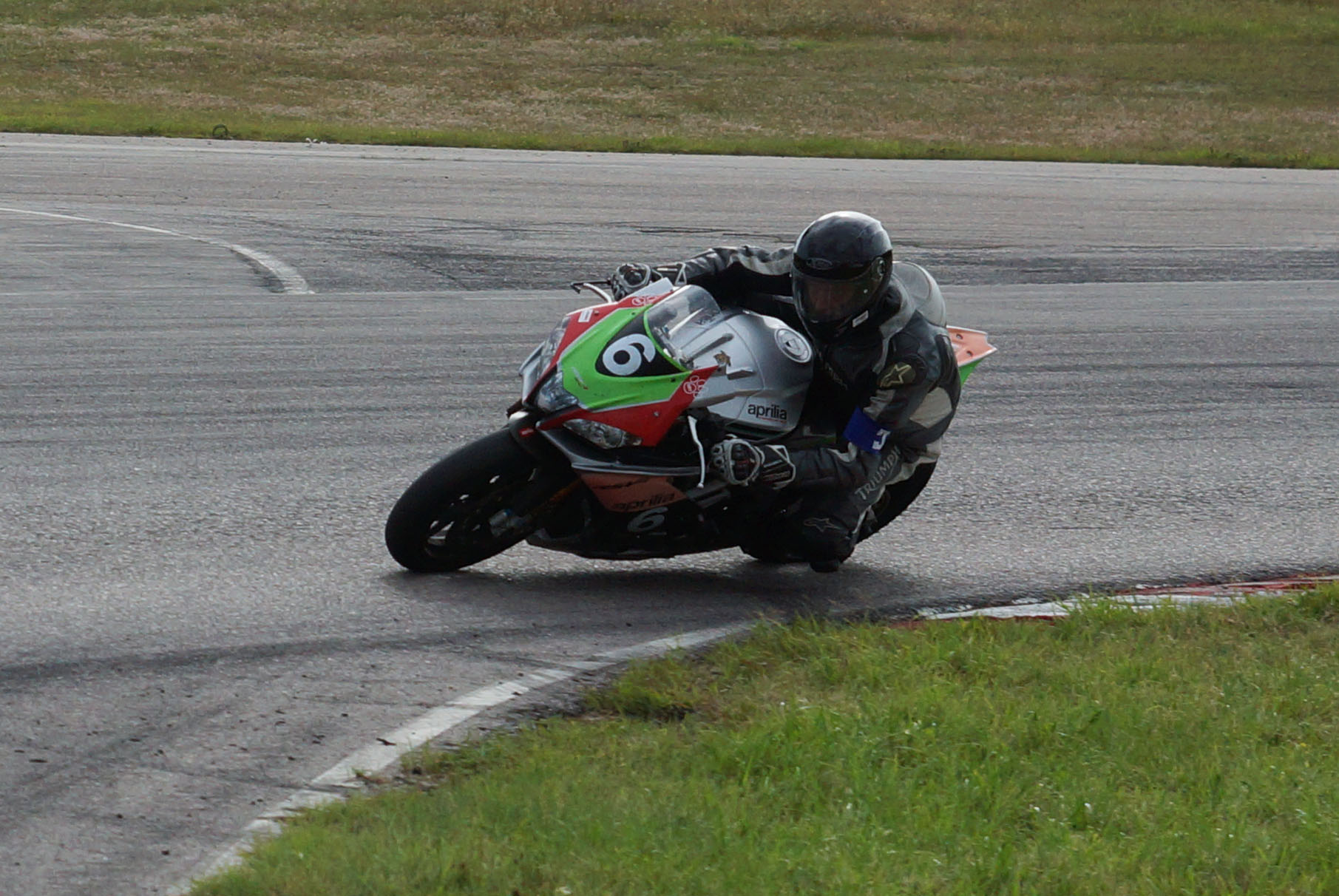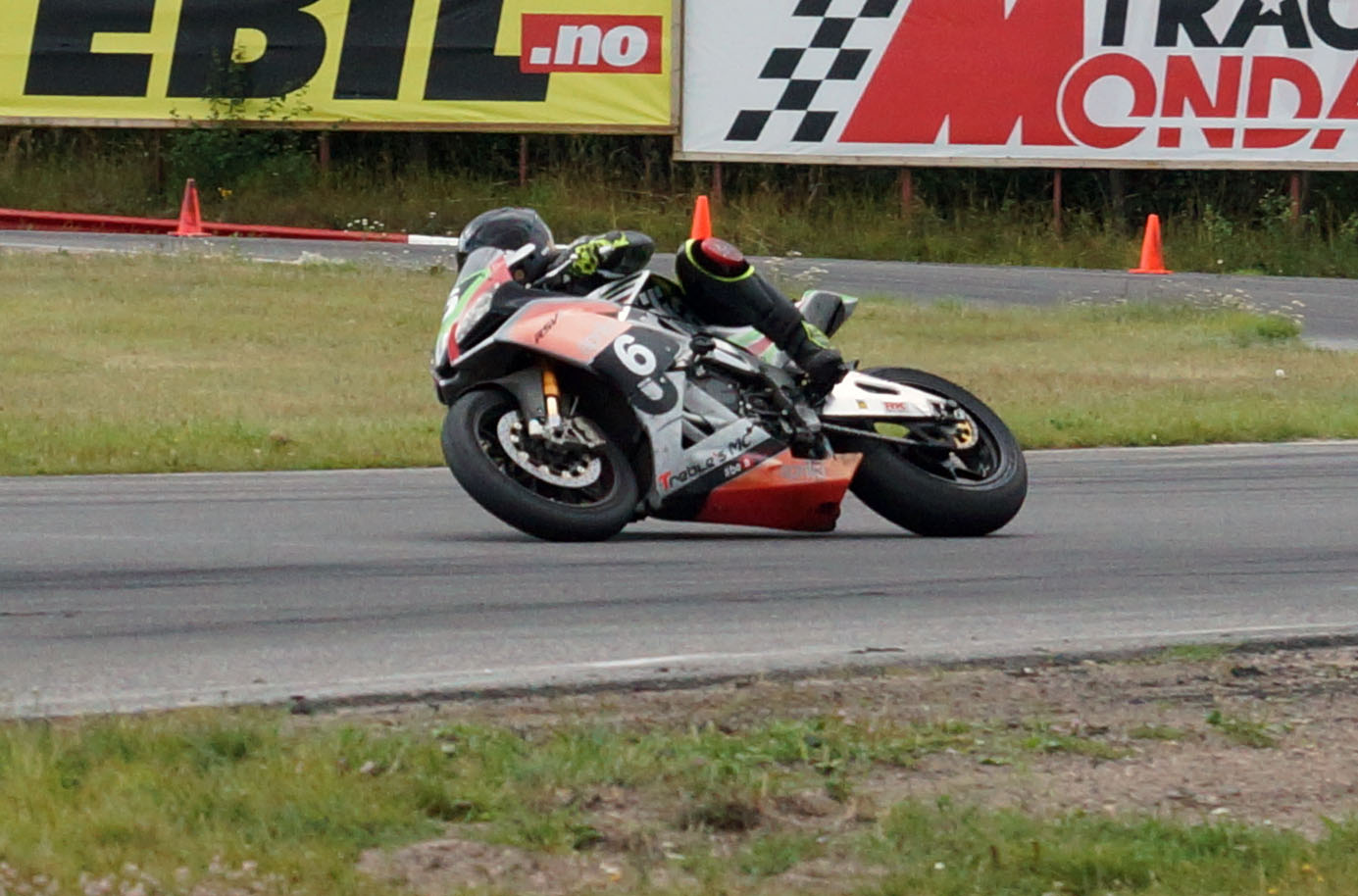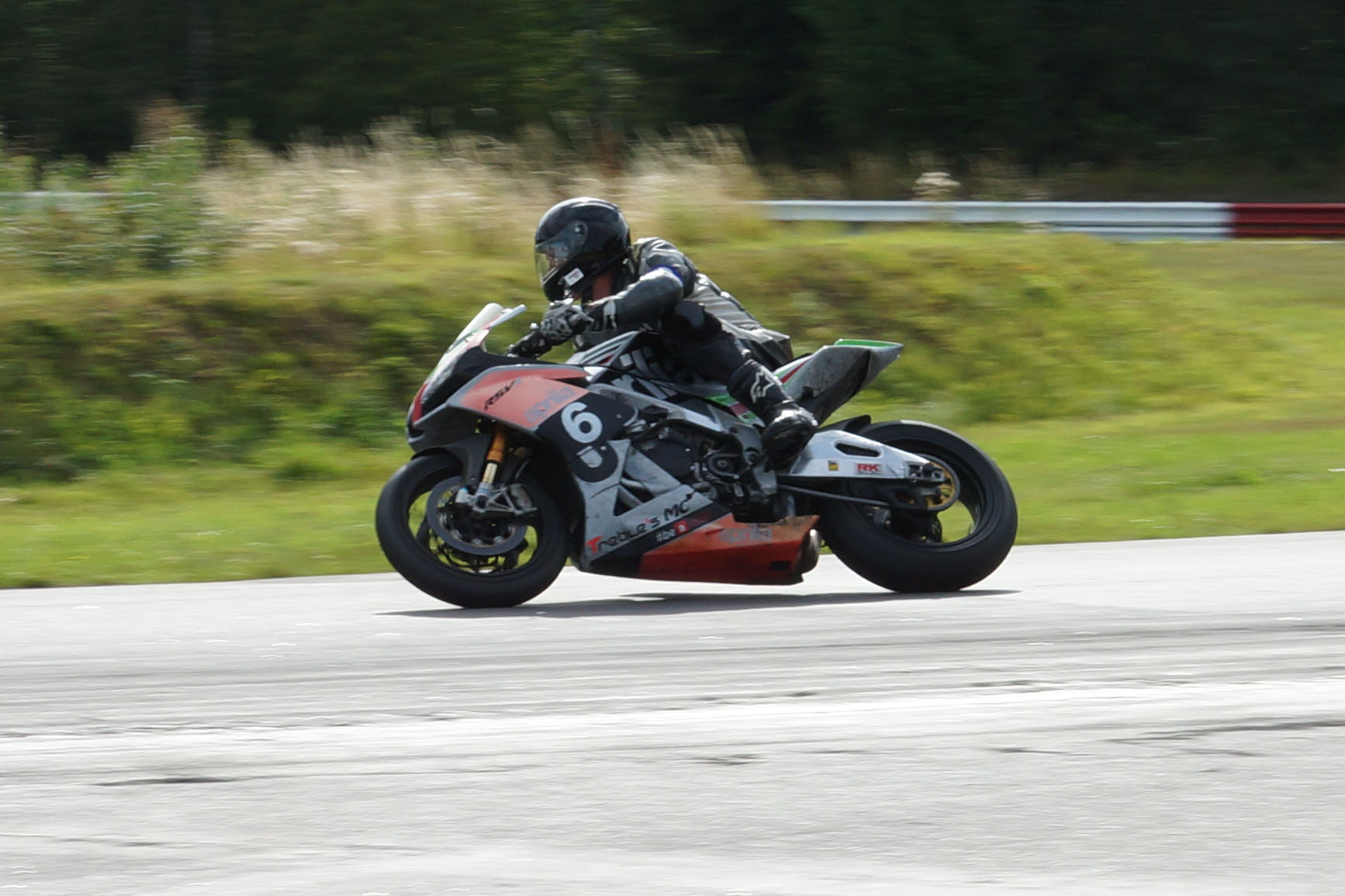 på en 1000-kubik motorcykel. Stefan "Humlan" fra vinderteamet som vi deler pitbox med, kommer