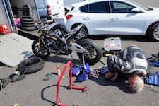 som et hårdt stop, og sammen med cykeln. Føreren ligger stille og banepersonal løber