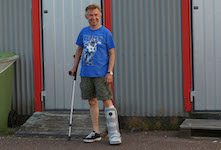 Nu er det min tur at køre. Jeg har pakket min venstre fod ud af plastikskinnen og pakket