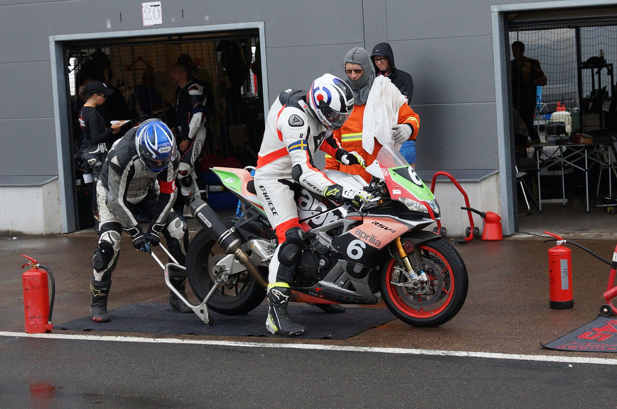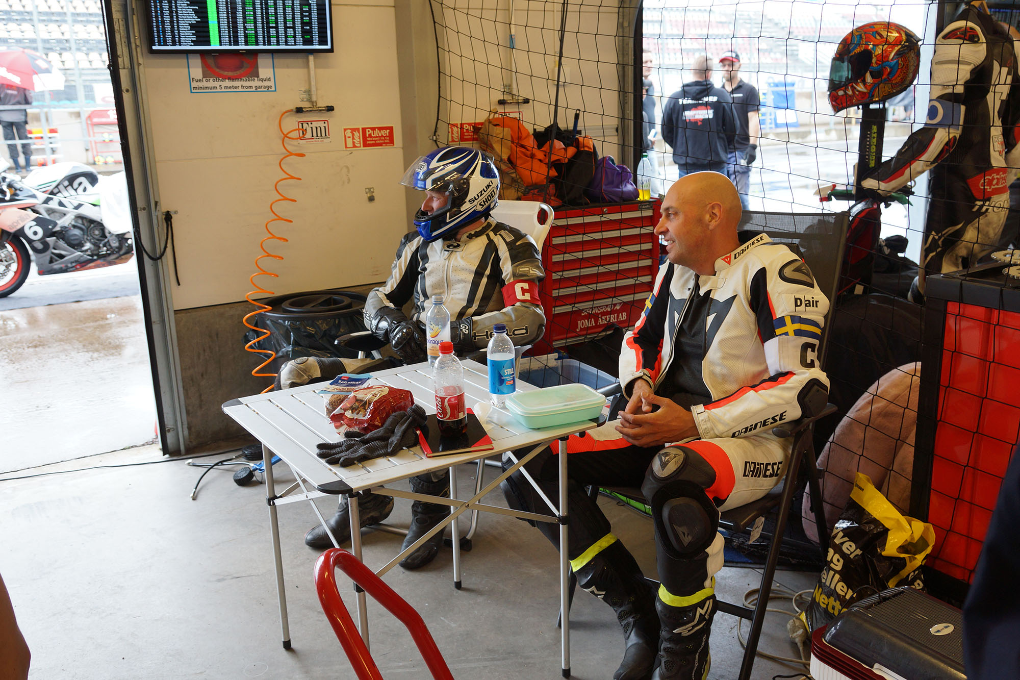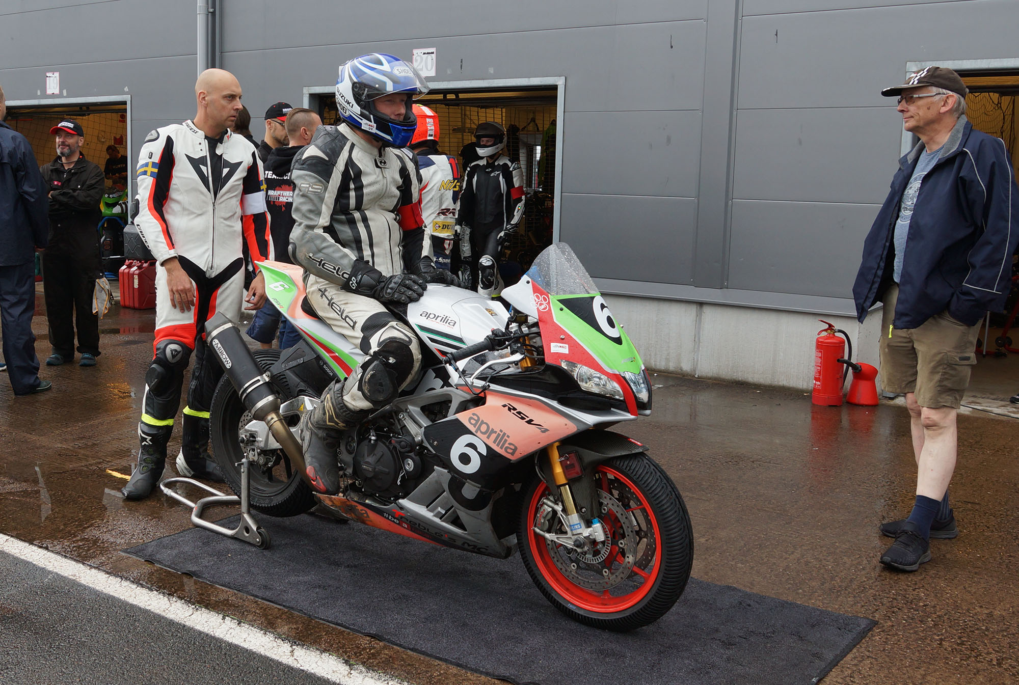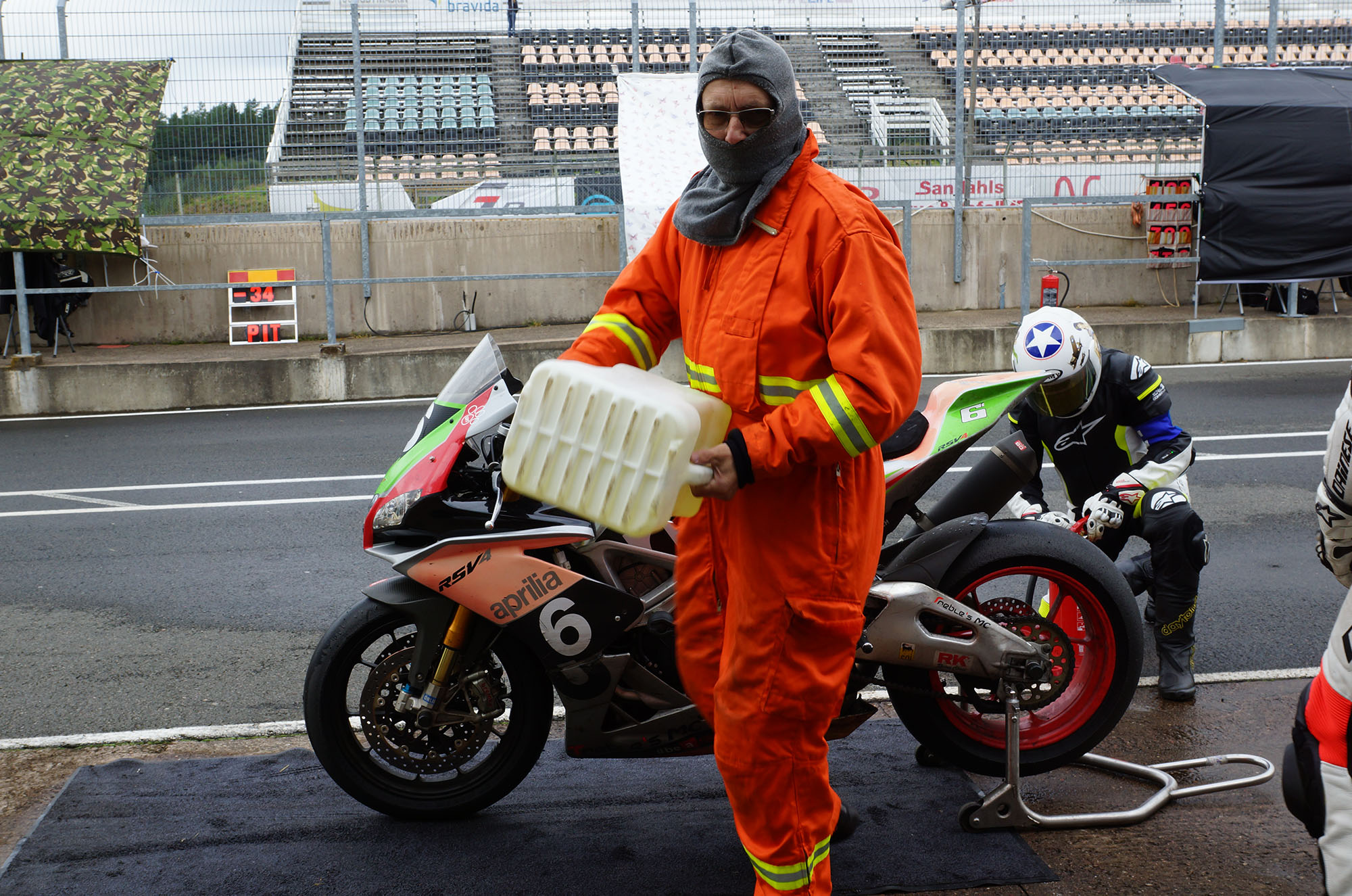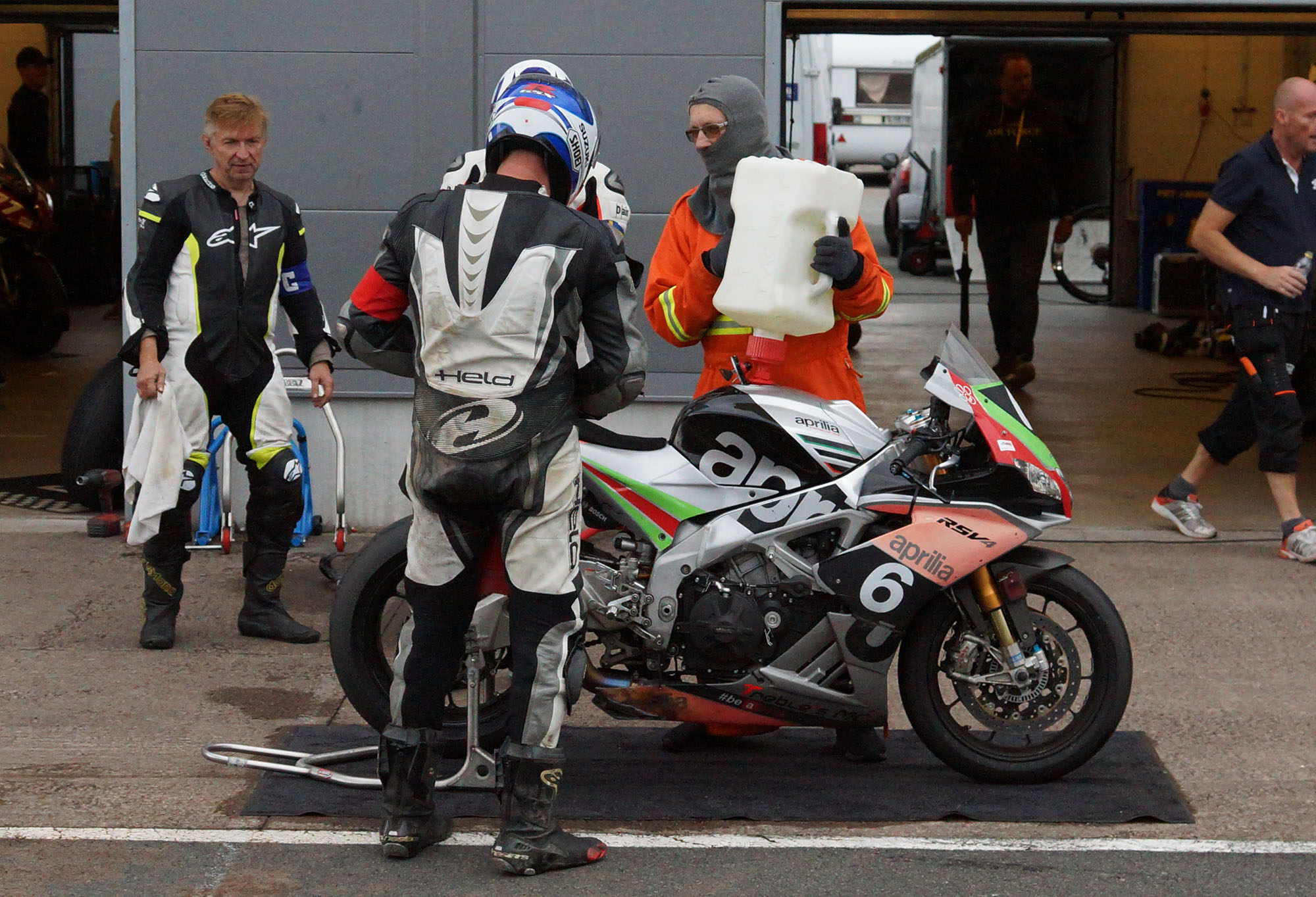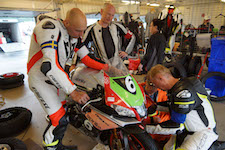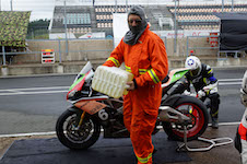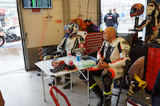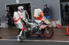 Peter kommer ind, teamet tanker, hjælper mig op på motorcyklen, og jeg tager afsted ud på banen.