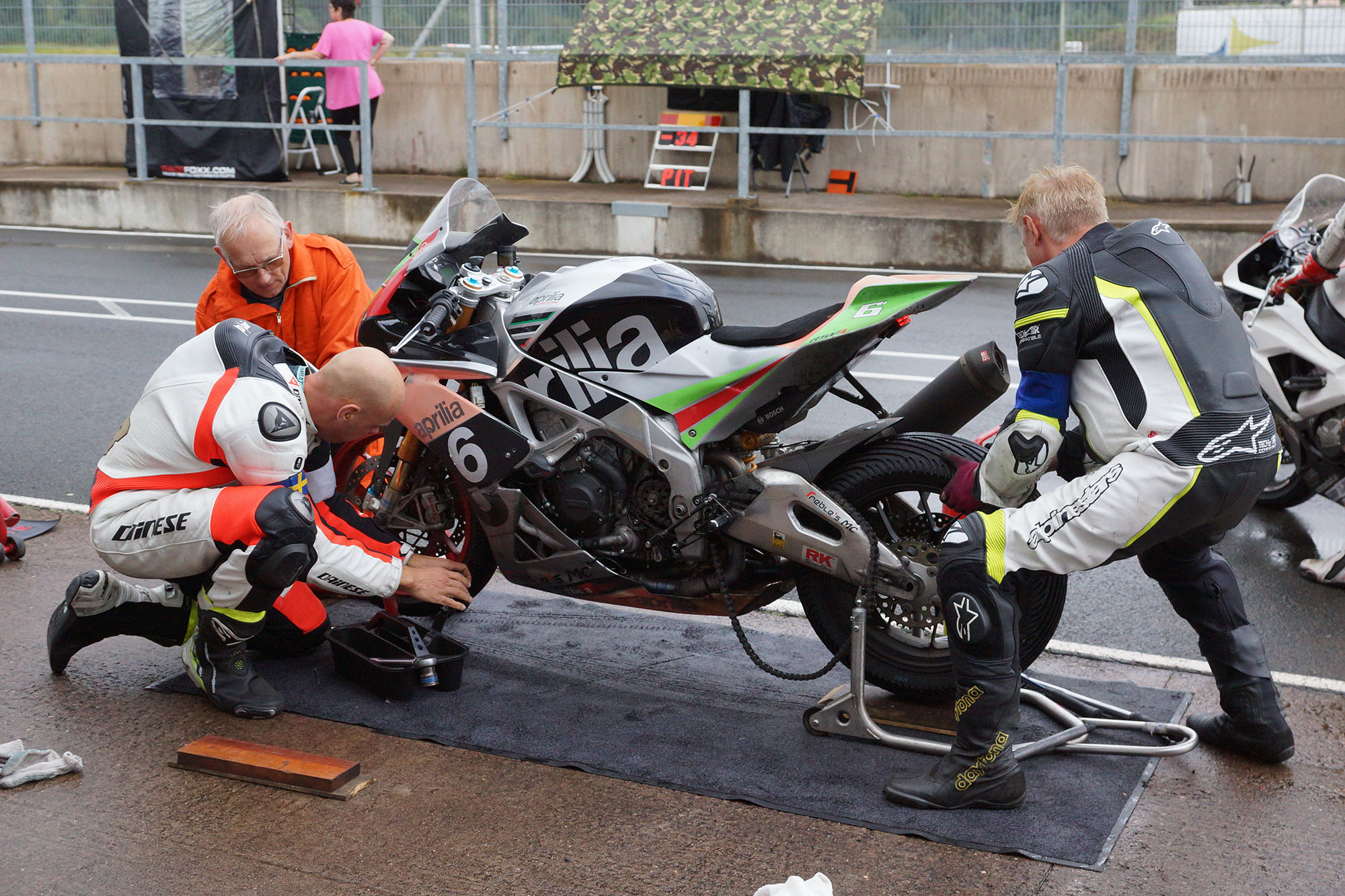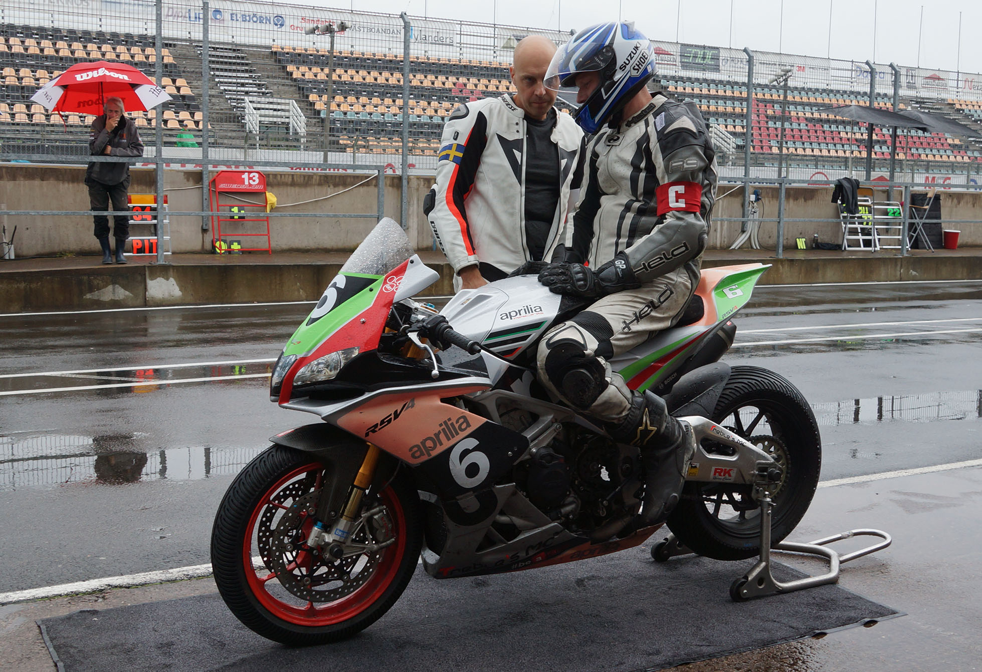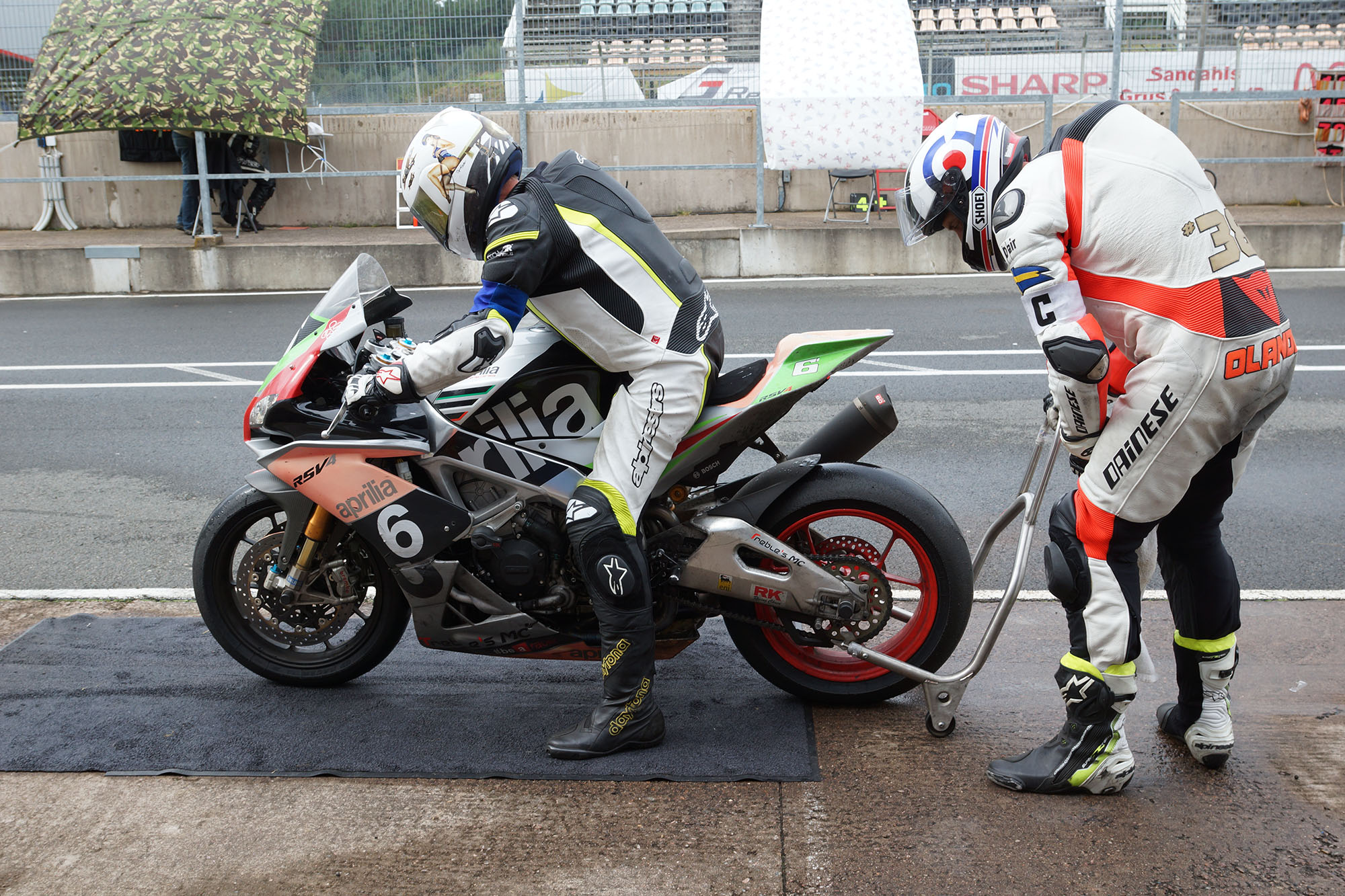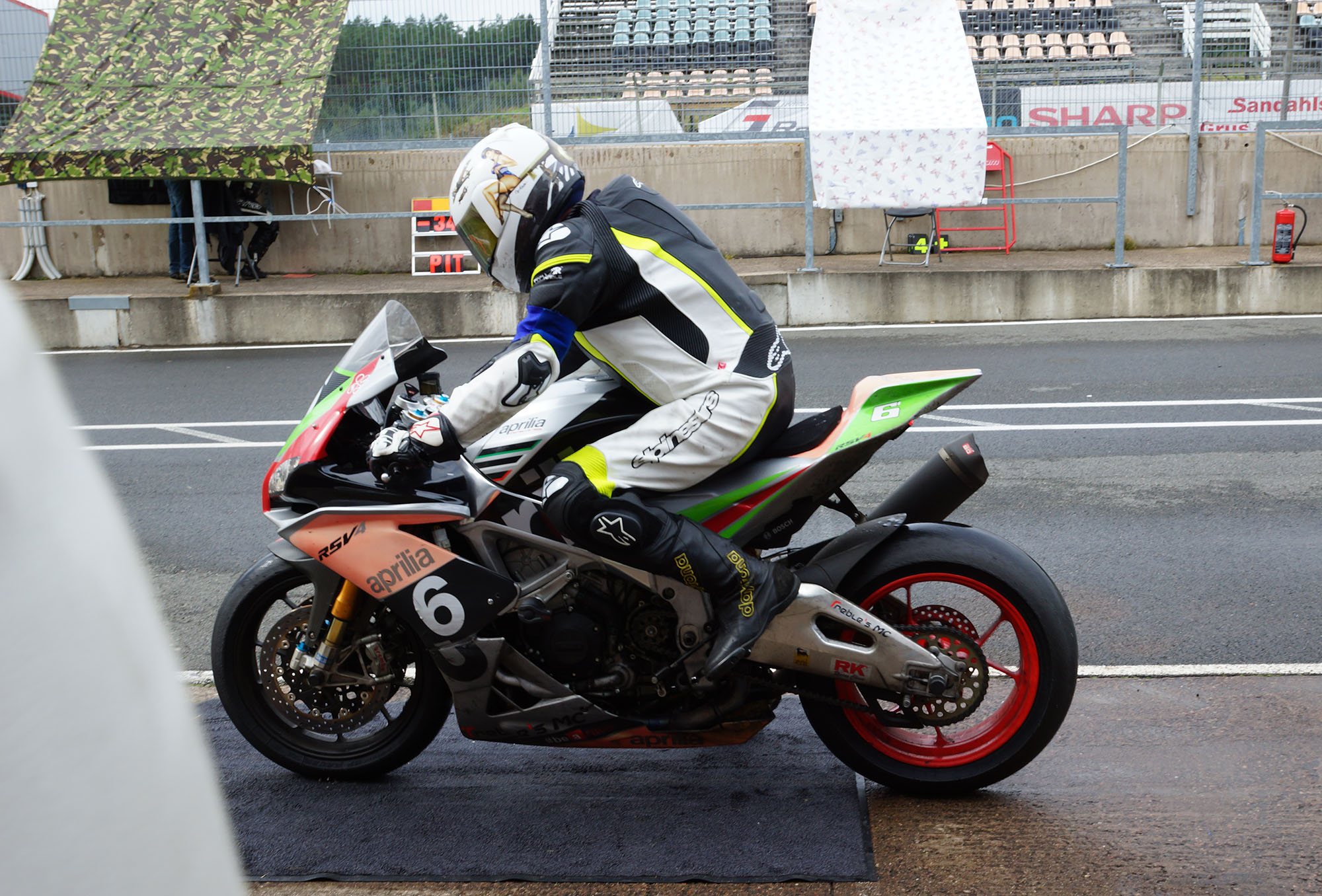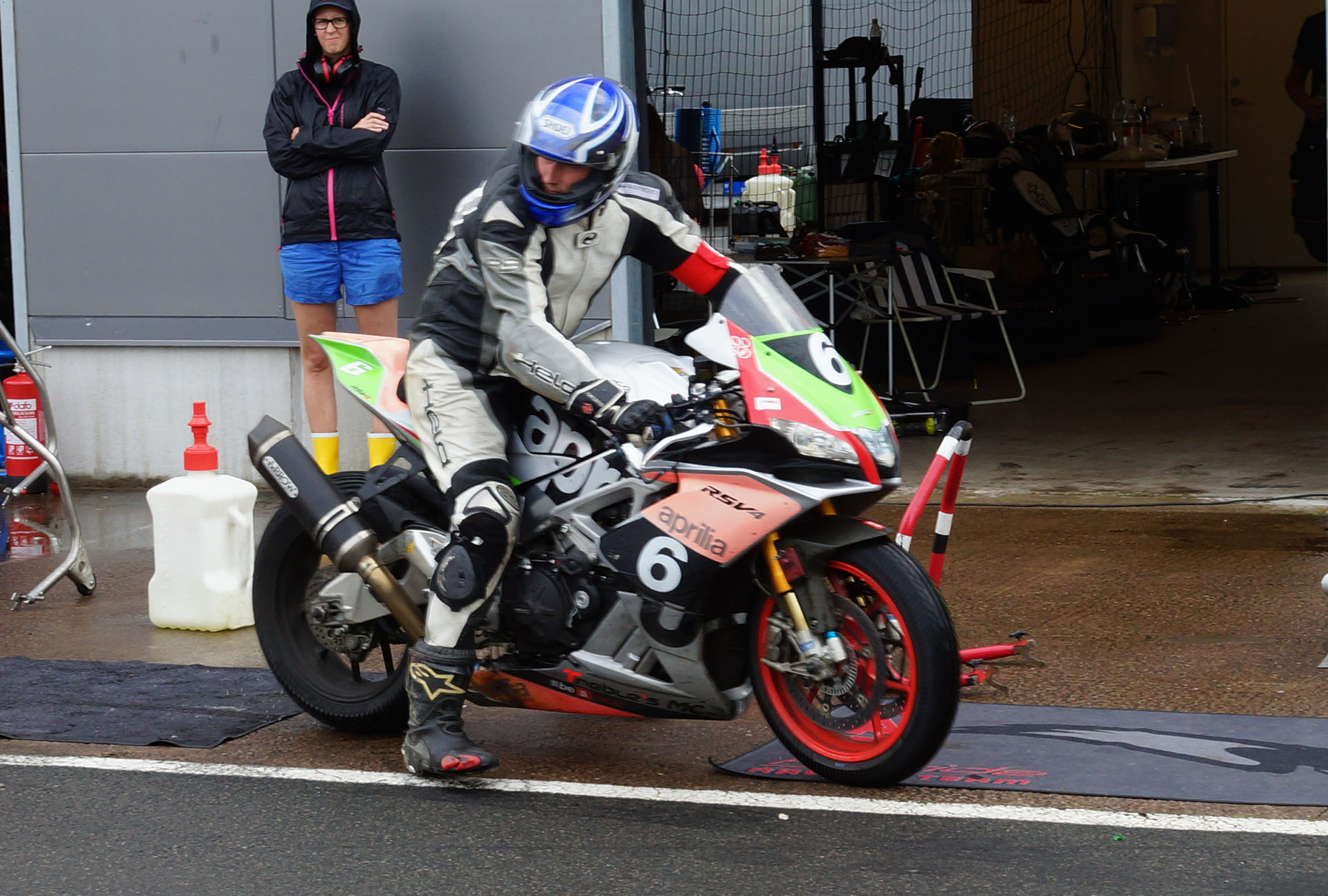 Peter kommer ind, teamet tanker, hjælper mig op på motorcyklen, og jeg tager afsted ud på banen.