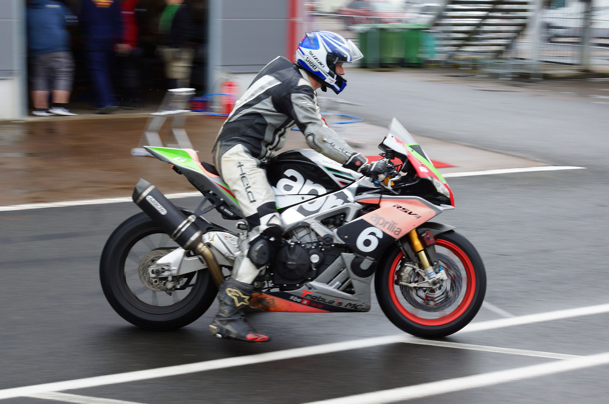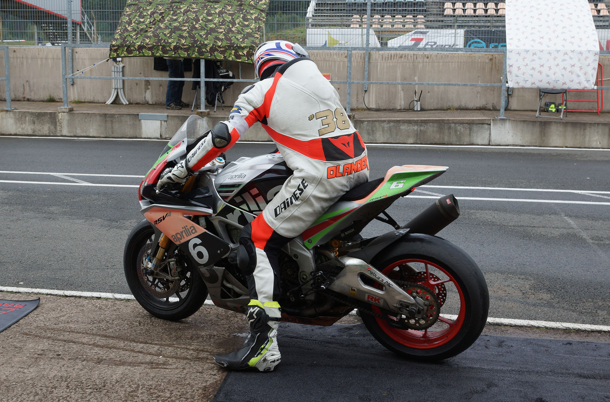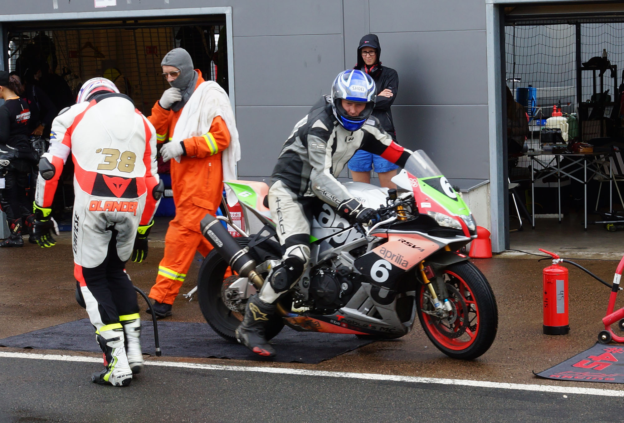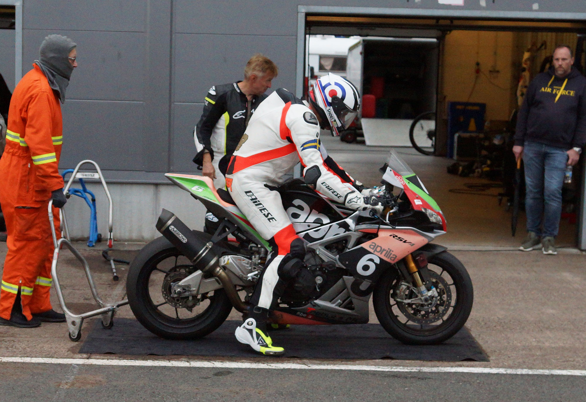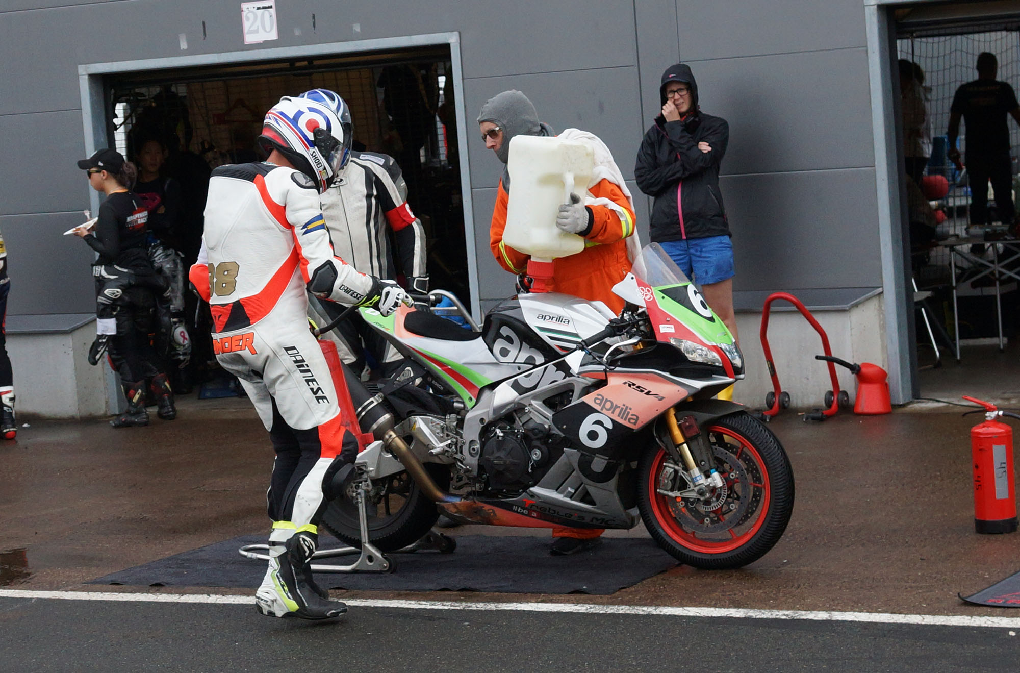 Peter kommer ind, teamet tanker, hjælper mig op på motorcyklen, og jeg tager afsted ud på banen.