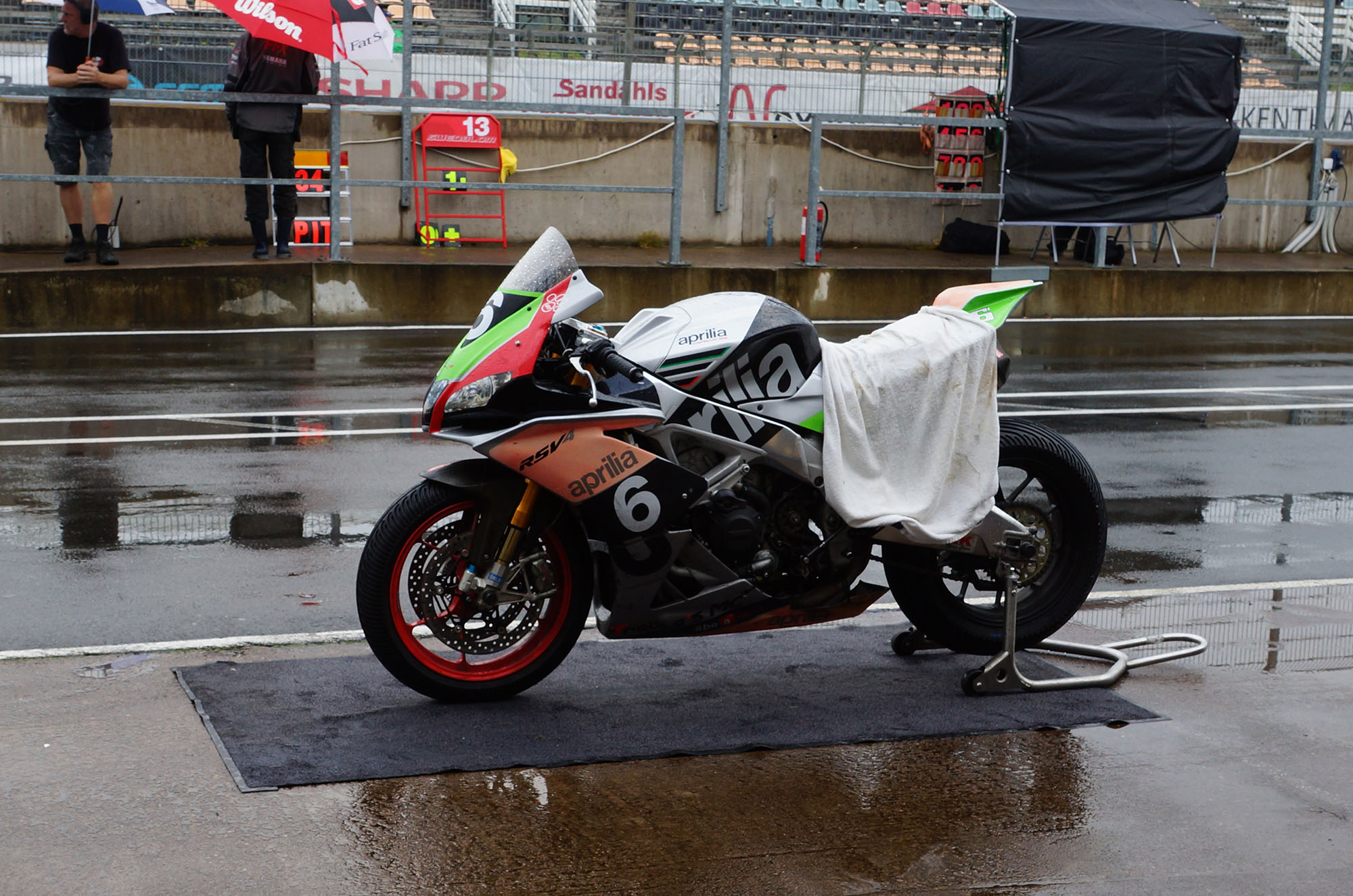 Det ar stadig meget vand ude på banen, og Peter kører videre med regndækken.