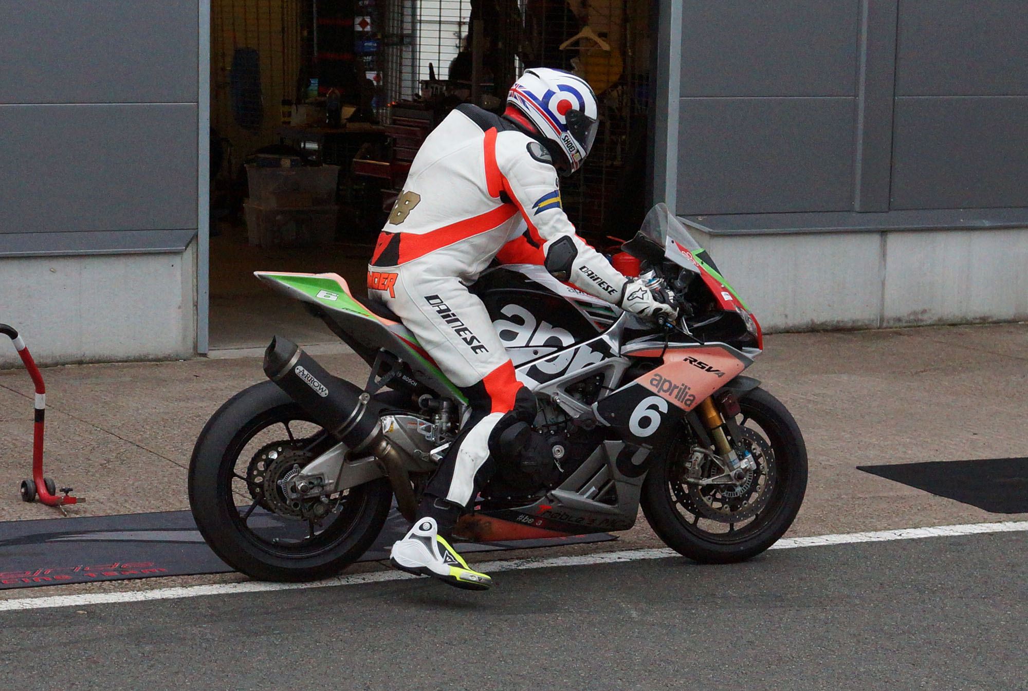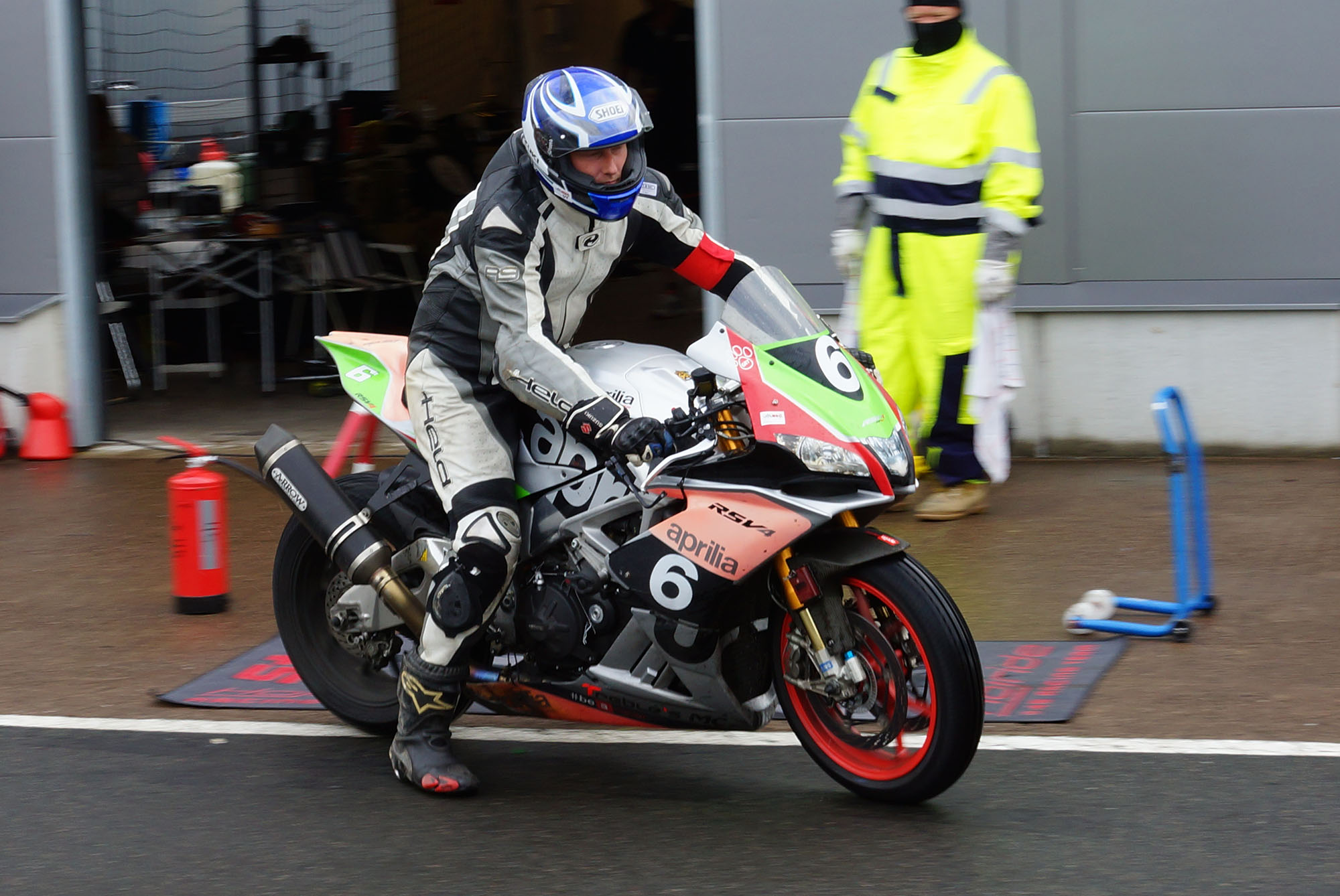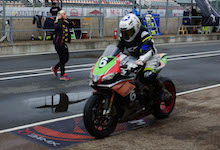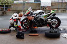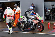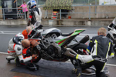 fra pit-boksen ud på banen. Heldigvis skader han sig ikke særlig meget, men deres motorcykel