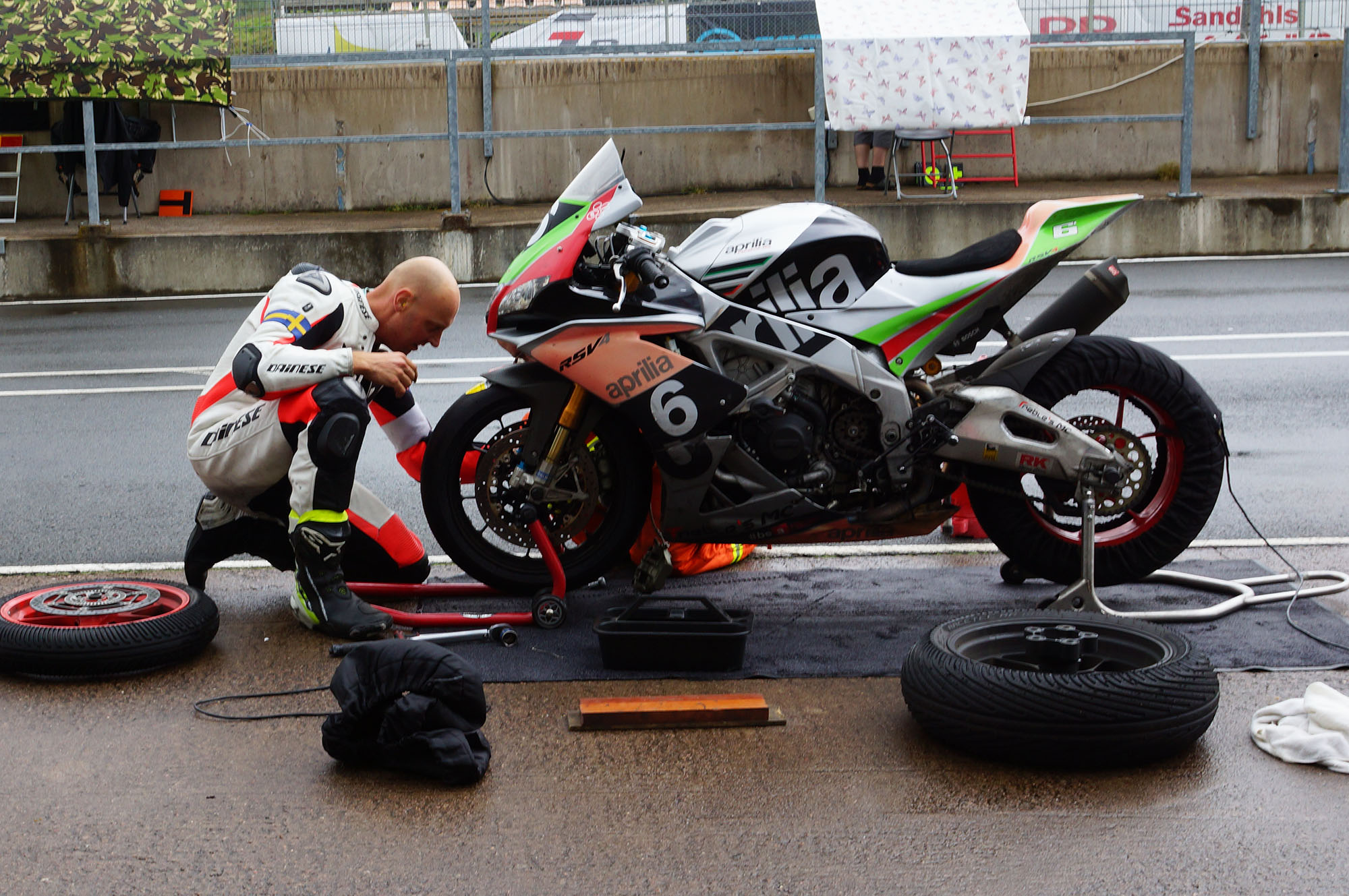 at vi skal skifte hjul til regndæk. Jeg kører videre på slicksdækken. Det er