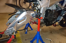 på de faste fodpinde og få baghjul af så at jeg kunne afmontere bagdæmper og forlænge den 4 mm.