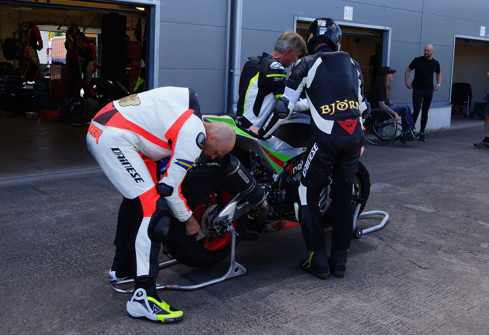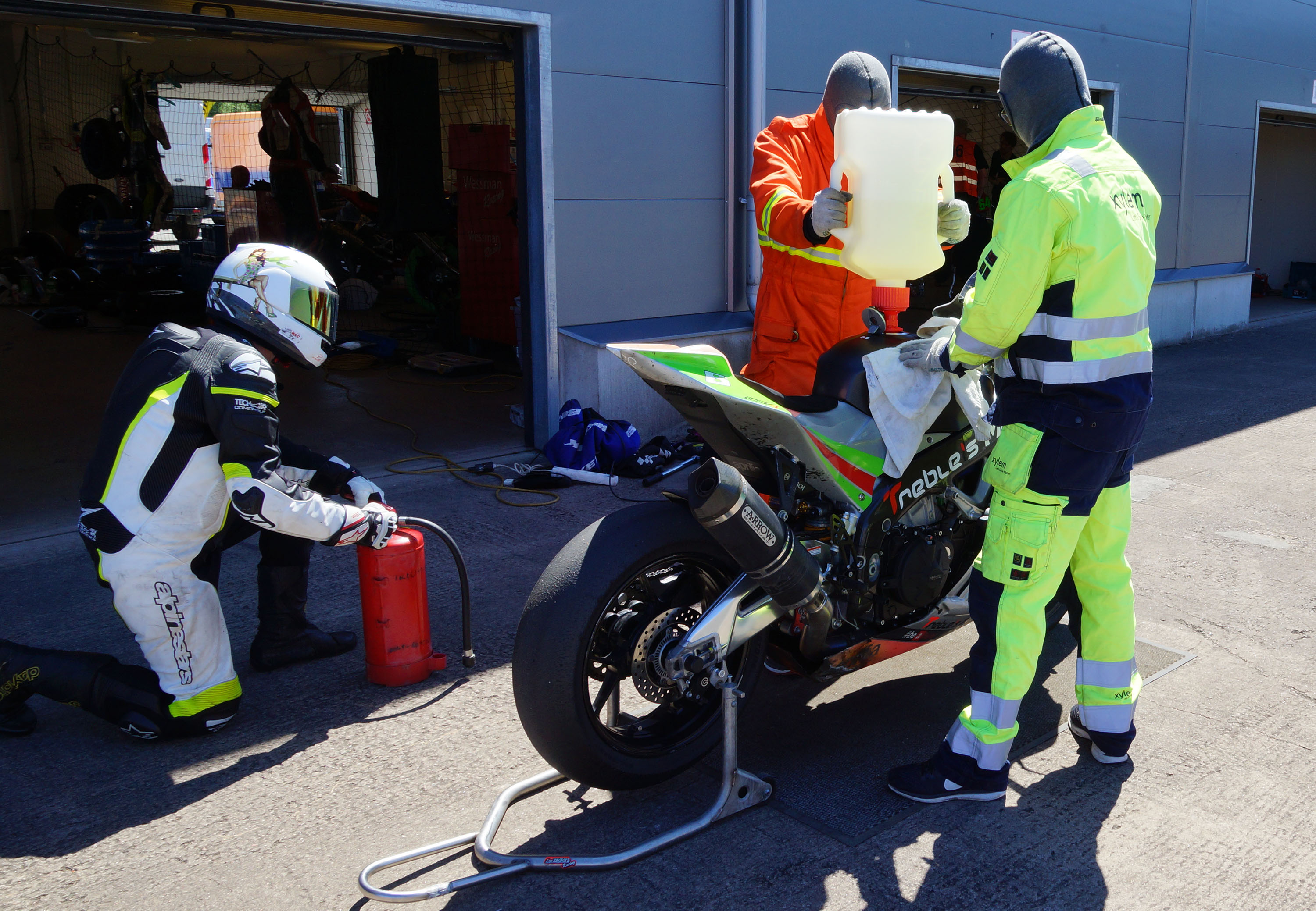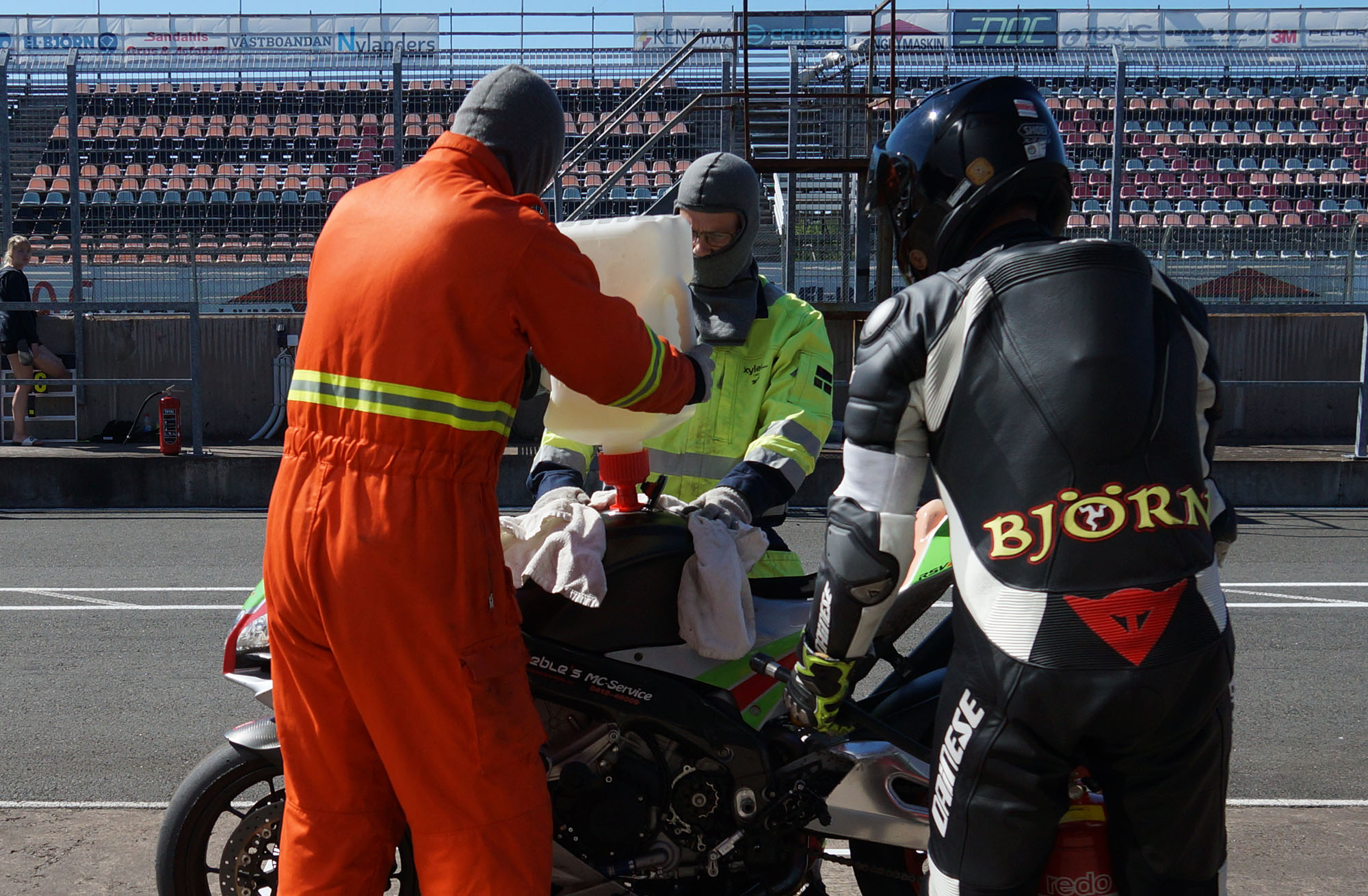 Inde i pit tanker vi op, og jeg skifter baghjul så at den næste kører - Björn - kommer