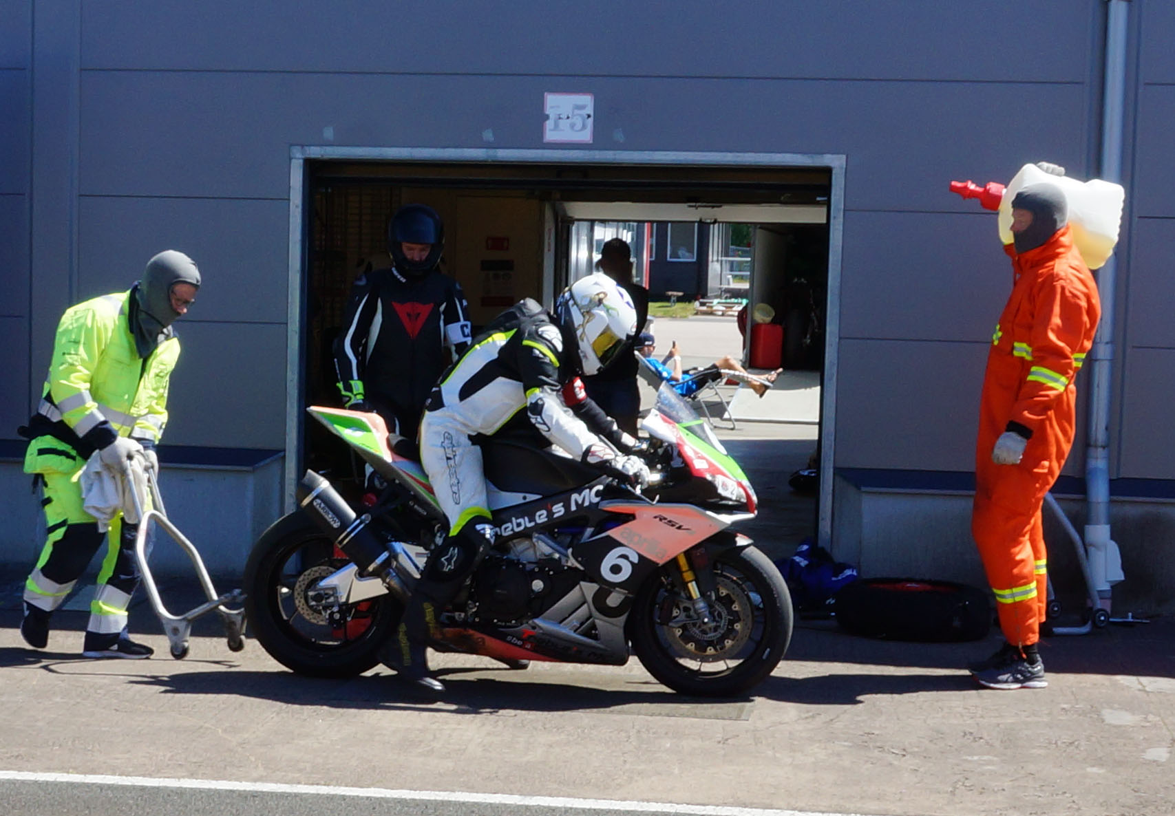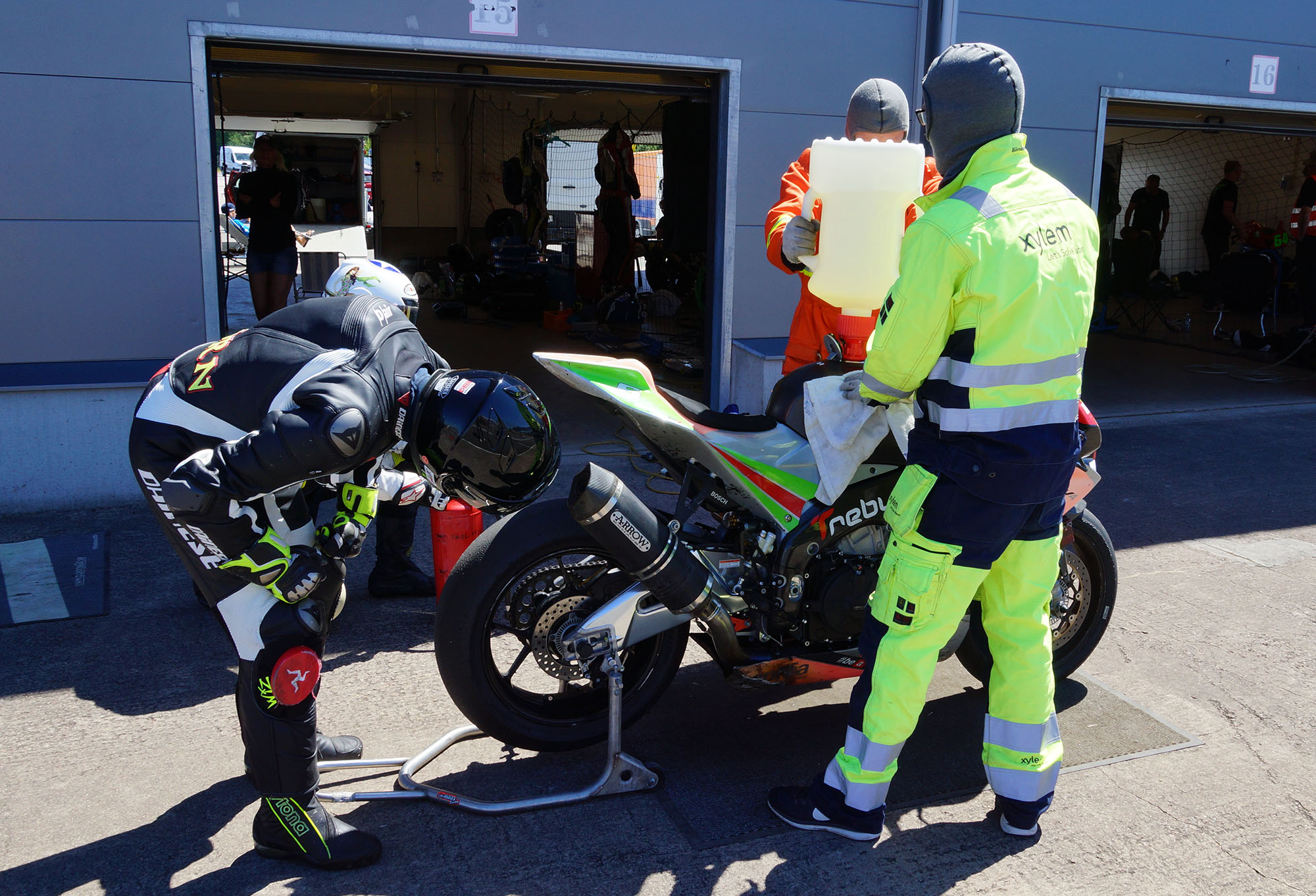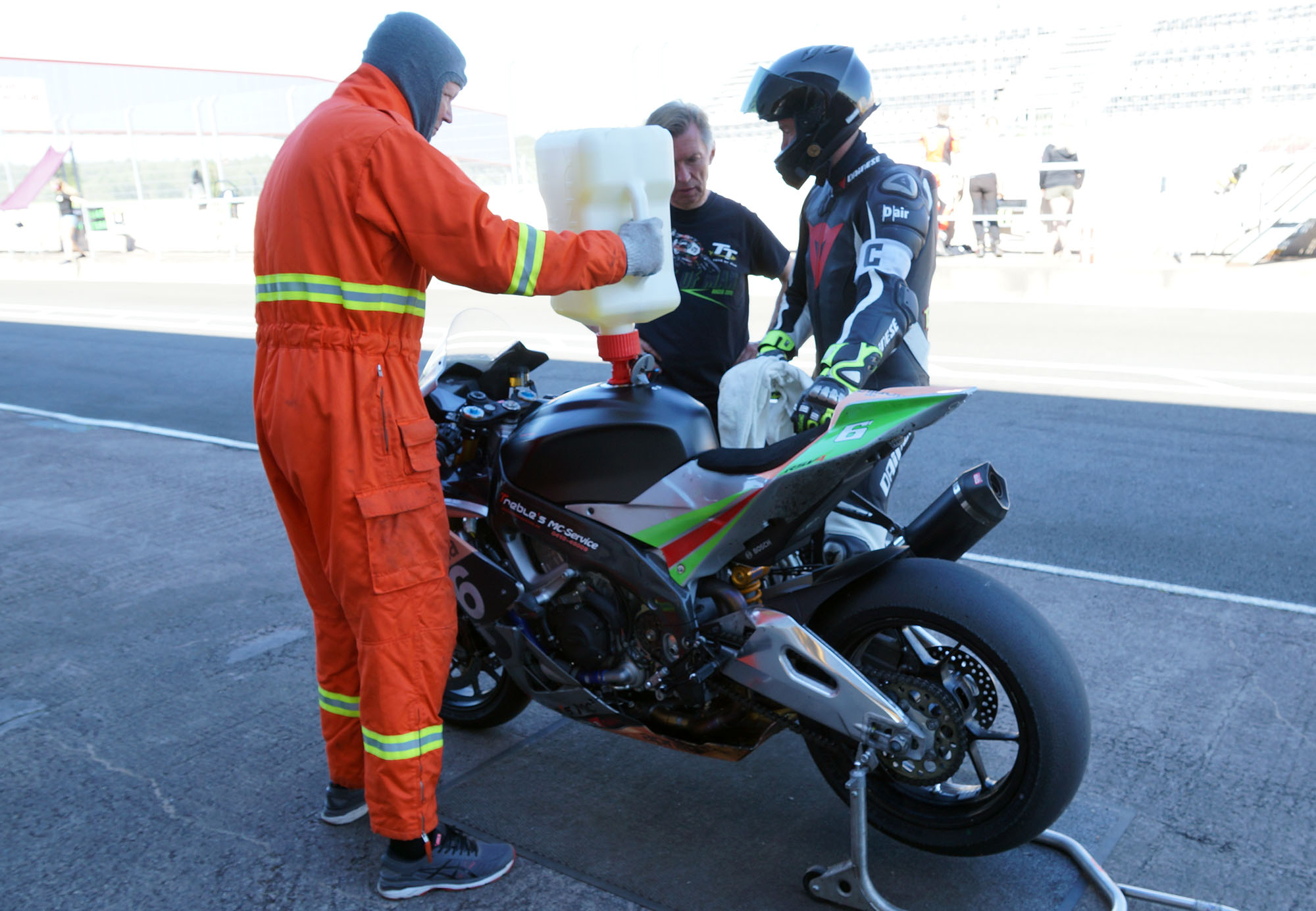 Inde i pit tanker vi op, og jeg skifter baghjul så at den næste kører - Björn - kommer