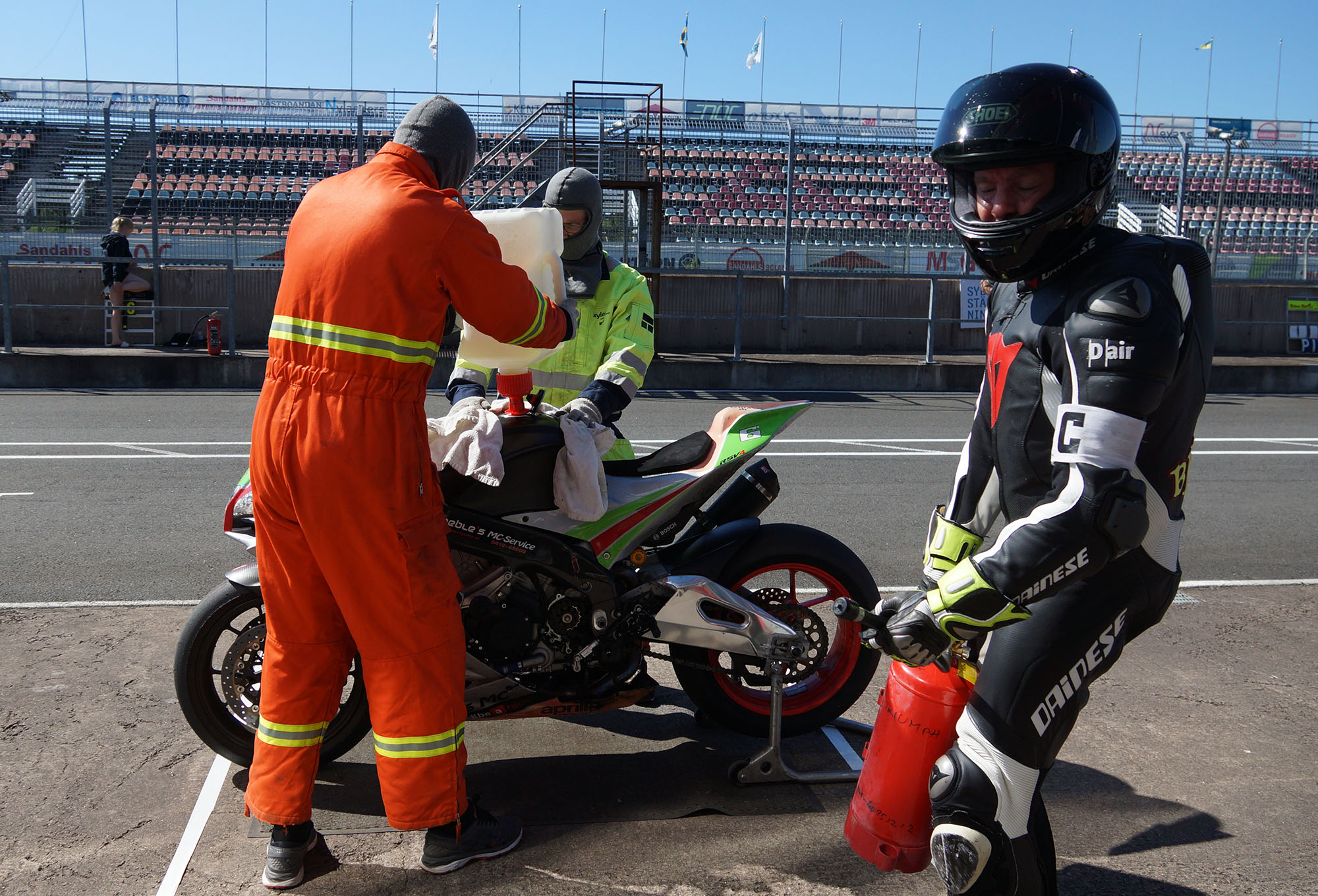 hopper jeg af og passer brandslukker mens de andre tanker motorcykeln. Vi chekker