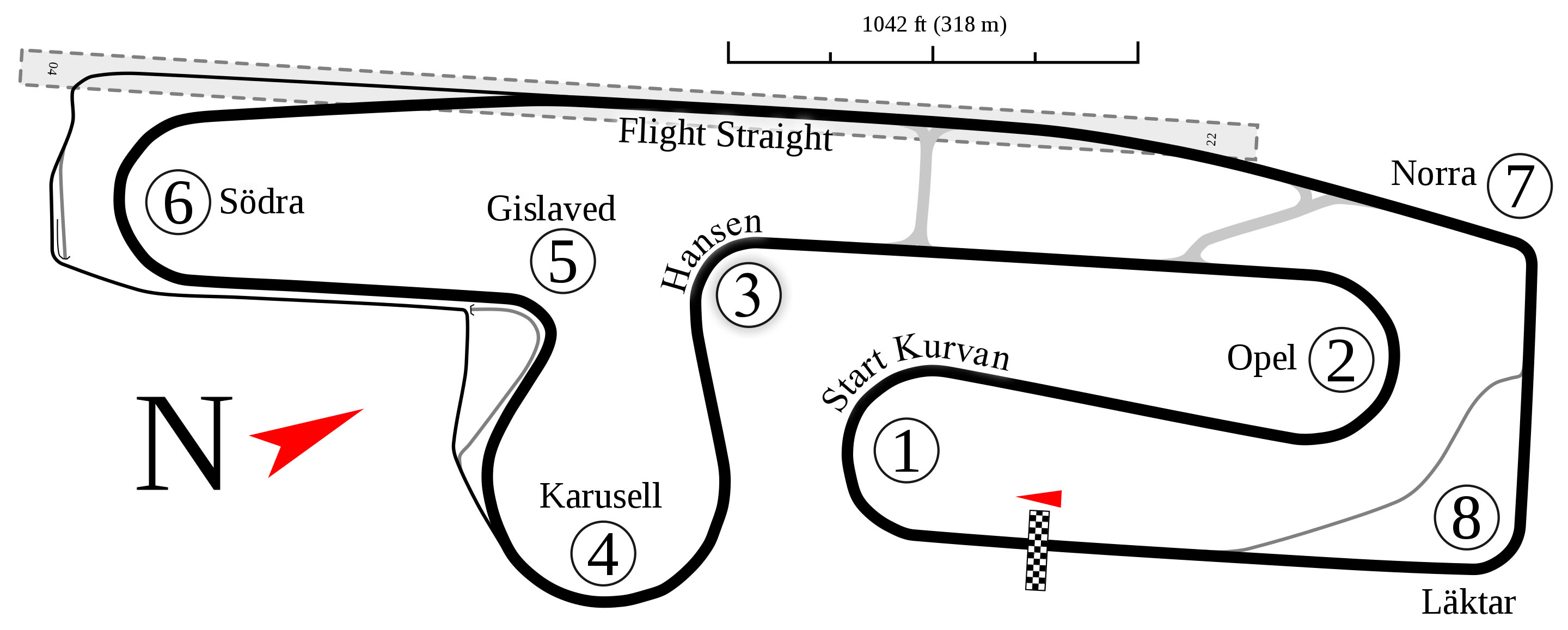 der er 1100 meter lang og hvor vi kan komme op på omkring 310 km/h før vi bremser ned til højresvinget.