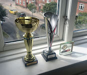 Nu har jeg to pokaler og de skal ikke slippes. Efter prisoverrækkelsen så går vi ned fra podiet