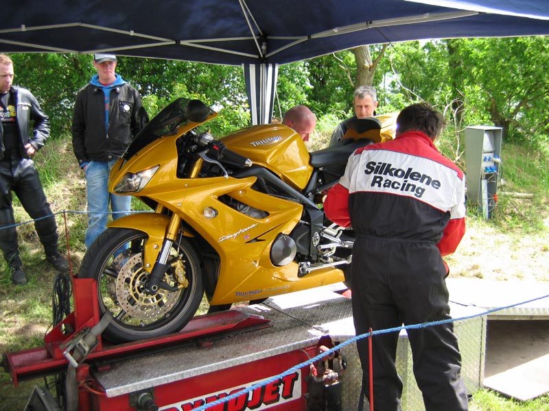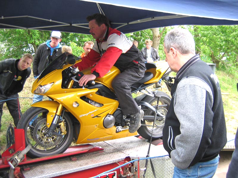 Testbænken skal prøves mener HJ og Karl. Daytona 675 kommer op og får en tur. Det viser
